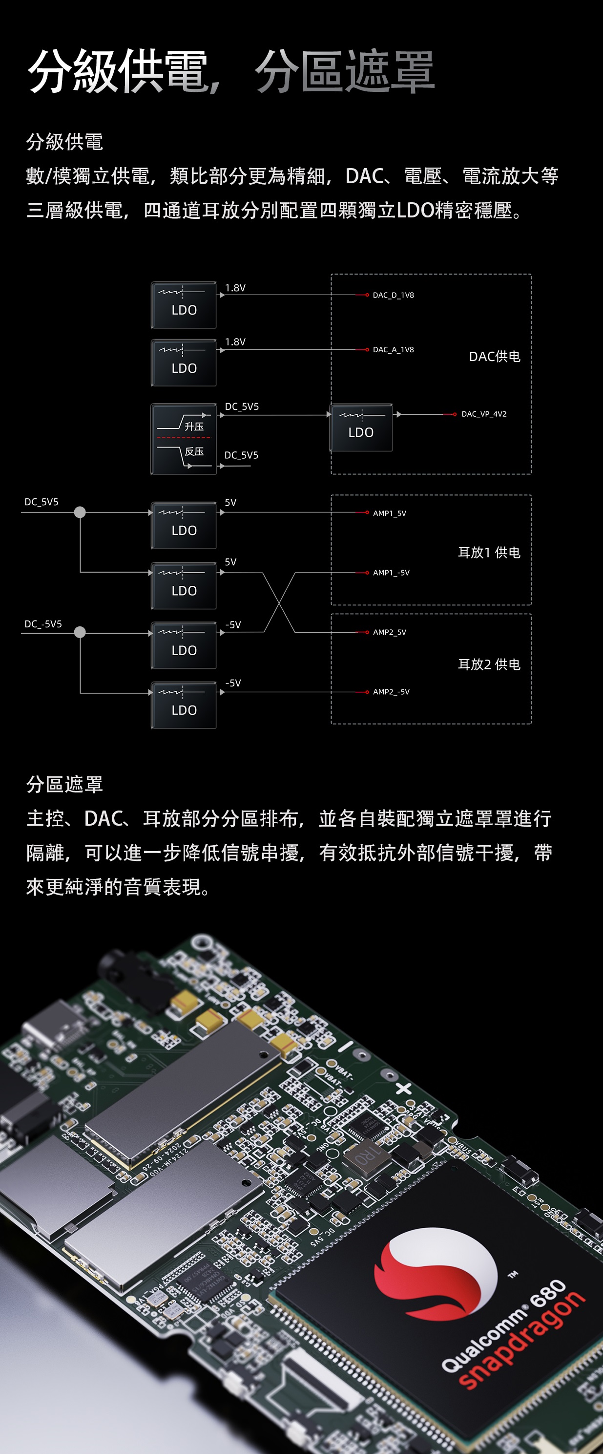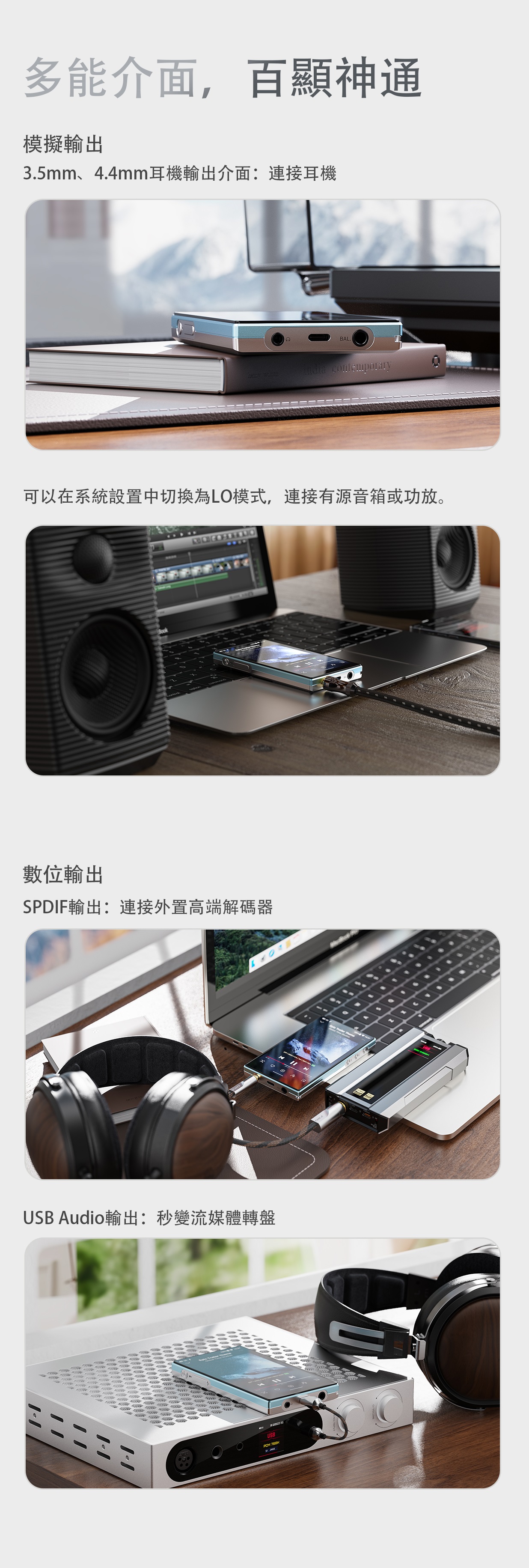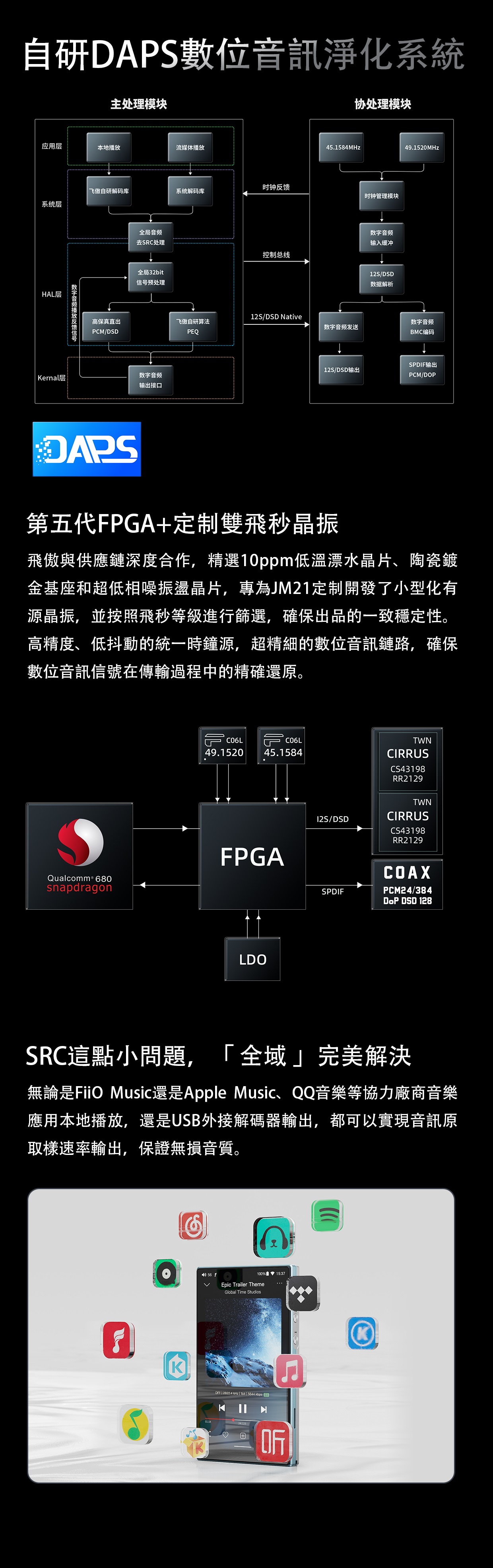 【新增容量】 【新世代 ~ 入門價格,旗艦主控 ~ FiiO JM21 (4+64GB)】 FiiO JM21 (4+64gb) (便攜高清無損音樂播放機) 顏色:天藍色/ 黑色 建議零售價: HK$1499 特點: 1. 全新八核6nm驍龍680 2. 全平衡音訊架構 3. 雙CS43198 + 雙運放 4. 定制雙飛秒音訊晶振 5. 700mW + 700mW推力 6. 13mm超薄機身 7. 4.7英寸高清螢幕 8. 12.5h超長續航 9. Android13 開放式系統 10. 自研DAPS系統全域無SRC 11. 4.4mm + 3.5mm耳機輸出介面 12. 支援SPDIF/USB/LO擴展輸出 ==================== 1. 入門價格,旗艦主控 跨越同級產品的全新處理器 —— 高通驍龍680,6nm先進工藝制程,8核Kryo™ 265架構,主頻頻率高達2.4GHz,性能躍升,功耗大降,操控絲滑流暢。 6nm工藝制程 2.4GHz主頻頻率高達 2. 澎湃入耳 700mW強悍推力 在厚度僅有13mm的超薄機身中,通過發燒級的電路佈局與調校,JM21的平衡輸出功率高達700mW+700mW,如此澎湃推力,與聲俱來,驅動耳塞或大耳都能更從容。 3. 三種增益,三條曲線 擁有低、中、高三種獨立增益,每種增益分別對應獨立的音量曲線,可以提升不同阻抗耳機的聽音體驗,進一步適配各類耳塞或頭戴大耳。 4. 雙旗艦DAC CS43198 全平衡音訊架構 由兩顆Cirrus Logic旗艦DAC CS43198搭配兩顆高性能運放SGM8262,組成全平衡音訊架構。歷經多款產品的沉澱進化,進一步優化分級供電和前後級增益,呈現出更加寬廣的動態,更加潤澤的樂感。 5. 分級供電,分區遮罩 分級供電 數/模獨立供電,類比部分更為精細,DAC、電壓、電流放大等三層級供電,四通道耳放分別配置四顆獨立LDO精密穩壓。 分區遮罩 主控、DAC、耳放部分分區排布,並各自裝配獨立遮罩罩進行隔離,可以進一步降低信號串擾,有效抵抗外部信號干擾,帶來更純淨的音質表現。 6. 流暢絲滑 定制Android13開放式系統 深度定制的Android 13開放式系統,流暢絲滑,操控自如,可以自由安裝各大流媒體APP或者其他應用。 7. 自研DAPS數位音訊淨化系統 第五代FPGA+定制雙飛秒晶振 FiiO 與供應鏈深度合作,精選10ppm低溫漂水晶片、陶瓷鍍金基座和超低相噪振盪晶片,專為JM21定制開發了小型化有源晶振,並按照飛秒等級進行篩選,確保出品的一致穩定性。高精度、低抖動的統一時鐘源,超精細的數位音訊鏈路,確保數位音訊信號在傳輸過程中的精確還原。 SRC這點小問題,「 全域 」完美解決 無論是FiiO Music還是Apple Music、QQ音樂等協力廠商音樂應用本地播放,還是USB外接解碼器輸出,都可以實現音訊原取樣速率輸出,保證無損音質。 8. 超輕薄機身 流淌在指尖間的旋律 煥然一新的天藍色撞色設計,輕巧一手握的舒適握感,徹底解放小拇指;還配備了4.7英寸高清螢幕,指尖輕輕滑過,旋律如細流般流淌,細膩而悠揚。 9. 告別續航焦慮 12.5小時超長續航 超長續航為隨時隨地的聆聽持續保駕護航,近乎能應對從早到晚的連續聆聽,每一次聆聽都是愉悅的享受,無需擔心電量問題。 *資料來自FiiO 實驗室,請以實際使用為准。實際情況會因測試環境和測試條件等不同略有差異。 10. 藍牙也很HiFi 雙向LDAC藍牙連接 支援雙向藍牙5.0發射、接收功能,可以提供穩定的藍牙傳輸,無線聆聽,也可以HiFi起來。 藍牙發射:SBC/AAC/aptX/aptX HD/LHDC/LDAC 藍牙接收:SBC/AAC/LDAC 11. 非同步USB DAC 支持384kHz/32bit 連接MacOS或者Windows系統電腦充當解碼,可以大幅提升音質體驗,取樣速率至高支持到384kHz/32bit。 *USB DAC模式專為音訊開發設計,延遲稍高,不建議在該模式下觀看視頻。 12. 多能介面,百顯神通 模擬輸出 3.5mm、4.4mm耳機輸出介面:連接耳機 可以在系統設置中切換為LO模式,連接有源音箱或功放。 數位輸出 SPDIF輸出:連接外置高端解碼器 USB Audio輸出:秒變流媒體轉盤 包裝清單: ①---------------------------JM21主機*1 ②---------------------------PET保護膜(出廠已貼機器上)*1 ③---------------------------清水套*1 ④---------------------------USB線*1 ⑤---------------------------快速入門指南*1 ⑥---------------------------售後維修卡*1 基本規格參數: 顏色:天藍色 材質:鋁合金+塑膠 尺寸:約120.7x68x13mm 重量:約156g(不含清水套) 主控:高通驍龍680 存儲:4G RAM + 64G ROM(可用52G ROM) 存儲卡擴展:標準TF卡槽,至高支援2TB 系統:Android13 工作模式:安卓模式/純音模式/USB DAC模式/藍牙接收模式 WiFi:2.4GHz/5GHz,支持DLNA、AirPlay、WiFi傳歌等 DAC晶片:CS43198*2 運放:SGM8262*2 屏幕:4.7 英寸高清屏幕(750*1334) 輸出介面:單端3.5mm PO/SPDIF + 平衡4.4mm USB介面:Type-C USB2.0數據/充電/USB Audio 藍牙版本:5.0 藍牙發射:SBC/AAC/aptX/aptX HD/LHDC/LDAC 藍牙接收:SBC/AAC/LDAC 本機解碼:384kHz/32bit;DSD256(Native) USB DAC:384kHz/32bit;DSD256(Native) USB Audio:768kHz/32bit;DSD512(支持DoP/D2P/Native) 同軸輸出:384kHz/24bit;DSD128(D2P/DOP) 輸出功率1:L+R≥245mW+245mW(32Ω/THD+N<1%/單端) 輸出功率2:L+R≥700mW+700mW(32Ω/THD+N<1%/平衡) 信噪比:≥130dB 底噪:<1.5μV 輸出阻抗:<1Ω THD+N:<0.0006% 電池:2400mAh 續航:單端12.5h,平衡9.5h 充電時間:約2小時(5V2A充電)