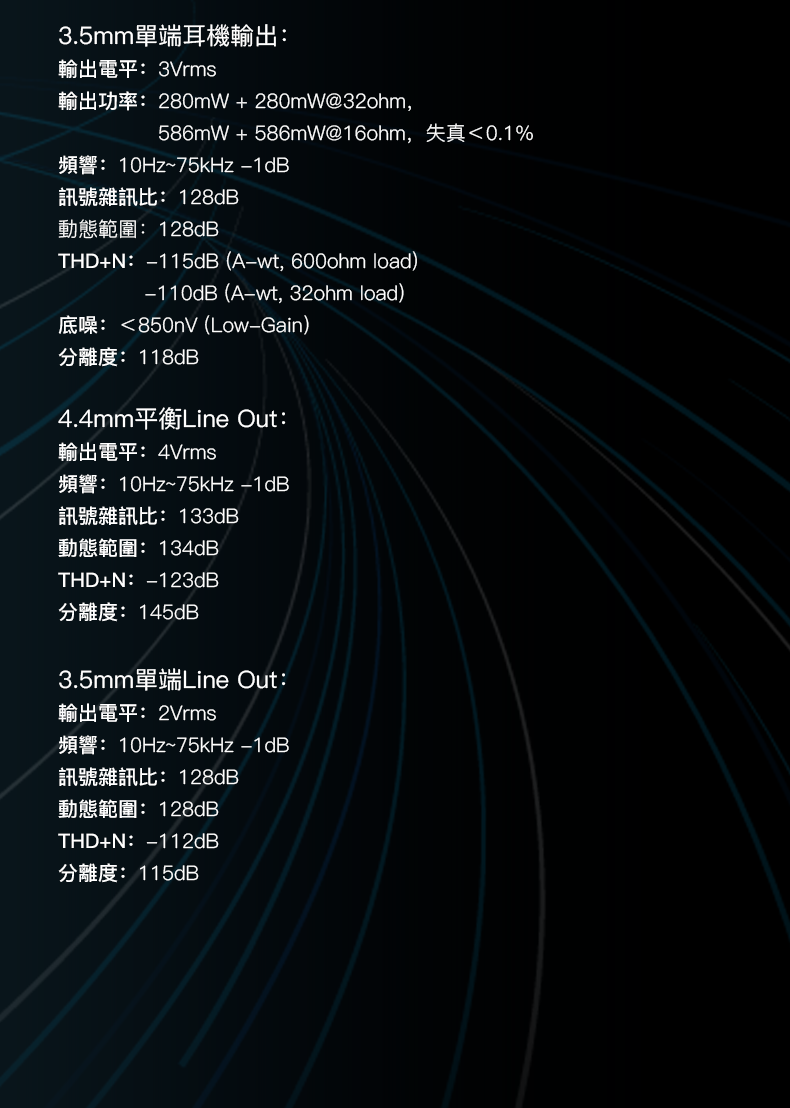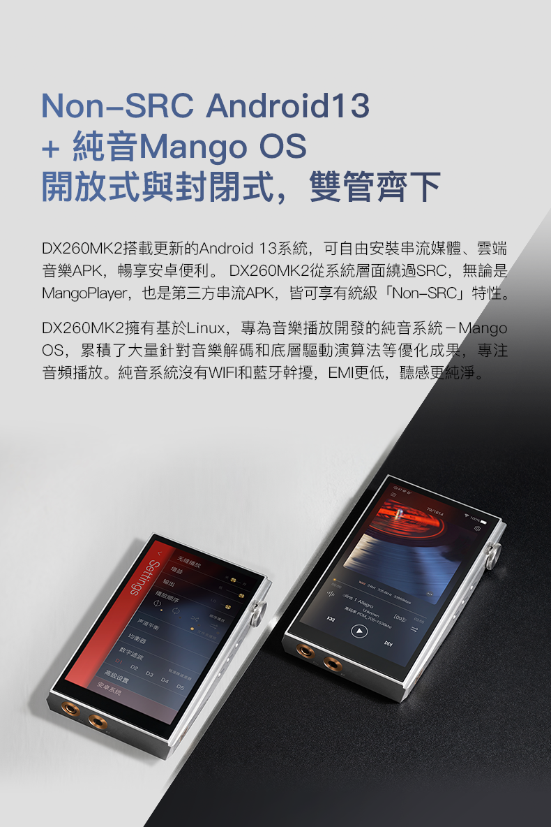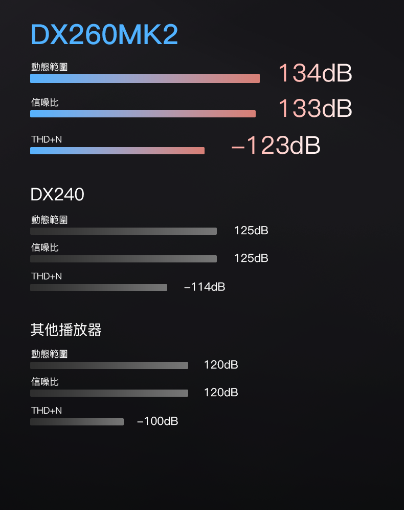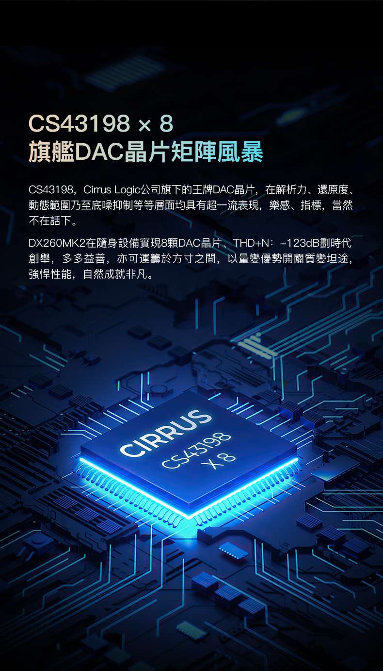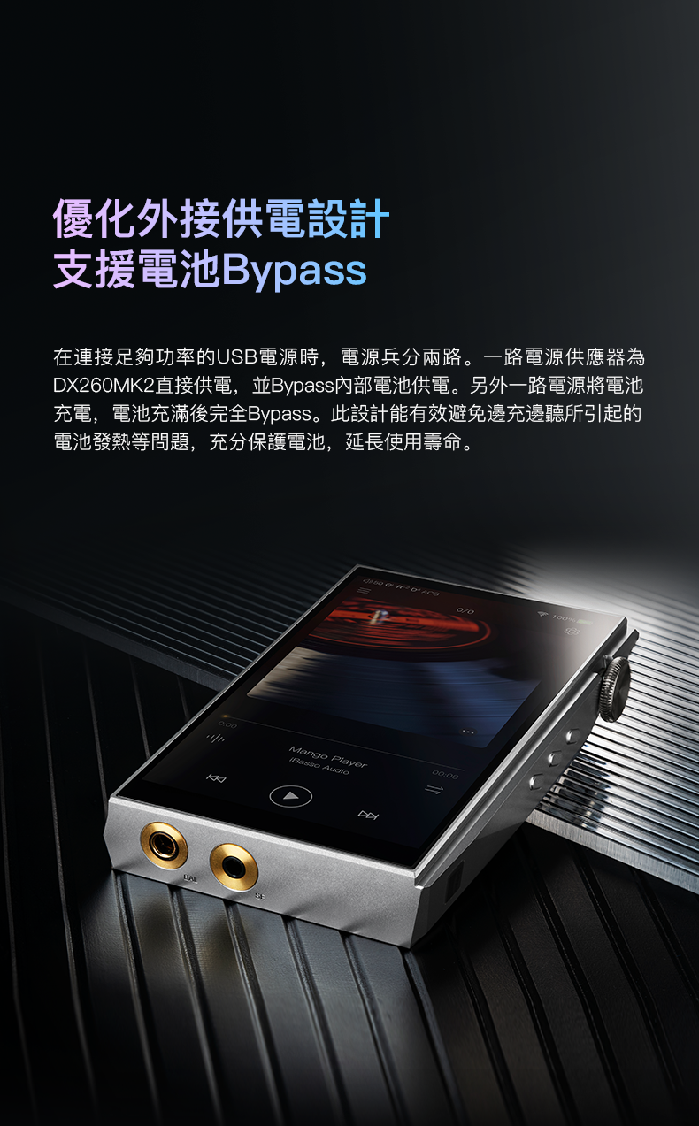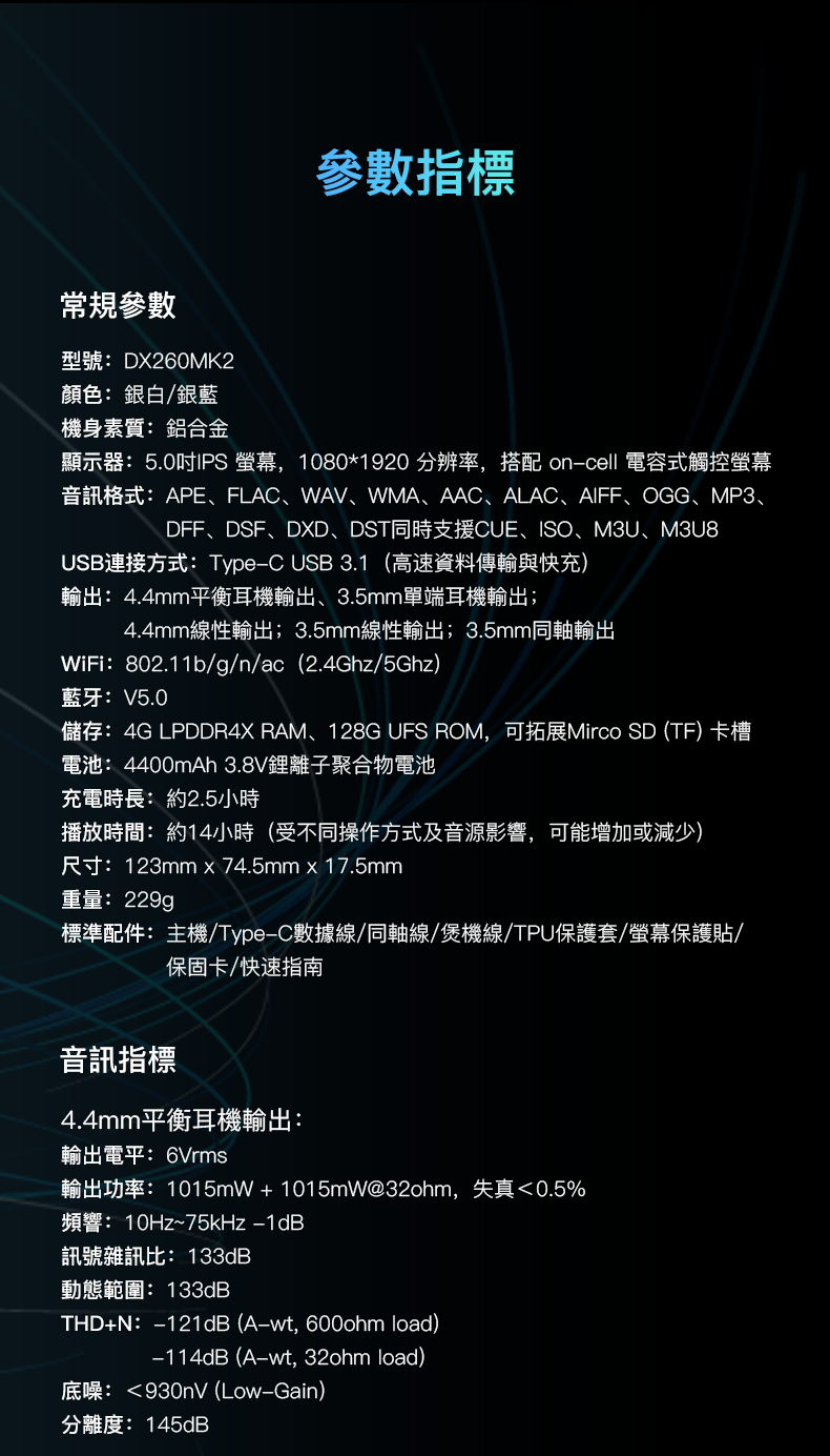 【二代目新成員,全新優惠 ~ 威陣八方 ~ 匠心MOD改 ~ iBasso DX260MK2 MOD (全球限量400台)】 iBasso DX260MK2 顏色: 1. DX260MK2 銀白 (限量版) 2. DX260MK2 銀藍 3. DX260MK2 MOD銀灰 (全球限量400台,免費贈送HK$399專用真皮皮套) 建議零售價: HK$7999 全新優惠價: HK$6499 iBasso DX260MK2 MOD: 匠心升級 | DX260MK2 Mod機版 ~ 科學調校的音訊電容矩陣 在DX260MK2 Mod機版的狹小機腔內,我們用心和理論寄出完成了一場聲學革命 ~ 將專業級補品音訊電容以最優佈局深度集成,每一顆電容的選擇都經過工程師團隊大量的聽音測試與資料驗證! 不同於市面上 "盲焊堆料" 的協力廠商改裝(動輒千元卻只做表面文章),我們的升級方案: ✅ 科學配比:根據電路設計,讓每顆元件都發揮最佳聲學效能 ✅ 空間魔術:最大化利用機內閒置空間,在不破壞原結構的前提下實現"零妥協"擴容 ✅ 聽覺進化:最終呈現的聲底更飽滿豐沛,細節如絲綢般順滑延展,低頻凝聚有彈性,人聲情感表達直擊心靈 MOD電容矩陣: iBasso定制薄膜軸向電容 美國 Mallory 薄膜軸向電容 Nichicon HE 22uf 電解電容 德國西門子 22uf 電解電容 ELNA紫袍 33uf 電解電容 松下 3.3uf 無極電解電容 Lelon 22uf 無極電解電容 特點: 1. CS43198 x 8 ~ 旗艦DAC矩陣 2. 高通驍龍665 SoC ~ 11nm制程工藝 3. 4G LPDDR4X + 128G UFS 4. FPGA-Master 2.0 ~ 獨立音訊主控 5. PCM 32bit/768kHz ~ 硬解DSD512 6. SHARP夏普5英寸IPS on cell全面屏 7. QC3.0、PD3.0雙快充協議 8. 兩顆NDK飛秒晶振 ~ 低於一萬億分之一秒 9. FIR 2x / FIR 4x ~ 硬體類比濾波器 10. 低延時USB-DAC ~ USB 3.1高速傳輸 11. 1015mW + 1015mW@32Ω 12. THD+N:-123dB ~ 動態範圍:134dB 13. 同軸輸出支援24bit/384kHz ~ DOP DSD 128 14. 2.4G / 5G WiFi ~ 藍牙5.0 15. Android13 ~ Mango OS雙系統 16. 納伏級底噪 ~ 低至760nV ==================== 1. CS43198 × 8 旗艦DAC晶片矩陣風暴 CS43198,Cirrus Logic公司旗下的王牌DAC晶片,在解析力、還原度、動態範圍乃至底噪抑制等等層面均具有超一流表現,樂感、指標,當然不在話下。 DX260MK2在可攜式裝置實現8顆DAC晶片、THD+N:-123dB劃時代創舉,多多益善,亦可運籌於方寸之間,以量變優勢開闢質變坦途,強悍性能,自然成就非凡。 2. 自研FPGA-MASTER 2.0 新一代獨立音訊主控 歷經數年自研演算法積澱,FPGA-Master正式跨入2.0版本, 其作為音訊主控,直接從SoC請求音訊資料, 負責信號重組,同時同步生成全域音訊時鐘。 配合NDK飛秒晶振,打造全同步單一時鐘源, 在皮秒內精准操制每顆DAC,實現FIR輸出, 呈現至臻純淨的音訊體驗。 3. 三大輸出模式加持 成就DAC矩陣魔法師 得益於FPGA-MASTER2.0新演算法,進一步深挖8顆CS43198潛能。 同步並聯輸出模式: 降低多個DAC之間的“隨機離散失真”以提升性能。 2 × FIR模式、4 × FIR模式: 通過FPGA-MASTER 2.0技術,實現對DAC時鐘和資料進行皮秒級精確控制和調整,讓每一路DAC資料都實現獨立可調。通過4顆DAC“分時並聯”形式,讓4顆DAC構成一個硬體類比FIR濾波器,平均化多個DAC之間的差異,降低失真,有效提高聲音細節和密度。 4. 實測性能一鳴驚人 睥睨群雄萬馬難追 DX240 動態範圍:125 dB 信噪比:125 dB THD+N:-114dB DX260MK2 動態範圍:134 dB 信噪比:133 dB THD+N:-123dB 其他播放機 動態範圍:120 dB 信噪比:120dB THD+N:-100dB 5. 高通驍龍665,4G RAM+128G ROM 為流暢操作,保駕護航 DX260MK2採用4G LPDDR4X運存及128G UFS存儲, 相比eMMC存儲,UFS的讀寫速度更快,功耗更低, 為軟體運行和資源存儲提供澎湃動力, 在保證軟體運行速度的同時兼顧資料高速讀寫,盡享絲滑體驗。 6. 優化外接供電設計 支援電池Bypass 在連接足夠功率的USB電源時,電源兵分兩路。一路電源為DX260MK2直接供電,並Bypass內部電池供電。另外一路電源對電池進行充電,電池充滿後完全Bypass。該設計能有效避免邊充邊聽引起的電池發熱等問題,充分保護電池,延長使用壽命。 7. 獨立USB接收晶片 實現低延遲USB DAC 支援ASIO/WASAPI輸出 8. Non-SRC Android 13 + 純音Mango OS 開放式與封閉式,雙管齊下 DX260MK2搭載更新的Android 13 系統,可自由安裝流媒體、雲音樂APK,暢享安卓便利。DX260MK2從系統層面繞開SRC,無論是Mango Player,還是協力廠商流媒體APK,均可享受到統級“Non-SRC”特性。 DX260MK2擁有基於Linux,專為音樂播放開發的純音系統——Mango OS,積累了大量針對音樂解碼和底層驅動演算法等優化成果,專注音訊播放。純音系統沒有WIFI和藍牙干擾,EMI更低,聽感更加純淨。 9. 全新UI,內外革新 10. ID煥新,護臂回歸 參數指標: 常規參數: 型號:DX260MK2 顏色:銀白/銀藍 機身材質:鋁合金 顯示幕:5.0寸IPS 螢幕,1080*1920 解析度,搭配 on-cell 電容式觸控式螢幕 音訊格式:APE、FLAC、WAV、WMA、ACC、ALAC、AIFF、OGG、MP3、DFF、DSF、DXD、DST同時支持CUE、ISO、M3U、M3U8 USB連接方式:Type-C USB 3.1(高速資料傳輸和快充) 輸出:4.4mm平衡耳機輸出、3.5mm單端耳機輸出;4.4mm線性輸出;3.5mm線性輸出;3.5mm同軸輸出 WiFi:802.11b/g/n/ac(2.4Ghz/5Ghz) 藍牙:V5.0 存儲:4G LPDDR4X RAM、128G UFS ROM,可拓展Mirco SD(TF) 卡槽 電池:4400mAh 3.8V鋰離子聚合物電池 充電時長:約2.5小時 播放時長:約14小時(受不同操作方式及音源影響,可能有所增加或減少) 尺寸:123mm*74.5mm*17.5mm 重量:229g 標準配件:主機/Type-C資料線/同軸線/煲機線/TPU保護套/螢幕保護裝置膜/保修卡/快速指南 音訊指標: 4.4mm平衡耳機輸出: 輸出電平:6Vrms 輸出功率:1015mW + 1015mW@32ohm,失真<0.5% 頻響:10Hz~75kHz -1dB 信噪比:133dB 動態範圍:133dB THD+N:-121dB (A-wt, 600ohm load) -114dB (A-wt, 32ohm load) 底噪:< 930nV (Low-Gain)