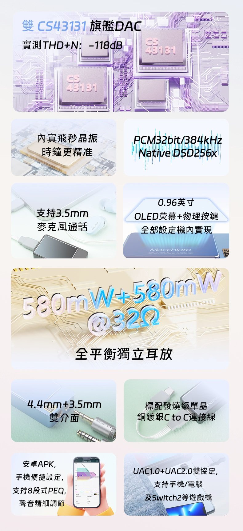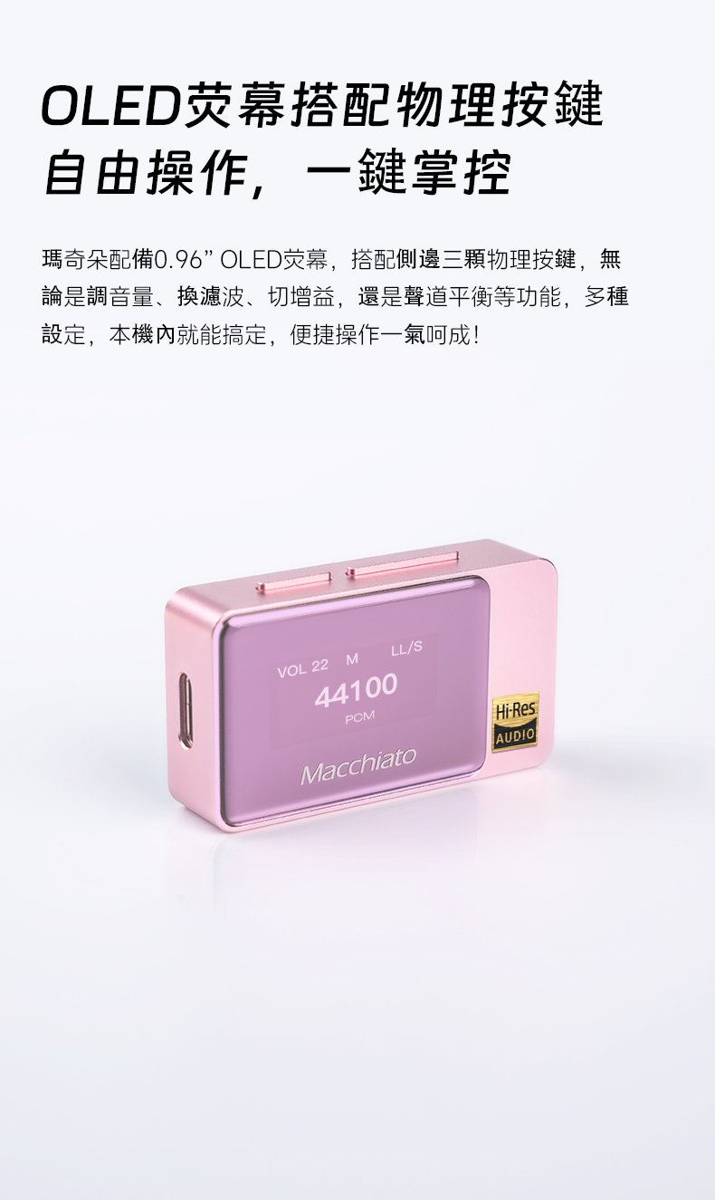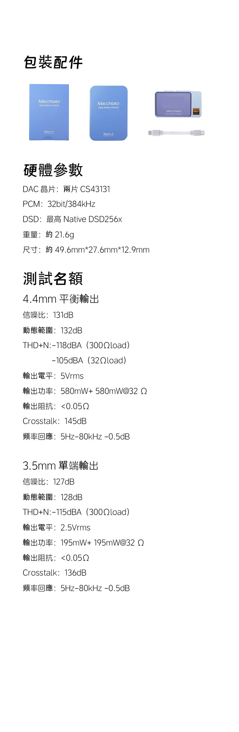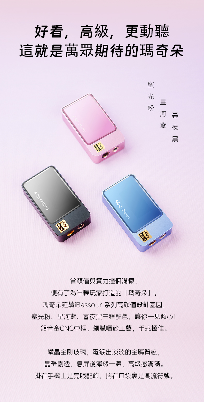 【全平衡獨立耳放 ~ iBasso Jr. Macchiato·瑪奇朵】 #可顏可甜小尾巴 ~ 同級至強音 #手機HiFi音效卡 iBasso Jr. Macchiato·瑪奇朵 顏色: 曜黑丨桃粉丨湖藍 建議零售價: HK$599 特點: 1. 雙CS43131旗艦DAC,實測THD+N:-118dB 2. 580mW + 580mW@32Ω,全平衡獨立耳放 3. 內置飛秒晶振,時鐘更精准 4. PCM32bit/384kHz,Native DSD256x 5. 0.96英寸OLED螢幕+物理按鍵,全部設置機內實現 6. 安卓APK,手機便捷設置,支援8段式PEQ,聲音精細調節 7. 支援麥克風高清通話,開黑無壓力 8. 4.4mm + 3.5mm雙介面 9. 標配發燒級單晶銅鍍銀C to C連接線 10. UAC1.0+UAC2.0雙協定,支援手機/電腦及Switch2等遊戲機 ==================== 1. 手機HiFi音效卡——瑪奇朵 為不滿足TWS音質的你開一扇門 手機HiFi音效卡——瑪奇朵,Type-C介面, 連接手機,隨插即用的HiFi設備。 無論是聆聽音樂、沉浸觀影,還是遊戲開黑, 都能帶來遠超AirPods PRO等旗艦TWS的聲音表現。 如果說TWS的聲音,是十年前充滿顆粒感的720P螢幕, 那瑪奇朵所帶來的,是首次更換到4K超清大屏的震撼! 2. 支援麥克風通話 是聽歌神器,也是開黑利器 瑪奇朵不只是聽歌神器,更是遊戲開黑黨的摯愛。 3.5mm介面支援麥克風高清通話,暢快開麥,溝通無憂! 玩FPS遊戲隊友報點,敵人資訊精准傳遞,快速判斷戰局; 打MOBA遊戲,與隊友戰術交流無延遲,指令傳達更及時。 有了瑪奇朵,聽歌、開黑兩不誤,助你輕鬆連勝! 3. 手機/電腦/遊戲機全平臺適用 還能讓手機化身專業數字轉盤 瑪奇朵是當之無愧的斜杆小尾巴,UAC2.0與UAC1.0協議隨心切換,廣泛相容多設備平臺。3.5mm介面同時支援SPDIF輸出。 UAC2.0模式:可連接iOS、Android等手機平板設備,同時支援Windows、MAC OS及Linux等電腦設備。 配手機或電腦使用 UAC1.0模式:瞬間變身Switch2/PS5等遊戲機的外置音效卡。遊戲配樂從未如此清晰動聽,讓你沉浸於遊戲的快樂時光。 配Switch遊戲機 SPDIF模式:可實現32bit/384kHz數位信號傳輸。通過機內設置或手機UAC軟體切換,接上手機就是專業數位轉盤。 4. 好看,高級,更動聽 這就是萬眾期待的瑪奇朵 當顏值與實力撞個滿懷, 便有了為年輕玩家打造的「瑪奇朵」。 瑪奇朵延續iBasso Jr. 系列高顏值設計基因, 蜜光粉、星河藍、暮夜黑三種配色,讓你一見傾心! 鋁合金CNC中框,細膩噴砂工藝,手感極佳。 鑽晶金剛玻璃,電鍍出淡淡的金屬質感, 晶瑩剔透,息屏後渾然一體,高級感滿滿。 掛在手機上是亮眼配飾,揣在口袋裡是潮流符號, 聽歌時不僅有好音質,更有高顏值加持! 5. OLED螢幕搭配物理按鍵 自由操作,一鍵掌控 瑪奇朵配備0.96”OLED 螢幕,搭配側邊三顆物理按鍵, 無論是調音量、換濾波、切增益,還是聲道平衡等功能, 多種設置,本機內就能搞定,便捷操作一氣呵成! 6. 介面精美操作便捷的APK 加入全新的8段式PEQ 瑪奇朵有安卓APK軟體加持,支援所有功能設置。 瑪奇朵採用發燒級DSP晶片,內置8種EQ預設, 每種均支援單獨配置和使用,滿足更多的聽音喜好。 通過iBasso UAC軟體,可實現8段PEQ細緻調音。 無論喜歡怎樣的聲音風格,都可以私人訂制! 100級 硬體音量調節 5種 數位濾波 3檔 高中低增益 20級 聲道平衡調節 3種 DRE模式選擇 8段 PEQ自由調節 2種 動態/靜態主題 2種 UAC1.0/2.0協議 7. 雙CS43131旗艦DAC+飛秒晶振 出彩配置,遇上高分調音 瑪奇朵搭載雙CS43131旗艦 DAC,調音爐火純青。 同時配備飛秒晶振,重塑數位時鐘,降低抖動與失真。 無論流行樂中細膩的人聲,還是古典樂裡豐富的樂器層次, 都能精准的還原,聲音既有豐富細節,又不乏音樂素養。 每一個音符都如同錄音棚裡走出,鮮活又動人, 細節纖毫畢現地呈現在耳邊,讓你仿佛置身現場! 8. 大推力,納伏級底噪以及低功耗 傳說中的不可能三角被輕鬆征服 瑪奇朵採用四通道全平衡獨立外置耳放, 擁有580mW+580mW@32Ω強悍推力, 打破同級別級小尾巴的推力局限。 讓手中的大耳和入耳式耳機,釋放全部潛力。 與此同時,瑪奇朵底噪依然低至納伏級, 不管是什麼類型的耳機,都聽不到任何底噪。 瑪奇朵的功耗控制同樣出眾, 完全無懼iPhone外接設備的電流限制, 連接iPhone也能長久使用,續航無壓力。 9. 雙介面 | 可換線 標配單晶銅鍍銀C to C連接線 4.4mm平衡口深挖耳機潛力,帶來優異的聲道分離; 3.5mm單埠韻味十足,給你更出色的流行樂聽感。 可換線設計,標配高純度C to C單晶銅鍍銀連接線, 減少信號傳輸損耗,到手就有好聲音! 硬體參數: DAC晶片:兩片CS43131 PCM:32bit/384kHz DSD:最高Native DSD256x 重量:約21.6g 尺寸:約49.6mm*27.6mm*12.9mm 測試指標: 4.4mm平衡輸出 信噪比:131dB 動態範圍:132dB THD+N:-118dBA(300Ω load) -105dBA(32Ω load) 輸出電平:5Vrms 輸出功率:580mW+580mW@32Ω 輸出阻抗:<0.05Ω Crosstalk:145dB 頻率回應:5Hz-80kHz -0.5dB 3.5mm單端輸出 信噪比:127dB 動態範圍:128dB THD+N:-115dBA(300Ω load) 輸出電平:2.5Vrms 輸出功率:195mW+195mW@32Ω 輸出阻抗:<0.05Ω Crosstalk:136dB 頻率回應:5Hz-80kHz -0.5dB