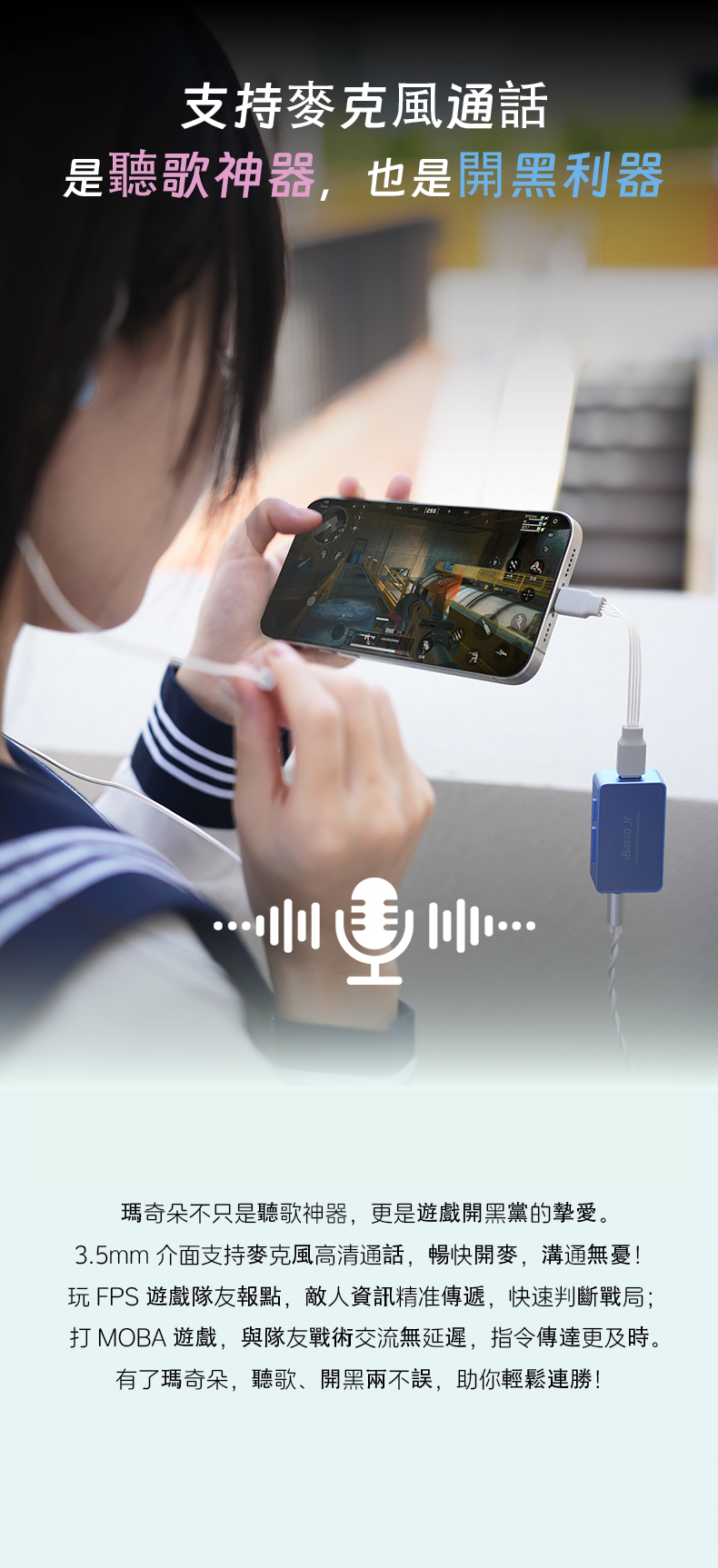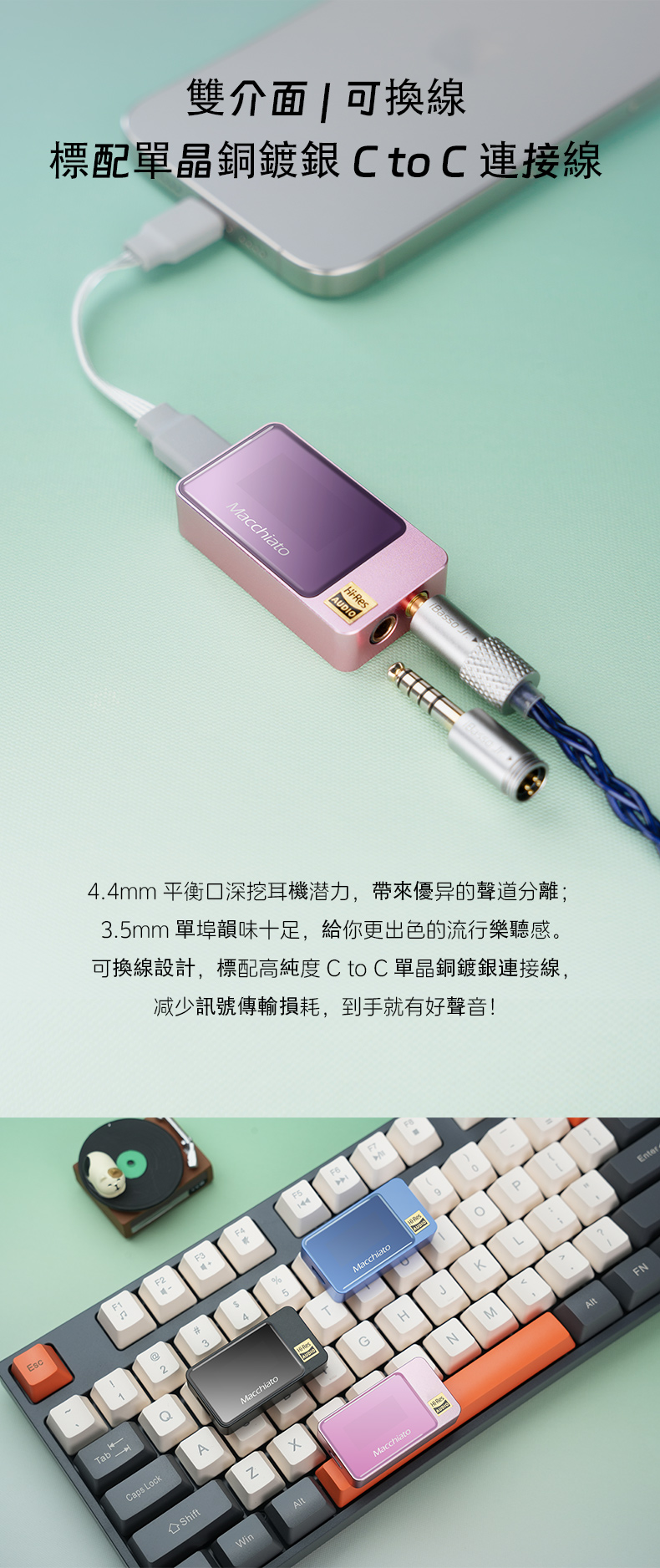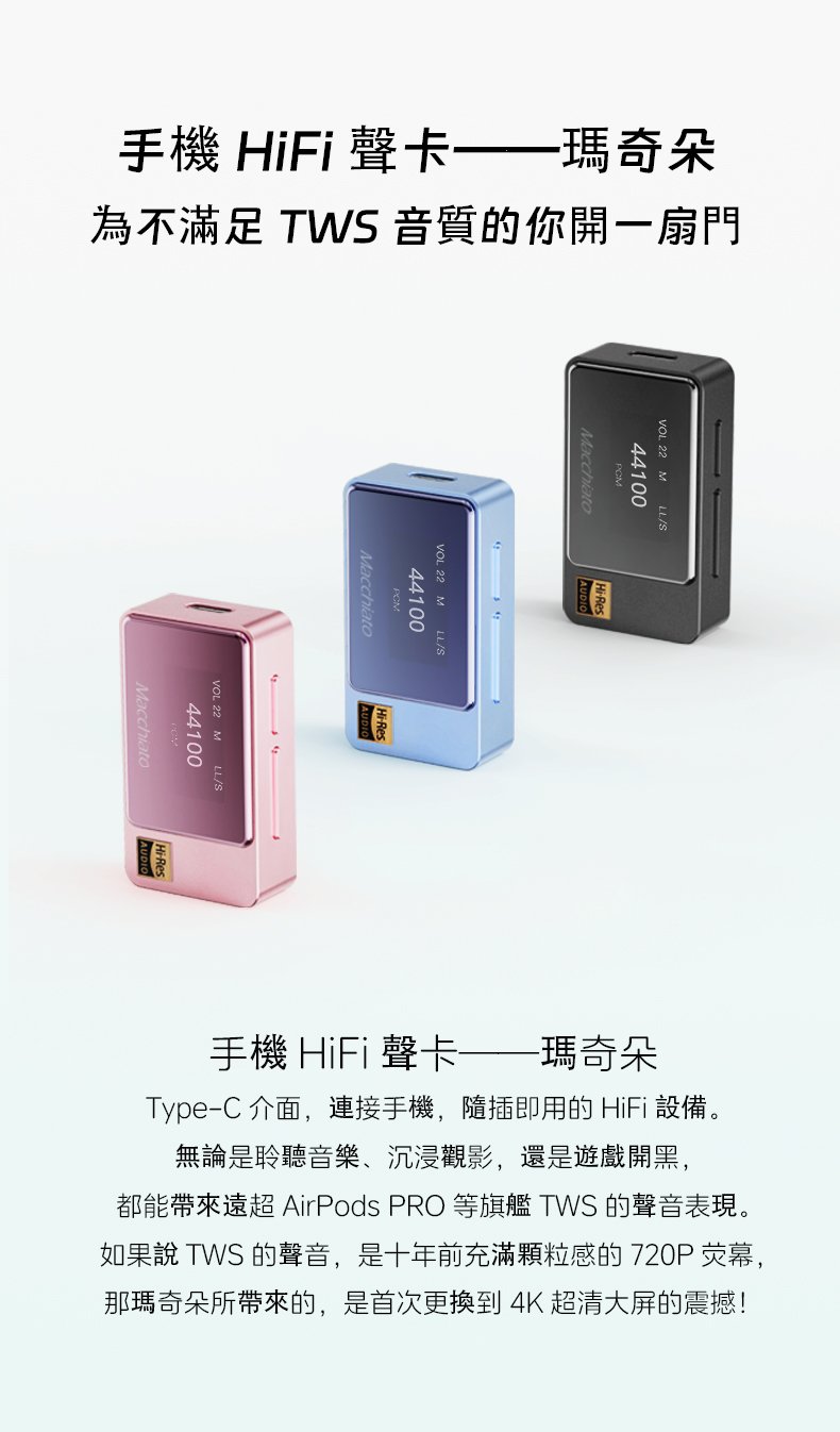 【全平衡獨立耳放 ~ iBasso Jr. Macchiato·瑪奇朵】 #可顏可甜小尾巴 ~ 同級至強音 #手機HiFi音效卡 iBasso Jr. Macchiato·瑪奇朵 顏色: 曜黑丨桃粉丨湖藍 建議零售價: HK$599 特點: 1. 雙CS43131旗艦DAC,實測THD+N:-118dB 2. 580mW + 580mW@32Ω,全平衡獨立耳放 3. 內置飛秒晶振,時鐘更精准 4. PCM32bit/384kHz,Native DSD256x 5. 0.96英寸OLED螢幕+物理按鍵,全部設置機內實現 6. 安卓APK,手機便捷設置,支援8段式PEQ,聲音精細調節 7. 支援麥克風高清通話,開黑無壓力 8. 4.4mm + 3.5mm雙介面 9. 標配發燒級單晶銅鍍銀C to C連接線 10. UAC1.0+UAC2.0雙協定,支援手機/電腦及Switch2等遊戲機 ==================== 1. 手機HiFi音效卡——瑪奇朵 為不滿足TWS音質的你開一扇門 手機HiFi音效卡——瑪奇朵,Type-C介面, 連接手機,隨插即用的HiFi設備。 無論是聆聽音樂、沉浸觀影,還是遊戲開黑, 都能帶來遠超AirPods PRO等旗艦TWS的聲音表現。 如果說TWS的聲音,是十年前充滿顆粒感的720P螢幕, 那瑪奇朵所帶來的,是首次更換到4K超清大屏的震撼! 2. 支援麥克風通話 是聽歌神器,也是開黑利器 瑪奇朵不只是聽歌神器,更是遊戲開黑黨的摯愛。 3.5mm介面支援麥克風高清通話,暢快開麥,溝通無憂! 玩FPS遊戲隊友報點,敵人資訊精准傳遞,快速判斷戰局; 打MOBA遊戲,與隊友戰術交流無延遲,指令傳達更及時。 有了瑪奇朵,聽歌、開黑兩不誤,助你輕鬆連勝! 3. 手機/電腦/遊戲機全平臺適用 還能讓手機化身專業數字轉盤 瑪奇朵是當之無愧的斜杆小尾巴,UAC2.0與UAC1.0協議隨心切換,廣泛相容多設備平臺。3.5mm介面同時支援SPDIF輸出。 UAC2.0模式:可連接iOS、Android等手機平板設備,同時支援Windows、MAC OS及Linux等電腦設備。 配手機或電腦使用 UAC1.0模式:瞬間變身Switch2/PS5等遊戲機的外置音效卡。遊戲配樂從未如此清晰動聽,讓你沉浸於遊戲的快樂時光。 配Switch遊戲機 SPDIF模式:可實現32bit/384kHz數位信號傳輸。通過機內設置或手機UAC軟體切換,接上手機就是專業數位轉盤。 4. 好看,高級,更動聽 這就是萬眾期待的瑪奇朵 當顏值與實力撞個滿懷, 便有了為年輕玩家打造的「瑪奇朵」。 瑪奇朵延續iBasso Jr. 系列高顏值設計基因, 蜜光粉、星河藍、暮夜黑三種配色,讓你一見傾心! 鋁合金CNC中框,細膩噴砂工藝,手感極佳。 鑽晶金剛玻璃,電鍍出淡淡的金屬質感, 晶瑩剔透,息屏後渾然一體,高級感滿滿。 掛在手機上是亮眼配飾,揣在口袋裡是潮流符號, 聽歌時不僅有好音質,更有高顏值加持! 5. OLED螢幕搭配物理按鍵 自由操作,一鍵掌控 瑪奇朵配備0.96”OLED 螢幕,搭配側邊三顆物理按鍵, 無論是調音量、換濾波、切增益,還是聲道平衡等功能, 多種設置,本機內就能搞定,便捷操作一氣呵成! 6. 介面精美操作便捷的APK 加入全新的8段式PEQ 瑪奇朵有安卓APK軟體加持,支援所有功能設置。 瑪奇朵採用發燒級DSP晶片,內置8種EQ預設, 每種均支援單獨配置和使用,滿足更多的聽音喜好。 通過iBasso UAC軟體,可實現8段PEQ細緻調音。 無論喜歡怎樣的聲音風格,都可以私人訂制! 100級 硬體音量調節 5種 數位濾波 3檔 高中低增益 20級 聲道平衡調節 3種 DRE模式選擇 8段 PEQ自由調節 2種 動態/靜態主題 2種 UAC1.0/2.0協議 7. 雙CS43131旗艦DAC+飛秒晶振 出彩配置,遇上高分調音 瑪奇朵搭載雙CS43131旗艦 DAC,調音爐火純青。 同時配備飛秒晶振,重塑數位時鐘,降低抖動與失真。 無論流行樂中細膩的人聲,還是古典樂裡豐富的樂器層次, 都能精准的還原,聲音既有豐富細節,又不乏音樂素養。 每一個音符都如同錄音棚裡走出,鮮活又動人, 細節纖毫畢現地呈現在耳邊,讓你仿佛置身現場! 8. 大推力,納伏級底噪以及低功耗 傳說中的不可能三角被輕鬆征服 瑪奇朵採用四通道全平衡獨立外置耳放, 擁有580mW+580mW@32Ω強悍推力, 打破同級別級小尾巴的推力局限。 讓手中的大耳和入耳式耳機,釋放全部潛力。 與此同時,瑪奇朵底噪依然低至納伏級, 不管是什麼類型的耳機,都聽不到任何底噪。 瑪奇朵的功耗控制同樣出眾, 完全無懼iPhone外接設備的電流限制, 連接iPhone也能長久使用,續航無壓力。 9. 雙介面 | 可換線 標配單晶銅鍍銀C to C連接線 4.4mm平衡口深挖耳機潛力,帶來優異的聲道分離; 3.5mm單埠韻味十足,給你更出色的流行樂聽感。 可換線設計,標配高純度C to C單晶銅鍍銀連接線, 減少信號傳輸損耗,到手就有好聲音! 硬體參數: DAC晶片:兩片CS43131 PCM:32bit/384kHz DSD:最高Native DSD256x 重量:約21.6g 尺寸:約49.6mm*27.6mm*12.9mm 測試指標: 4.4mm平衡輸出 信噪比:131dB 動態範圍:132dB THD+N:-118dBA(300Ω load) -105dBA(32Ω load) 輸出電平:5Vrms 輸出功率:580mW+580mW@32Ω 輸出阻抗:<0.05Ω Crosstalk:145dB 頻率回應:5Hz-80kHz -0.5dB 3.5mm單端輸出 信噪比:127dB 動態範圍:128dB THD+N:-115dBA(300Ω load) 輸出電平:2.5Vrms 輸出功率:195mW+195mW@32Ω 輸出阻抗:<0.05Ω Crosstalk:136dB 頻率回應:5Hz-80kHz -0.5dB