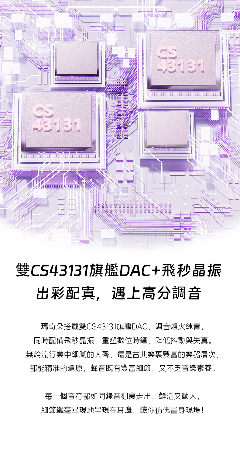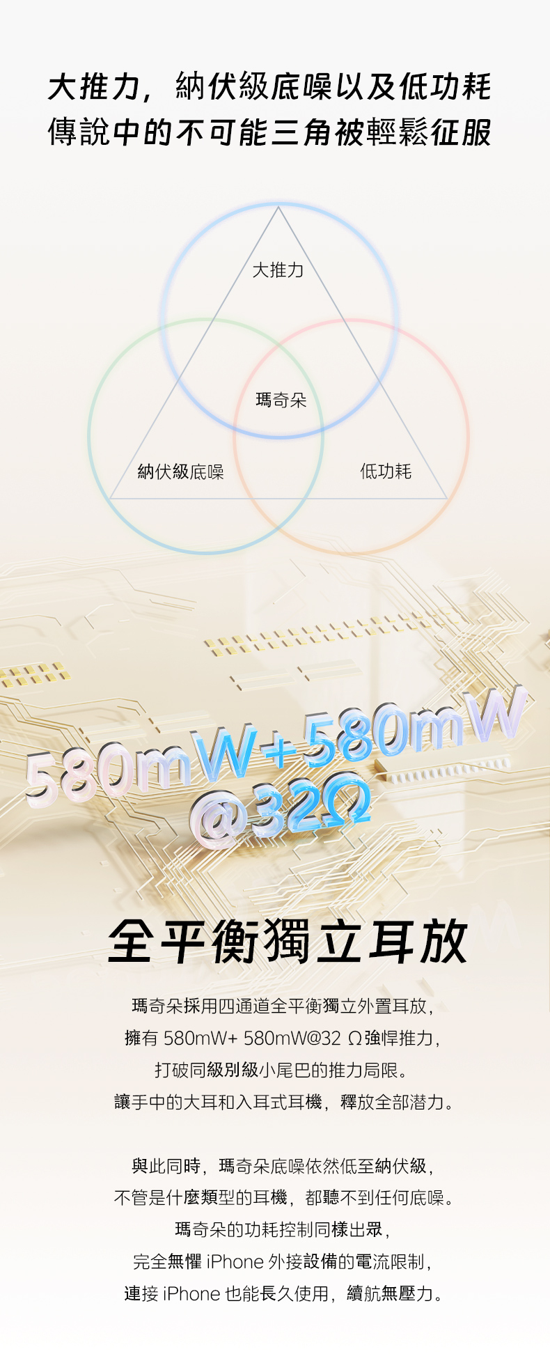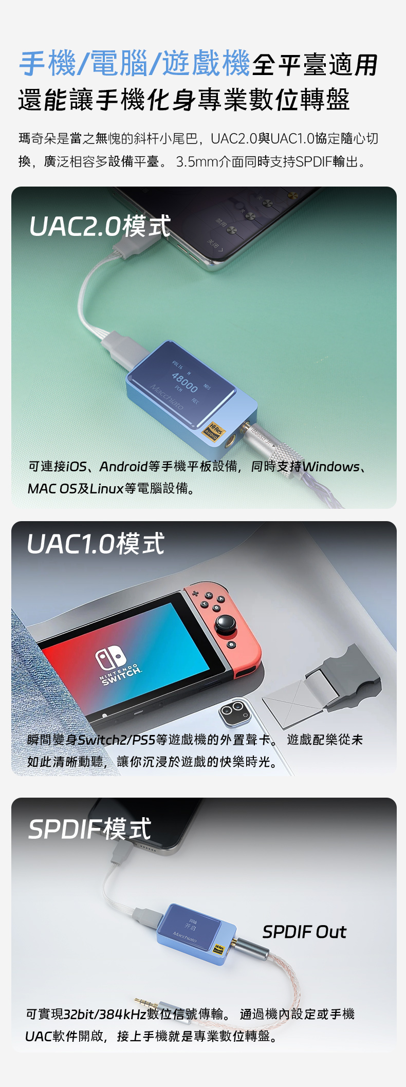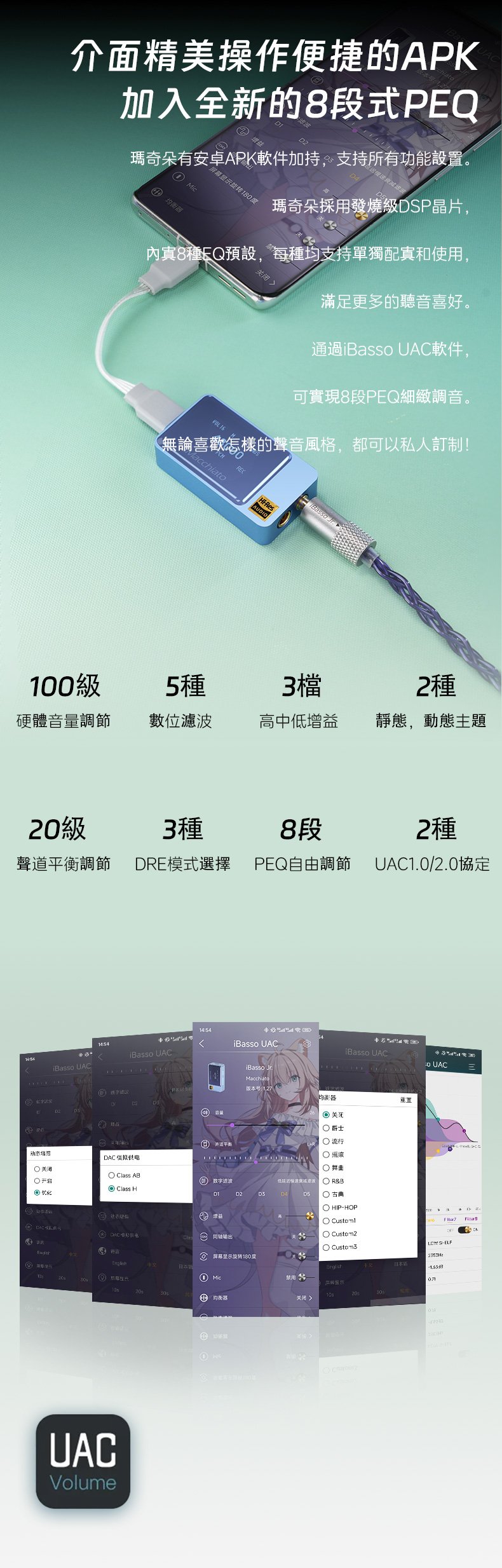 【全平衡獨立耳放 ~ iBasso Jr. Macchiato·瑪奇朵】 #可顏可甜小尾巴 ~ 同級至強音 #手機HiFi音效卡 iBasso Jr. Macchiato·瑪奇朵 顏色: 曜黑丨桃粉丨湖藍 建議零售價: HK$599 特點: 1. 雙CS43131旗艦DAC,實測THD+N:-118dB 2. 580mW + 580mW@32Ω,全平衡獨立耳放 3. 內置飛秒晶振,時鐘更精准 4. PCM32bit/384kHz,Native DSD256x 5. 0.96英寸OLED螢幕+物理按鍵,全部設置機內實現 6. 安卓APK,手機便捷設置,支援8段式PEQ,聲音精細調節 7. 支援麥克風高清通話,開黑無壓力 8. 4.4mm + 3.5mm雙介面 9. 標配發燒級單晶銅鍍銀C to C連接線 10. UAC1.0+UAC2.0雙協定,支援手機/電腦及Switch2等遊戲機 ==================== 1. 手機HiFi音效卡——瑪奇朵 為不滿足TWS音質的你開一扇門 手機HiFi音效卡——瑪奇朵,Type-C介面, 連接手機,隨插即用的HiFi設備。 無論是聆聽音樂、沉浸觀影,還是遊戲開黑, 都能帶來遠超AirPods PRO等旗艦TWS的聲音表現。 如果說TWS的聲音,是十年前充滿顆粒感的720P螢幕, 那瑪奇朵所帶來的,是首次更換到4K超清大屏的震撼! 2. 支援麥克風通話 是聽歌神器,也是開黑利器 瑪奇朵不只是聽歌神器,更是遊戲開黑黨的摯愛。 3.5mm介面支援麥克風高清通話,暢快開麥,溝通無憂! 玩FPS遊戲隊友報點,敵人資訊精准傳遞,快速判斷戰局; 打MOBA遊戲,與隊友戰術交流無延遲,指令傳達更及時。 有了瑪奇朵,聽歌、開黑兩不誤,助你輕鬆連勝! 3. 手機/電腦/遊戲機全平臺適用 還能讓手機化身專業數字轉盤 瑪奇朵是當之無愧的斜杆小尾巴,UAC2.0與UAC1.0協議隨心切換,廣泛相容多設備平臺。3.5mm介面同時支援SPDIF輸出。 UAC2.0模式:可連接iOS、Android等手機平板設備,同時支援Windows、MAC OS及Linux等電腦設備。 配手機或電腦使用 UAC1.0模式:瞬間變身Switch2/PS5等遊戲機的外置音效卡。遊戲配樂從未如此清晰動聽,讓你沉浸於遊戲的快樂時光。 配Switch遊戲機 SPDIF模式:可實現32bit/384kHz數位信號傳輸。通過機內設置或手機UAC軟體切換,接上手機就是專業數位轉盤。 4. 好看,高級,更動聽 這就是萬眾期待的瑪奇朵 當顏值與實力撞個滿懷, 便有了為年輕玩家打造的「瑪奇朵」。 瑪奇朵延續iBasso Jr. 系列高顏值設計基因, 蜜光粉、星河藍、暮夜黑三種配色,讓你一見傾心! 鋁合金CNC中框,細膩噴砂工藝,手感極佳。 鑽晶金剛玻璃,電鍍出淡淡的金屬質感, 晶瑩剔透,息屏後渾然一體,高級感滿滿。 掛在手機上是亮眼配飾,揣在口袋裡是潮流符號, 聽歌時不僅有好音質,更有高顏值加持! 5. OLED螢幕搭配物理按鍵 自由操作,一鍵掌控 瑪奇朵配備0.96”OLED 螢幕,搭配側邊三顆物理按鍵, 無論是調音量、換濾波、切增益,還是聲道平衡等功能, 多種設置,本機內就能搞定,便捷操作一氣呵成! 6. 介面精美操作便捷的APK 加入全新的8段式PEQ 瑪奇朵有安卓APK軟體加持,支援所有功能設置。 瑪奇朵採用發燒級DSP晶片,內置8種EQ預設, 每種均支援單獨配置和使用,滿足更多的聽音喜好。 通過iBasso UAC軟體,可實現8段PEQ細緻調音。 無論喜歡怎樣的聲音風格,都可以私人訂制! 100級 硬體音量調節 5種 數位濾波 3檔 高中低增益 20級 聲道平衡調節 3種 DRE模式選擇 8段 PEQ自由調節 2種 動態/靜態主題 2種 UAC1.0/2.0協議 7. 雙CS43131旗艦DAC+飛秒晶振 出彩配置,遇上高分調音 瑪奇朵搭載雙CS43131旗艦 DAC,調音爐火純青。 同時配備飛秒晶振,重塑數位時鐘,降低抖動與失真。 無論流行樂中細膩的人聲,還是古典樂裡豐富的樂器層次, 都能精准的還原,聲音既有豐富細節,又不乏音樂素養。 每一個音符都如同錄音棚裡走出,鮮活又動人, 細節纖毫畢現地呈現在耳邊,讓你仿佛置身現場! 8. 大推力,納伏級底噪以及低功耗 傳說中的不可能三角被輕鬆征服 瑪奇朵採用四通道全平衡獨立外置耳放, 擁有580mW+580mW@32Ω強悍推力, 打破同級別級小尾巴的推力局限。 讓手中的大耳和入耳式耳機,釋放全部潛力。 與此同時,瑪奇朵底噪依然低至納伏級, 不管是什麼類型的耳機,都聽不到任何底噪。 瑪奇朵的功耗控制同樣出眾, 完全無懼iPhone外接設備的電流限制, 連接iPhone也能長久使用,續航無壓力。 9. 雙介面 | 可換線 標配單晶銅鍍銀C to C連接線 4.4mm平衡口深挖耳機潛力,帶來優異的聲道分離; 3.5mm單埠韻味十足,給你更出色的流行樂聽感。 可換線設計,標配高純度C to C單晶銅鍍銀連接線, 減少信號傳輸損耗,到手就有好聲音! 硬體參數: DAC晶片:兩片CS43131 PCM:32bit/384kHz DSD:最高Native DSD256x 重量:約21.6g 尺寸:約49.6mm*27.6mm*12.9mm 測試指標: 4.4mm平衡輸出 信噪比:131dB 動態範圍:132dB THD+N:-118dBA(300Ω load) -105dBA(32Ω load) 輸出電平:5Vrms 輸出功率:580mW+580mW@32Ω 輸出阻抗:<0.05Ω Crosstalk:145dB 頻率回應:5Hz-80kHz -0.5dB 3.5mm單端輸出 信噪比:127dB 動態範圍:128dB THD+N:-115dBA(300Ω load) 輸出電平:2.5Vrms 輸出功率:195mW+195mW@32Ω 輸出阻抗:<0.05Ω Crosstalk:136dB 頻率回應:5Hz-80kHz -0.5dB