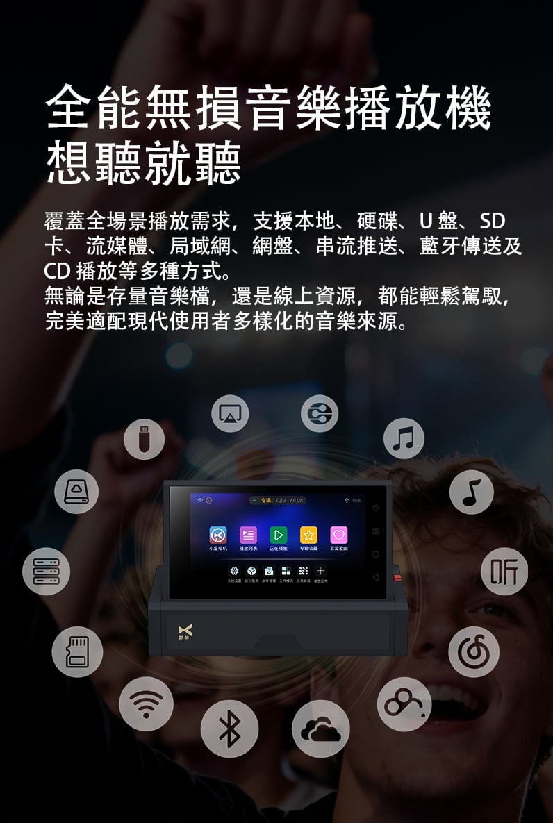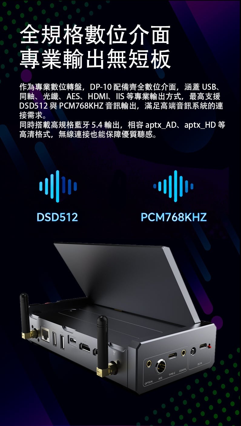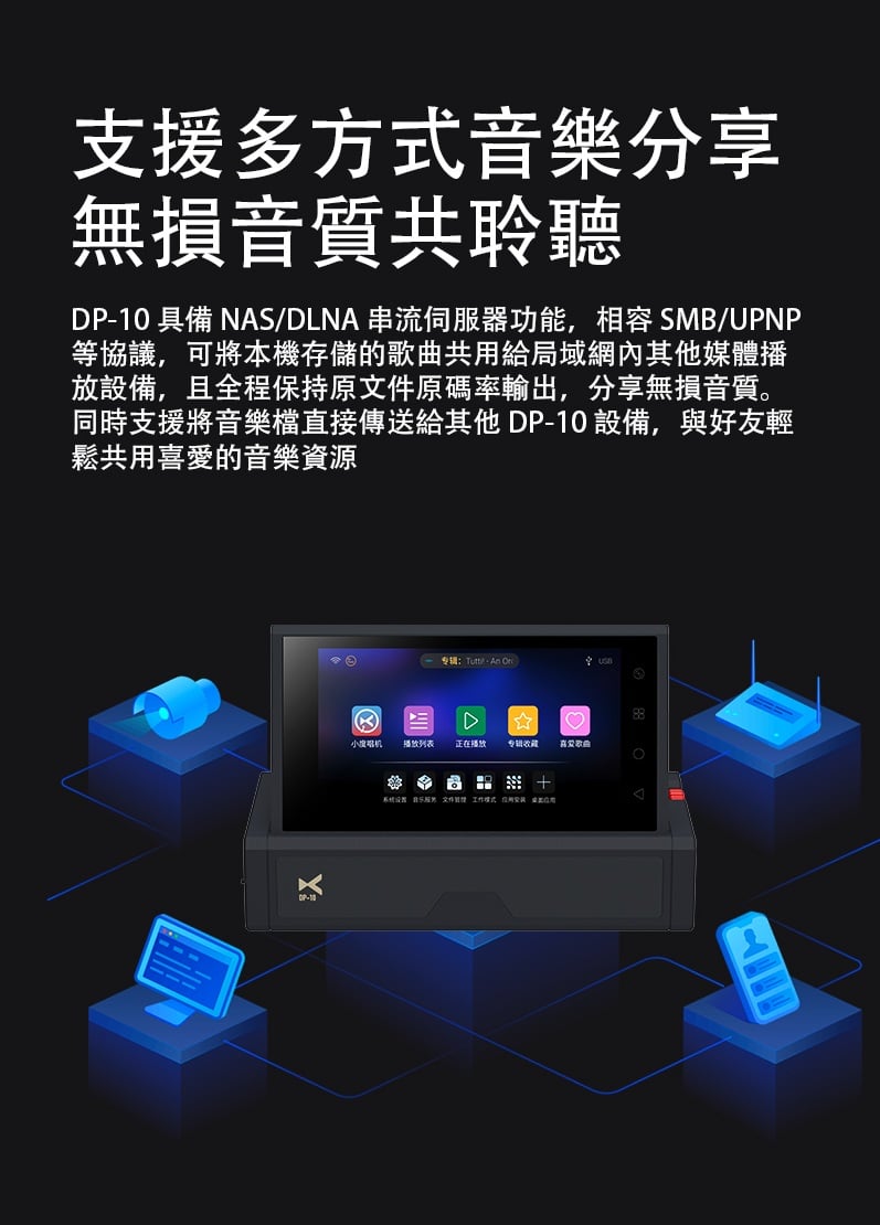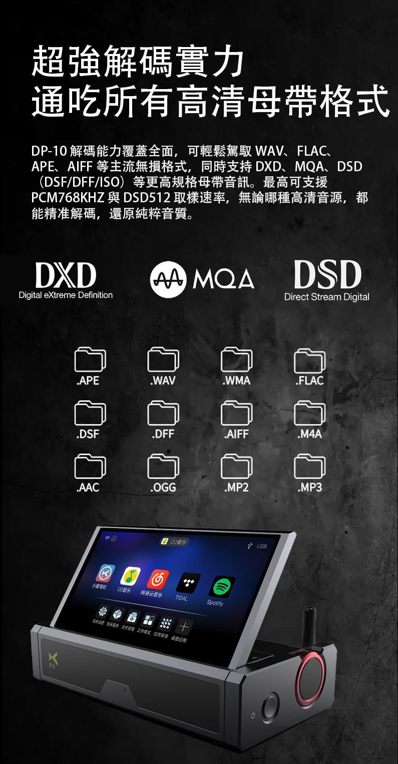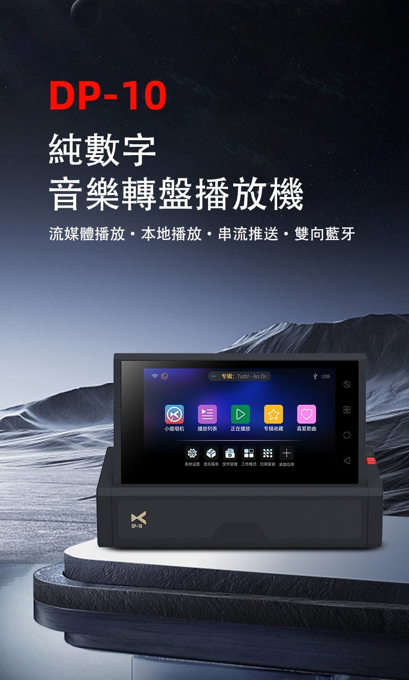 【全能無損音樂播放一體機 ~ Xduoo DP-10】 Xduoo DP-10 (全能無損音樂播放機) 流媒體播放·本地播放·串流推送·雙向藍牙 建議零售價: HK$ 6699 早鳥優惠價: HK$ 6399 特點: 1. All-in-one無損音樂播放器(本地和串流媒體) 2. 純數位傳輸輸出,呈現原始音訊 3. 5.5 吋高清觸控屏,具有橫向和縱向模式 4. 透過 Android、iOS、Windows 進行遠端應用程式控制 5. 網路串流媒體與無線無損投播 6. 多種數位輸出:USB、同軸、光纖、AES、HDMI、I²S 可擴充儲存:M.2 SSD、USB 磁碟機、Micro SD 7. CD 播放和翻錄支持 8. 藍牙 5.4,搭配 aptX、LDAC、aptX-HD、aptX 自適應 9. 四核心 ARM Cortex-A55 + 8GB RAM 可實現平穩運行 ==================== 1. 全能無損音樂播放機 想聽就聽 覆蓋全場景播放需求,支援本地、硬碟、U 盤、SD 卡、流媒體、局域網、網盤、串流推送、藍牙傳送及 CD 播放等多種方式。 無論是存量音樂檔,還是線上資源,都能輕鬆駕馭,完美適配現代使用者多樣化的音樂來源。 2. 純數位輸出 鑄就純淨聲底 作為音訊系統的前端核心,數位轉盤的聲底純淨度直接決定聽覺基礎。DP-10 專注純數位轉盤輸出,電路無需複雜數模隔離,可將全部資源投入數位電路優化,從源頭確保信號乾淨無染。 供電上採用分級供電設計,每塊模組電路均配備超低雜訊穩壓 LDO 電路獨立供電。這一設計能保證各電路電源穩定純淨,同時避免相互干擾,為純淨信號提供堅實保障。 時鐘部分搭載超低相雜訊 Jitter 級晶振,讓數位音訊信號處理更精准、更同步。最終實現音樂節拍與細節的精准呈現,為你帶來分毫畢現的極致聽覺享受。 3. 高清觸控大屏 交互體驗更順手 DP-10 配備 5.5 英寸高清觸控顯示幕,針對數播場景量身定制橫、豎屏兩套專屬交互介面。無論是橫向放置看詳情,還是豎向握持快操作,顯示都清晰、操作都直觀,無需適應複雜佈局。 搭配深度優化的安卓操控系統,滑動、點選反應靈敏,每一步操作都絲滑順暢,讓選歌、切歌的過程像使用手機一樣輕鬆 4. APP 遠程式控制 音樂管理一觸即達 DP-10 支援全設備覆蓋,安卓、蘋果手機、平板、Windows 電腦均可安裝控制 APP。無需靠近機身,通過手機或電腦就能實現遠端同屏操控,隨時隨地調整音樂播放、管理歌單,讓操作突破空間限制。 5. 豐富線上流媒體服務 全域無損直出 DP-10 預置全球多款主流音樂服務平臺,同時針對橫屏場景重新優化 UI 介面,選歌、聽歌視覺更適配。 通過底層自研演算法,所有音樂 APP 均實現原取樣速率 Direct 直接輸出,全域繞過 SRC 限制,讓高清音樂信號無損耗傳遞,還原純粹聽感。 網路串流一鍵推 無線聽歌享無損 DP-10 支援網路串流推送功能,相容 DLNA、AirPlay、QPLAY 等主流協議。在支援投放的音樂 APP 內一鍵操作,即可通過局域網將音樂無線傳送到本機,以原碼高清資料實現無損重播。既享無線投放的便捷自由,又不折損高品質音樂聽感。 6. 全規格數位介面 專業輸出無短板 作為專業數位轉盤,DP-10 配備齊全數位介面,涵蓋 USB、同軸、光纖、AES、HDMI、IIS 等專業輸出方式,最高支援 DSD512 與 PCM768KHZ 音訊輸出,滿足高端音訊系統的連接需求。 同時搭載高規格藍牙 5.4 輸出,相容 aptx_AD、aptx_HD 等高清格式,無線連接也能保障優質聽感。 7. 多種協定覆蓋 共用音源隨便放 DP-10 支援 UPNP、SMB 等主流局域網共用協定,搭配千兆網路,可流暢訪問並播放 NAS 或網路磁碟中的歌曲檔,母帶及 DSD 格式也能直接解碼播放,無需額外轉換。 同時支持百度網盤等多平臺網盤掛載與線上播放,本機存放區的海量音樂,不用繁瑣傳輸就能隨時聆聽 8. 多方式存儲擴展 海量音樂隨身裝 DP-10 提供多樣化本機存儲方案,滿足不同擴容需求。 預留 M.2 NVMe SSD 插槽,簡易安裝即可擴展,最大支援 4TB 容量,相比傳統機械硬碟,讀寫更快、運行更安靜。 支援 USB 介面連接 U 盤、移動硬碟,隨插即用。 配備 Micro SD 卡槽(最大支持 2TB),支持FAT32, EXFAT, NTFS格式的卡。 多種擴展介面,輕鬆容納海量音樂檔,無需擔心存儲不足。 9. 支援 CD 播放與抓軌 經典音樂可存可聽 DP-10 通過 USB 連接 CD 光碟機,即可直接流覽播放 CD 光碟曲目,還原經典介質的原聲聽感。同時支援將 CD 歌曲拷貝至本機保存,讓珍貴的 CD 音樂擺脫光碟束縛,隨時調取播放,留住經典音質。 10. 超強解碼實力 通吃所有高清母帶格式 DP-10 解碼能力覆蓋全面,可輕鬆駕馭 WAV、FLAC、APE、AIFF 等主流無損格式,同時支持 DXD、MQA、DSD(DSF/DFF/ISO)等更高規格母帶音訊。最高可支援 PCM768KHZ 與 DSD512 取樣速率,無論哪種高清音源,都能精准解碼,還原純粹音質。 11. 強大多端文件管理 找歌管歌更省心 DP-10 搭載強大媒體庫管理系統,可自動掃描音樂檔並智慧分類整理。用戶能按曲風、專輯、曲目等維度快速搜索篩選,瞬間定位想聽的音樂,無需在海量檔中翻找。 支持對歌曲檔進行複製、粘貼、刪除等常規編輯,也可通過手機 APP 同屏操作,不管是本機還是遠端,都能輕鬆管理音樂檔。 12. 支援多方式音樂分享 無損音質共聆聽 DP-10 具備 NAS/DLNA 串流伺服器功能,相容 SMB/UPNP 等協議,可將本機存儲的歌曲共用給局域網內其他媒體播放設備,且全程保持原文件原碼率輸出,分享無損音質。 同時支援將音樂檔直接傳送給其他 DP-10 設備,與好友輕鬆共用喜愛的音樂資源 13. 高通雙向藍牙 5.4 無線聽感不妥協 DP-10 搭載高通高端藍牙晶片,支援藍牙 5.4 收發一體,相容 aptx-HD、aptx-Adaptive、LDAC 等高清