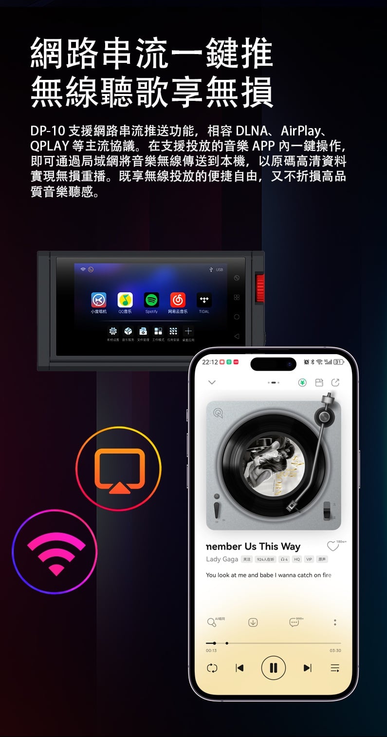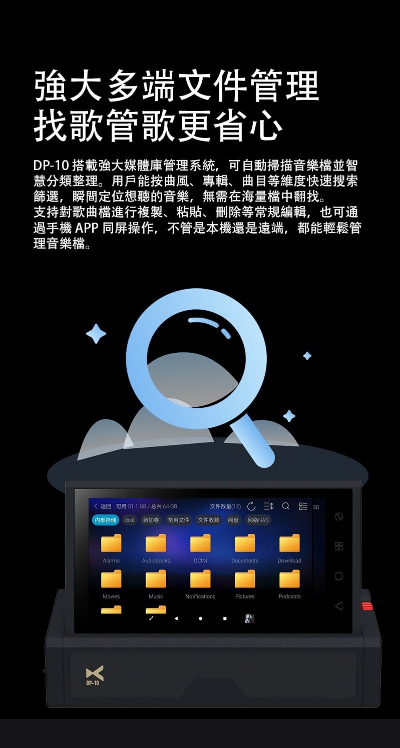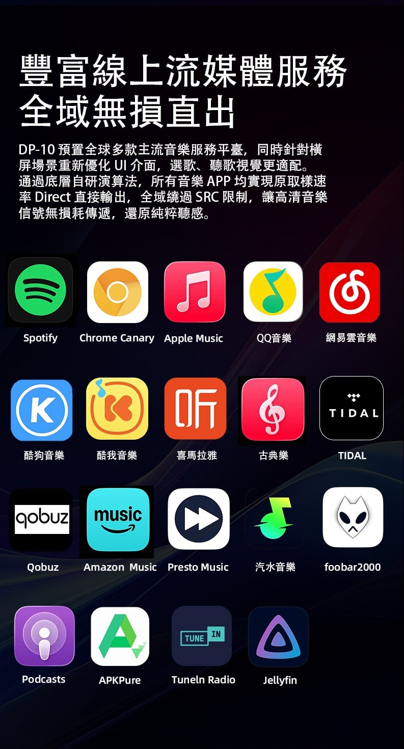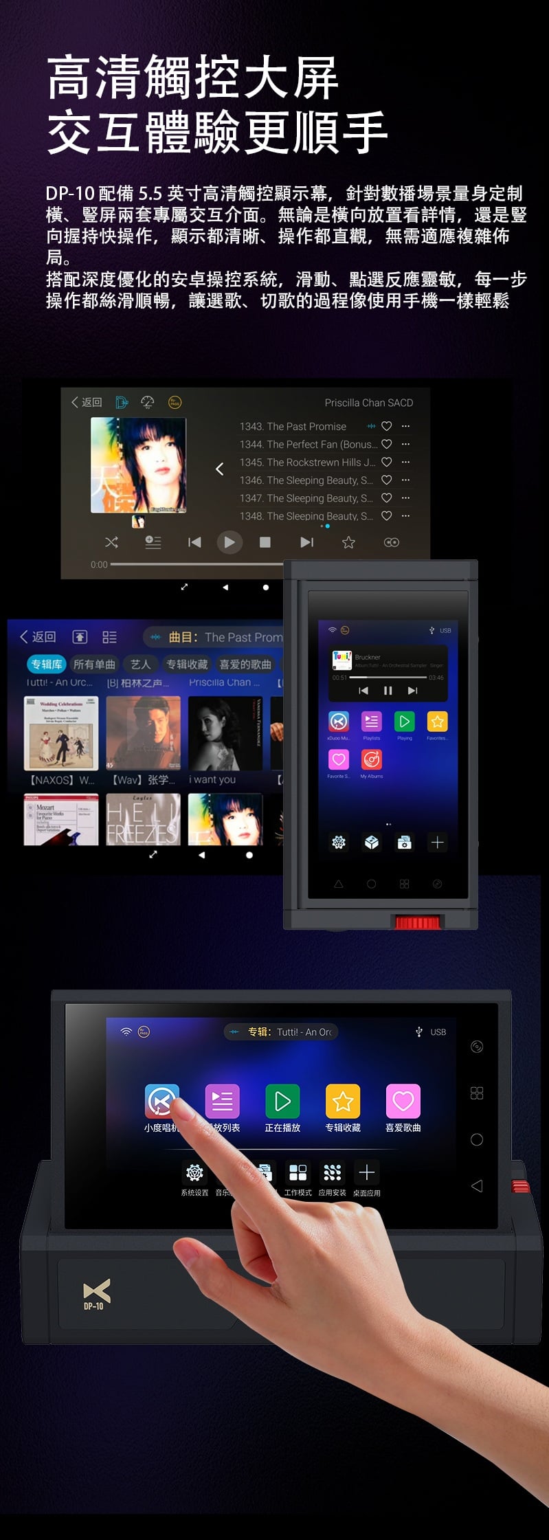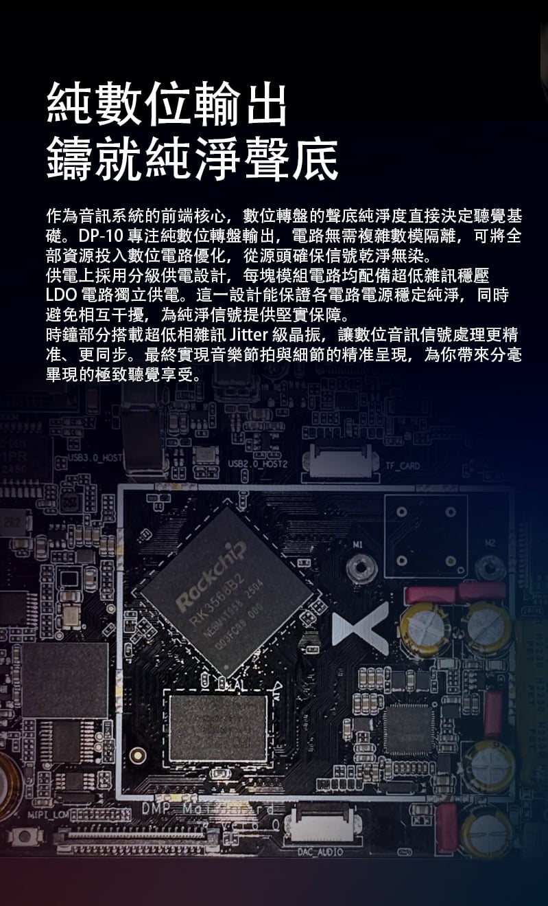 【全能無損音樂播放一體機 ~ Xduoo DP-10】 Xduoo DP-10 (全能無損音樂播放機) 流媒體播放·本地播放·串流推送·雙向藍牙 建議零售價: HK$ 6699 早鳥優惠價: HK$ 6399 特點: 1. All-in-one無損音樂播放器(本地和串流媒體) 2. 純數位傳輸輸出,呈現原始音訊 3. 5.5 吋高清觸控屏,具有橫向和縱向模式 4. 透過 Android、iOS、Windows 進行遠端應用程式控制 5. 網路串流媒體與無線無損投播 6. 多種數位輸出:USB、同軸、光纖、AES、HDMI、I²S 可擴充儲存:M.2 SSD、USB 磁碟機、Micro SD 7. CD 播放和翻錄支持 8. 藍牙 5.4,搭配 aptX、LDAC、aptX-HD、aptX 自適應 9. 四核心 ARM Cortex-A55 + 8GB RAM 可實現平穩運行 ==================== 1. 全能無損音樂播放機 想聽就聽 覆蓋全場景播放需求,支援本地、硬碟、U 盤、SD 卡、流媒體、局域網、網盤、串流推送、藍牙傳送及 CD 播放等多種方式。 無論是存量音樂檔,還是線上資源,都能輕鬆駕馭,完美適配現代使用者多樣化的音樂來源。 2. 純數位輸出 鑄就純淨聲底 作為音訊系統的前端核心,數位轉盤的聲底純淨度直接決定聽覺基礎。DP-10 專注純數位轉盤輸出,電路無需複雜數模隔離,可將全部資源投入數位電路優化,從源頭確保信號乾淨無染。 供電上採用分級供電設計,每塊模組電路均配備超低雜訊穩壓 LDO 電路獨立供電。這一設計能保證各電路電源穩定純淨,同時避免相互干擾,為純淨信號提供堅實保障。 時鐘部分搭載超低相雜訊 Jitter 級晶振,讓數位音訊信號處理更精准、更同步。最終實現音樂節拍與細節的精准呈現,為你帶來分毫畢現的極致聽覺享受。 3. 高清觸控大屏 交互體驗更順手 DP-10 配備 5.5 英寸高清觸控顯示幕,針對數播場景量身定制橫、豎屏兩套專屬交互介面。無論是橫向放置看詳情,還是豎向握持快操作,顯示都清晰、操作都直觀,無需適應複雜佈局。 搭配深度優化的安卓操控系統,滑動、點選反應靈敏,每一步操作都絲滑順暢,讓選歌、切歌的過程像使用手機一樣輕鬆 4. APP 遠程式控制 音樂管理一觸即達 DP-10 支援全設備覆蓋,安卓、蘋果手機、平板、Windows 電腦均可安裝控制 APP。無需靠近機身,通過手機或電腦就能實現遠端同屏操控,隨時隨地調整音樂播放、管理歌單,讓操作突破空間限制。 5. 豐富線上流媒體服務 全域無損直出 DP-10 預置全球多款主流音樂服務平臺,同時針對橫屏場景重新優化 UI 介面,選歌、聽歌視覺更適配。 通過底層自研演算法,所有音樂 APP 均實現原取樣速率 Direct 直接輸出,全域繞過 SRC 限制,讓高清音樂信號無損耗傳遞,還原純粹聽感。 網路串流一鍵推 無線聽歌享無損 DP-10 支援網路串流推送功能,相容 DLNA、AirPlay、QPLAY 等主流協議。在支援投放的音樂 APP 內一鍵操作,即可通過局域網將音樂無線傳送到本機,以原碼高清資料實現無損重播。既享無線投放的便捷自由,又不折損高品質音樂聽感。 6. 全規格數位介面 專業輸出無短板 作為專業數位轉盤,DP-10 配備齊全數位介面,涵蓋 USB、同軸、光纖、AES、HDMI、IIS 等專業輸出方式,最高支援 DSD512 與 PCM768KHZ 音訊輸出,滿足高端音訊系統的連接需求。 同時搭載高規格藍牙 5.4 輸出,相容 aptx_AD、aptx_HD 等高清格式,無線連接也能保障優質聽感。 7. 多種協定覆蓋 共用音源隨便放 DP-10 支援 UPNP、SMB 等主流局域網共用協定,搭配千兆網路,可流暢訪問並播放 NAS 或網路磁碟中的歌曲檔,母帶及 DSD 格式也能直接解碼播放,無需額外轉換。 同時支持百度網盤等多平臺網盤掛載與線上播放,本機存放區的海量音樂,不用繁瑣傳輸就能隨時聆聽 8. 多方式存儲擴展 海量音樂隨身裝 DP-10 提供多樣化本機存儲方案,滿足不同擴容需求。 預留 M.2 NVMe SSD 插槽,簡易安裝即可擴展,最大支援 4TB 容量,相比傳統機械硬碟,讀寫更快、運行更安靜。 支援 USB 介面連接 U 盤、移動硬碟,隨插即用。 配備 Micro SD 卡槽(最大支持 2TB),支持FAT32, EXFAT, NTFS格式的卡。 多種擴展介面,輕鬆容納海量音樂檔,無需擔心存儲不足。 9. 支援 CD 播放與抓軌 經典音樂可存可聽 DP-10 通過 USB 連接 CD 光碟機,即可直接流覽播放 CD 光碟曲目,還原經典介質的原聲聽感。同時支援將 CD 歌曲拷貝至本機保存,讓珍貴的 CD 音樂擺脫光碟束縛,隨時調取播放,留住經典音質。 10. 超強解碼實力 通吃所有高清母帶格式 DP-10 解碼能力覆蓋全面,可輕鬆駕馭 WAV、FLAC、APE、AIFF 等主流無損格式,同時支持 DXD、MQA、DSD(DSF/DFF/ISO)等更高規格母帶音訊。最高可支援 PCM768KHZ 與 DSD512 取樣速率,無論哪種高清音源,都能精准解碼,還原純粹音質。 11. 強大多端文件管理 找歌管歌更省心 DP-10 搭載強大媒體庫管理系統,可自動掃描音樂檔並智慧分類整理。用戶能按曲風、專輯、曲目等維度快速搜索篩選,瞬間定位想聽的音樂,無需在海量檔中翻找。 支持對歌曲檔進行複製、粘貼、刪除等常規編輯,也可通過手機 APP 同屏操作,不管是本機還是遠端,都能輕鬆管理音樂檔。 12. 支援多方式音樂分享 無損音質共聆聽 DP-10 具備 NAS/DLNA 串流伺服器功能,相容 SMB/UPNP 等協議,可將本機存儲的歌曲共用給局域網內其他媒體播放設備,且全程保持原文件原碼率輸出,分享無損音質。 同時支援將音樂檔直接傳送給其他 DP-10 設備,與好友輕鬆共用喜愛的音樂資源 13. 高通雙向藍牙 5.4 無線聽感不妥協 DP-10 搭載高通高端藍牙晶片,支援藍牙 5.4 收發一體,相容 aptx-HD、aptx-Adaptive、LDAC 等高清