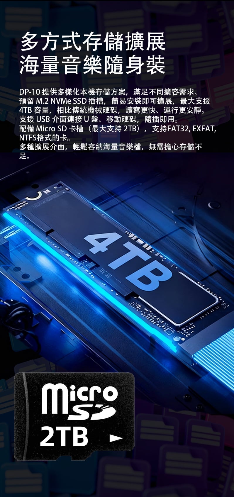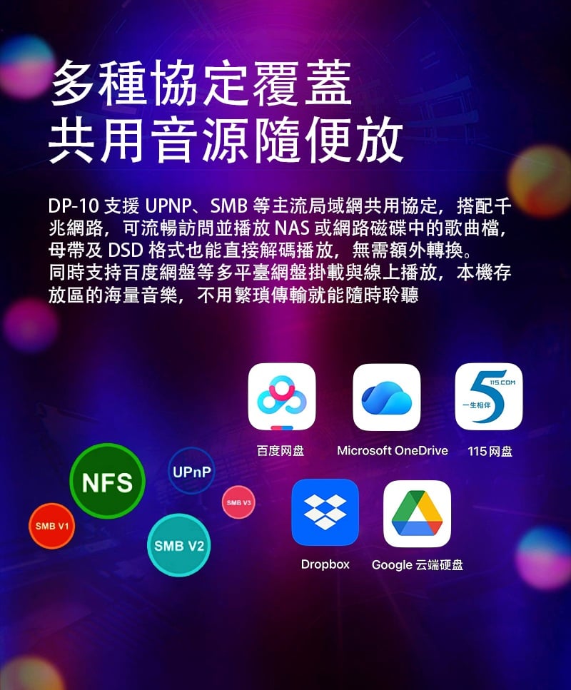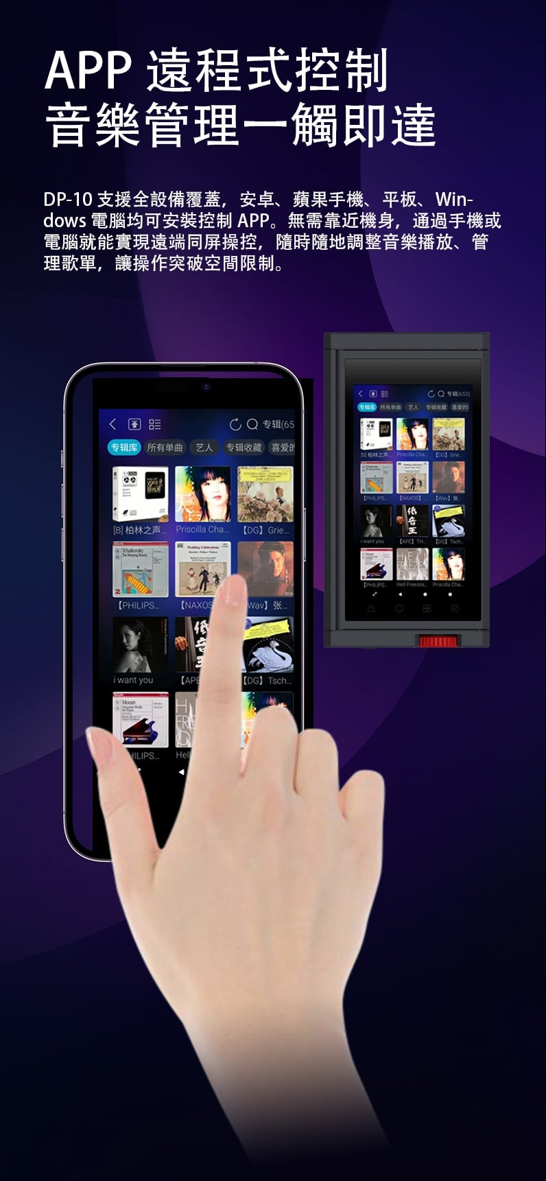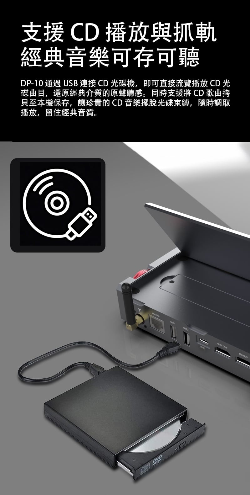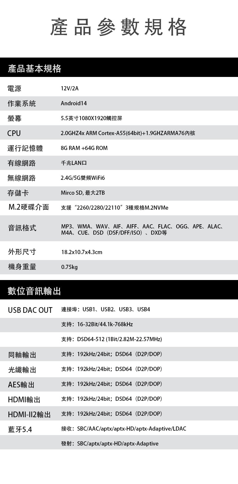 【全能無損音樂播放一體機 ~ Xduoo DP-10】 Xduoo DP-10 (全能無損音樂播放機) 流媒體播放·本地播放·串流推送·雙向藍牙 建議零售價: HK$ 6699 早鳥優惠價: HK$ 6399 特點: 1. All-in-one無損音樂播放器(本地和串流媒體) 2. 純數位傳輸輸出,呈現原始音訊 3. 5.5 吋高清觸控屏,具有橫向和縱向模式 4. 透過 Android、iOS、Windows 進行遠端應用程式控制 5. 網路串流媒體與無線無損投播 6. 多種數位輸出:USB、同軸、光纖、AES、HDMI、I²S 可擴充儲存:M.2 SSD、USB 磁碟機、Micro SD 7. CD 播放和翻錄支持 8. 藍牙 5.4,搭配 aptX、LDAC、aptX-HD、aptX 自適應 9. 四核心 ARM Cortex-A55 + 8GB RAM 可實現平穩運行 ==================== 1. 全能無損音樂播放機 想聽就聽 覆蓋全場景播放需求,支援本地、硬碟、U 盤、SD 卡、流媒體、局域網、網盤、串流推送、藍牙傳送及 CD 播放等多種方式。 無論是存量音樂檔,還是線上資源,都能輕鬆駕馭,完美適配現代使用者多樣化的音樂來源。 2. 純數位輸出 鑄就純淨聲底 作為音訊系統的前端核心,數位轉盤的聲底純淨度直接決定聽覺基礎。DP-10 專注純數位轉盤輸出,電路無需複雜數模隔離,可將全部資源投入數位電路優化,從源頭確保信號乾淨無染。 供電上採用分級供電設計,每塊模組電路均配備超低雜訊穩壓 LDO 電路獨立供電。這一設計能保證各電路電源穩定純淨,同時避免相互干擾,為純淨信號提供堅實保障。 時鐘部分搭載超低相雜訊 Jitter 級晶振,讓數位音訊信號處理更精准、更同步。最終實現音樂節拍與細節的精准呈現,為你帶來分毫畢現的極致聽覺享受。 3. 高清觸控大屏 交互體驗更順手 DP-10 配備 5.5 英寸高清觸控顯示幕,針對數播場景量身定制橫、豎屏兩套專屬交互介面。無論是橫向放置看詳情,還是豎向握持快操作,顯示都清晰、操作都直觀,無需適應複雜佈局。 搭配深度優化的安卓操控系統,滑動、點選反應靈敏,每一步操作都絲滑順暢,讓選歌、切歌的過程像使用手機一樣輕鬆 4. APP 遠程式控制 音樂管理一觸即達 DP-10 支援全設備覆蓋,安卓、蘋果手機、平板、Windows 電腦均可安裝控制 APP。無需靠近機身,通過手機或電腦就能實現遠端同屏操控,隨時隨地調整音樂播放、管理歌單,讓操作突破空間限制。 5. 豐富線上流媒體服務 全域無損直出 DP-10 預置全球多款主流音樂服務平臺,同時針對橫屏場景重新優化 UI 介面,選歌、聽歌視覺更適配。 通過底層自研演算法,所有音樂 APP 均實現原取樣速率 Direct 直接輸出,全域繞過 SRC 限制,讓高清音樂信號無損耗傳遞,還原純粹聽感。 網路串流一鍵推 無線聽歌享無損 DP-10 支援網路串流推送功能,相容 DLNA、AirPlay、QPLAY 等主流協議。在支援投放的音樂 APP 內一鍵操作,即可通過局域網將音樂無線傳送到本機,以原碼高清資料實現無損重播。既享無線投放的便捷自由,又不折損高品質音樂聽感。 6. 全規格數位介面 專業輸出無短板 作為專業數位轉盤,DP-10 配備齊全數位介面,涵蓋 USB、同軸、光纖、AES、HDMI、IIS 等專業輸出方式,最高支援 DSD512 與 PCM768KHZ 音訊輸出,滿足高端音訊系統的連接需求。 同時搭載高規格藍牙 5.4 輸出,相容 aptx_AD、aptx_HD 等高清格式,無線連接也能保障優質聽感。 7. 多種協定覆蓋 共用音源隨便放 DP-10 支援 UPNP、SMB 等主流局域網共用協定,搭配千兆網路,可流暢訪問並播放 NAS 或網路磁碟中的歌曲檔,母帶及 DSD 格式也能直接解碼播放,無需額外轉換。 同時支持百度網盤等多平臺網盤掛載與線上播放,本機存放區的海量音樂,不用繁瑣傳輸就能隨時聆聽 8. 多方式存儲擴展 海量音樂隨身裝 DP-10 提供多樣化本機存儲方案,滿足不同擴容需求。 預留 M.2 NVMe SSD 插槽,簡易安裝即可擴展,最大支援 4TB 容量,相比傳統機械硬碟,讀寫更快、運行更安靜。 支援 USB 介面連接 U 盤、移動硬碟,隨插即用。 配備 Micro SD 卡槽(最大支持 2TB),支持FAT32, EXFAT, NTFS格式的卡。 多種擴展介面,輕鬆容納海量音樂檔,無需擔心存儲不足。 9. 支援 CD 播放與抓軌 經典音樂可存可聽 DP-10 通過 USB 連接 CD 光碟機,即可直接流覽播放 CD 光碟曲目,還原經典介質的原聲聽感。同時支援將 CD 歌曲拷貝至本機保存,讓珍貴的 CD 音樂擺脫光碟束縛,隨時調取播放,留住經典音質。 10. 超強解碼實力 通吃所有高清母帶格式 DP-10 解碼能力覆蓋全面,可輕鬆駕馭 WAV、FLAC、APE、AIFF 等主流無損格式,同時支持 DXD、MQA、DSD(DSF/DFF/ISO)等更高規格母帶音訊。最高可支援 PCM768KHZ 與 DSD512 取樣速率,無論哪種高清音源,都能精准解碼,還原純粹音質。 11. 強大多端文件管理 找歌管歌更省心 DP-10 搭載強大媒體庫管理系統,可自動掃描音樂檔並智慧分類整理。用戶能按曲風、專輯、曲目等維度快速搜索篩選,瞬間定位想聽的音樂,無需在海量檔中翻找。 支持對歌曲檔進行複製、粘貼、刪除等常規編輯,也可通過手機 APP 同屏操作,不管是本機還是遠端,都能輕鬆管理音樂檔。 12. 支援多方式音樂分享 無損音質共聆聽 DP-10 具備 NAS/DLNA 串流伺服器功能,相容 SMB/UPNP 等協議,可將本機存儲的歌曲共用給局域網內其他媒體播放設備,且全程保持原文件原碼率輸出,分享無損音質。 同時支援將音樂檔直接傳送給其他 DP-10 設備,與好友輕鬆共用喜愛的音樂資源 13. 高通雙向藍牙 5.4 無線聽感不妥協 DP-10 搭載高通高端藍牙晶片,支援藍牙 5.4 收發一體,相容 aptx-HD、aptx-Adaptive、LDAC 等高清