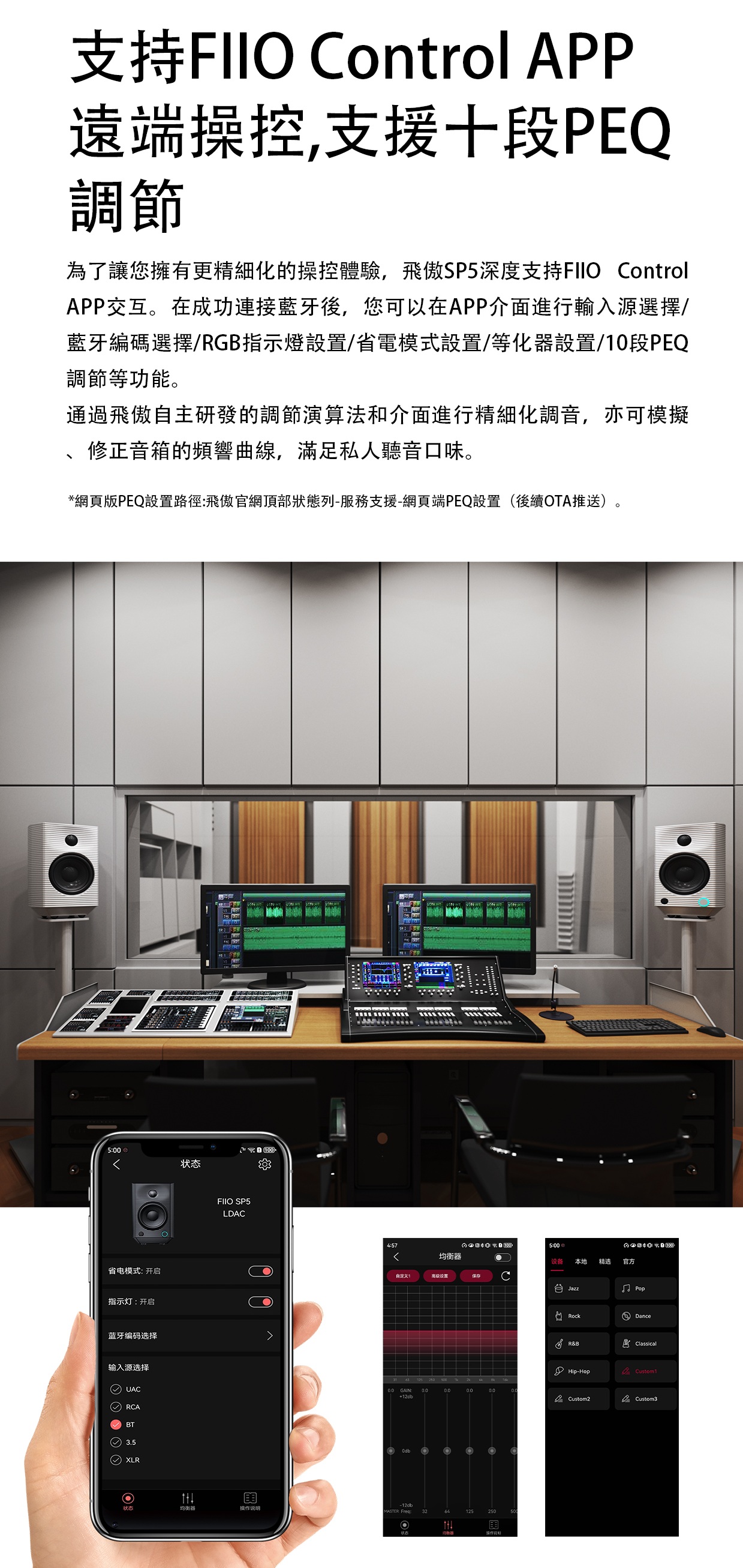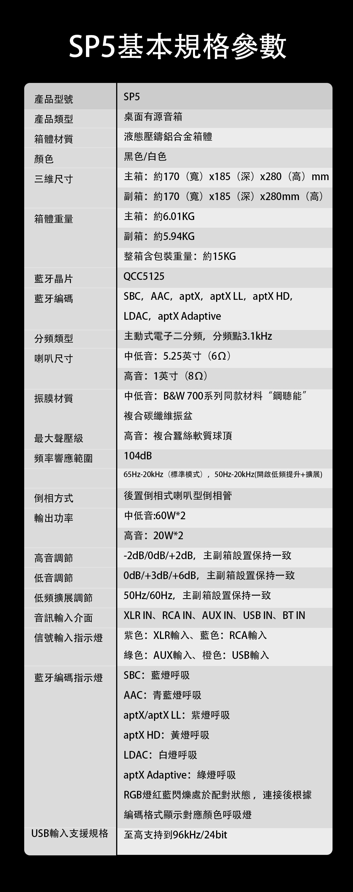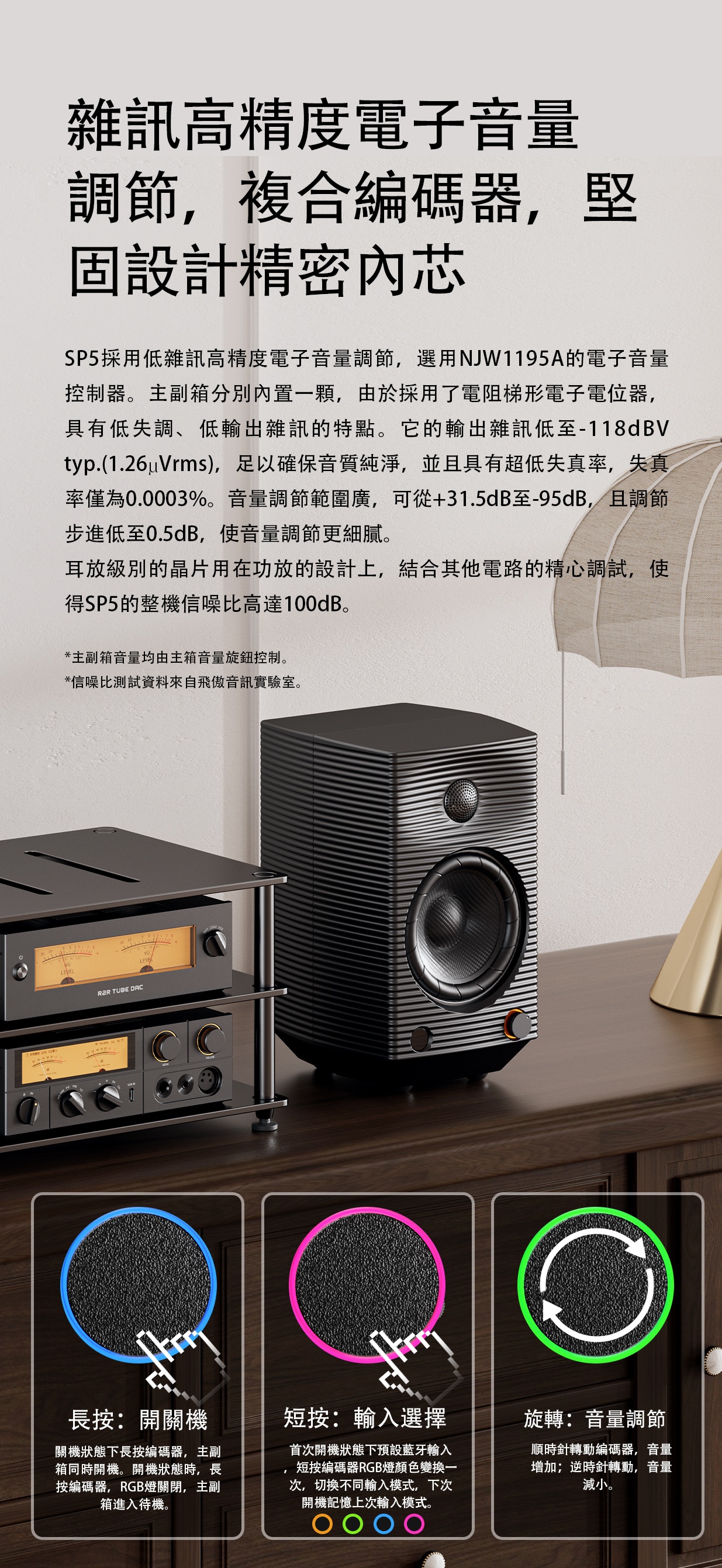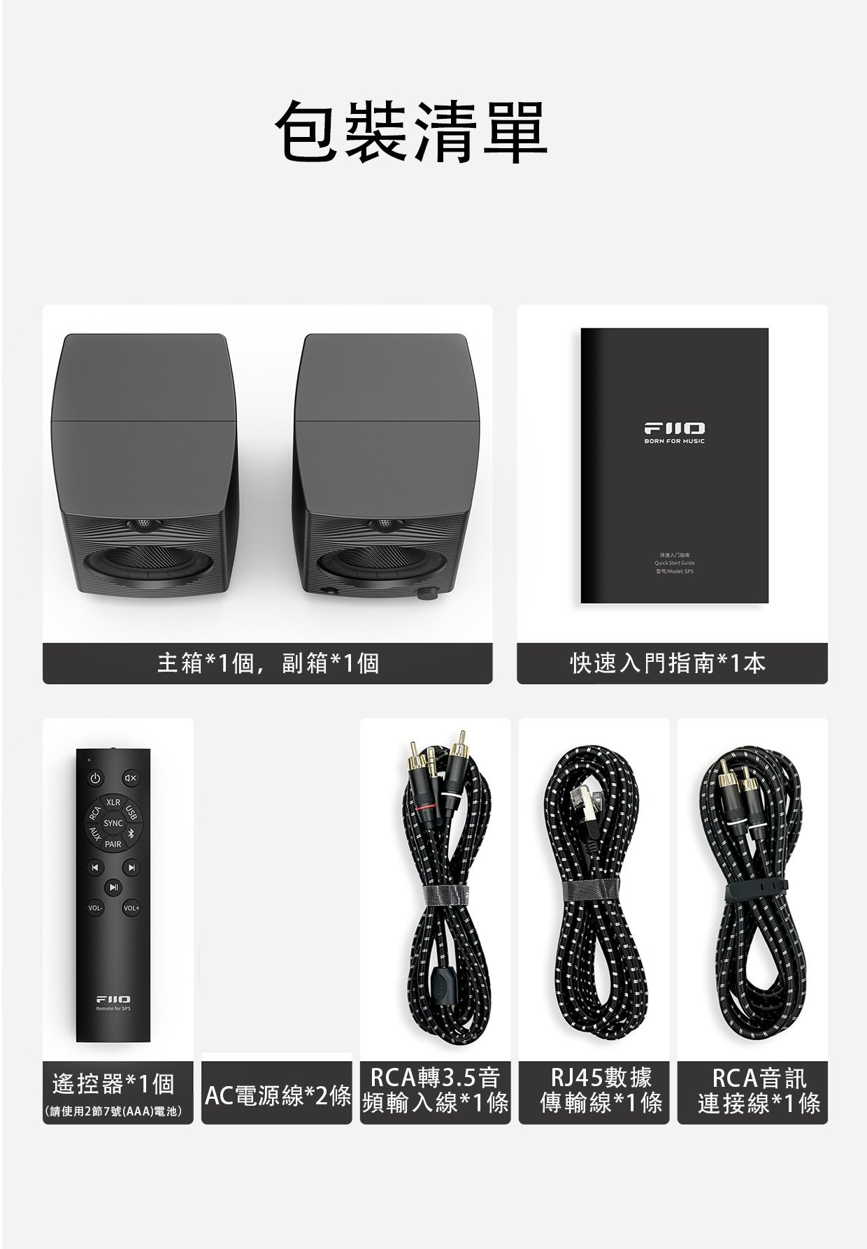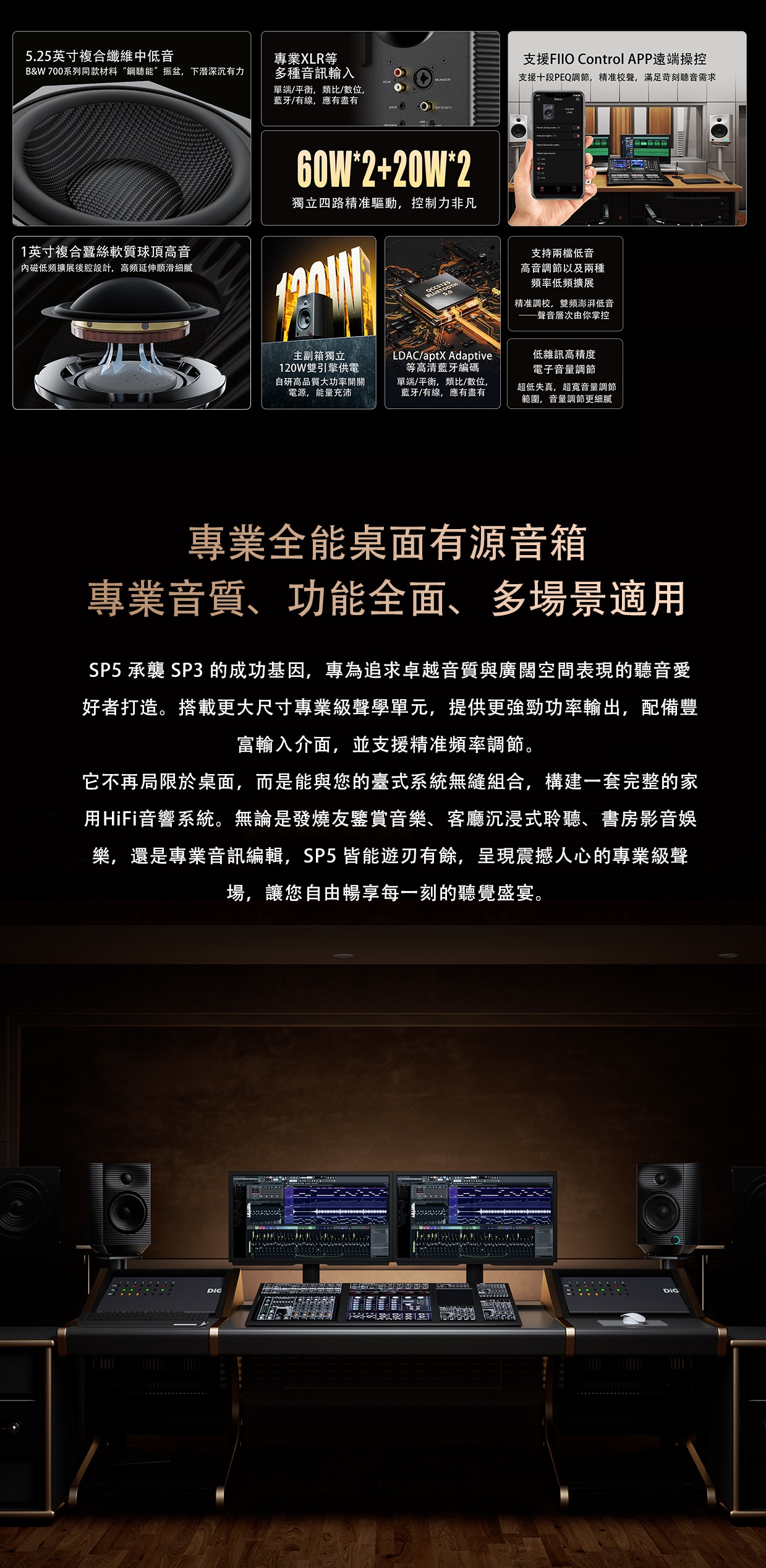 【專業全能桌面有源藍牙音箱 ~ FiiO SP5】 #超多輸入輸出接口 FiiO SP5 (專業全能桌面有源藍牙音箱) 香港版 顏色: 黑色/ 白色 建議零售價: HK$5999 特點: 1. 5.25英寸複合纖維中低音 ~ B&W 700系列同款材料“鋼聽能”振盆,下潛深沉有力 2. 專業XLR等多種音訊輸入 ~ 單端/平衡, 模擬/數位, 藍牙/有線, 應有盡有 3. 60W*2 + 20W*2 ~ 獨立四路精准驅動,控制力非凡 4. 支援FIIO Control APP遠端操控 ~ 支援十段PEQ調節, 精准校聲, 滿足苛刻聽音需求 5. 1英寸複合蠶絲軟質球頂高音 內磁低頻擴展後腔設計,高頻延伸順滑細膩 6. 主副箱獨立 120W雙引擎供電 ~ 自研高品質大功率開關電源, 能量充沛 7. LDAC/ aptX Adaptive 等高清藍牙編碼 ~ 單端/平衡, 模擬/數位, 藍牙/有線,應有盡有 8. 支持兩檔低音高音調節以及兩種頻率低頻擴展 ~ 精准調校, 雙頻澎湃低音 ~ 聲音層次由你掌控 9. 低雜訊高精度電子音量調節 ~ 超低失真, 超寬音量調節範圍, 音量調節更細膩 10. 標配兩條AC電源線 👉設有DEMO 可試 👉網店: https://bit.ly/3VHHi2A 接受八達通App/ 支付寶/ 微信支付/ 信用卡/ X Pay (3 個月免息分期)/ 銀聯/ PayPal/ 銀行轉帳/ 轉數快 ==================== 1. 專業全能桌面有源音箱 專業音質、功能全面、多場景適用 SP5 承襲 SP3 的成功基因,專為追求卓越音質與廣闊空間表現的聽音愛好者打造。搭載更大尺寸專業級聲學單元,提供更強勁功率輸出,配備豐富輸入介面,並支援精准頻率調節。 它不再局限於桌面,而是能與您的臺式系統無縫組合,構建一套完整的家用HiFi音響系統。無論是發燒友鑒賞音樂、客廳沉浸式聆聽、書房影音娛樂,還是專業音訊編輯,SP5 皆能遊刃有餘,呈現震撼人心的專業級聲場,讓您自由暢享每一刻的聽覺盛宴。 2. 5.25英寸“鋼聽能” 複合纖維中低音,下潛 深沉有力 SP5搭載的5.25英寸中低音單元,其核心振盆採用與傳奇B&W700 系列同款材料的“鋼聽能”複合纖維材質。為滿足客廳等更大空間的中遠場聆聽需求,我們在振盆材質、磁路系統、音圈設計與懸邊結構上傾注匠心,進行了全面優化。 這些精密設計賦予了單元卓越的剛性與阻尼特性,確保即使面對洶湧澎湃的大動態場面,SP5依然能從容應對,穩如磐石。最終呈現的低頻,下潛深邃有力,量感飽滿豐盈,剛中帶柔,質感彈性十足,精准還原每一個震撼人心的節奏與細節。 複合線性纖維振盆 ~ 具有良好的韌性和強度,確保在大功率驅動時不產生分割振動,重放頻段失真低於1%。 對稱性磁路 ~ 提供高於1.2T的磁場強度。 大口徑長衝程音圈 ~ 同級少見大口徑30mm長衝程音圈,更輕的振動品質配比,保證足夠的沖 程,獲得理想的動態回應。 NBR橡膠均衡懸邊 ~ 高順性,抗疲勞,螺旋式坑槽分割加強,避免在聆聽大動態場面時,順性 過大造成非線性失真。 *想讓新音箱的聲音更快達到最佳狀態?建議 您先連續播放音樂48小時左右(煲機)。之後 您會發現聲音更順耳、更耐聽。 3. 1英寸複合蠶絲軟質球頂 高音,順滑細膩,高音清晰通透 SP5 的高音單元,不僅選材考究,其聲學設計更見真章。飛傲聲學團隊創新性地將球頂內部的軟半球結構化為高效吸聲體,精准吸收振膜背部的有害諧波,顯著提升高音的純淨度與通透感。 為實現低諧振、高承載這一高階HiFi的追求目標,SP5 採用了突破性的背部大空腔設計。此設計令高頻回應驚人地下探至 800Hz,並確保振膜即便在20kHz以上的超高頻段工作時,也能輕鬆泄壓,大幅抑制本體共振。 球頂高音磁路冷卻技術 SP5 的高頻表現得以進一步昇華:絲般順滑,流暢細膩,將音樂中的每一個微妙細節都從容舒展地呈現在您耳畔。 *球頂高音磁路冷卻技術:一種磁流體冷卻的減振 技術,使高頻具有更佳的解析力與延展性。 高音聲波導技術 根據近場聽音的需求,SP5的高音設計了精准的聲波導,精確控制著高音軸向的輻射角度,高音單元正面的橫紋自前往後延伸,極大的提升了橫向的擴散聲場。 4. 獨立雙120W電源 主副音箱能量充沛互不干擾 飛傲自研高功率開關電源為每只SP5音箱注入高達120W的強勁心臟,賦予其強大的驅動能力與深厚的功率餘量,輕鬆駕馭各種音樂動態。全球通用寬電壓支援,暢享音樂無國界。 純淨供電是HiFi之本。SP5採用多級整流濾波架構並獨立供給後級,大幅降低干擾。革命性地運用變壓器諧振方案實現單轉雙電源,為前級關鍵電路提供純淨、穩定、對稱的能量,從源頭杜絕DC-DC雜訊污染,成就卓越的信噪比表現,讓背景更黑,細節更清。 智慧省電模式* 貼心節能,待機功耗極低;音樂響起,瞬間回應,時刻準備傳遞天籟。 *省電模式預設開啟狀態,支援自動待機喚醒功能;如果不需要此功能可通過APP關閉,就無法 進入待機。 5. 60W*2 + 20W*2 獨立四路功率輸出 澎湃能量精准釋放 SP5在主副箱內分別配備了1顆著名的德州儀器TI TPA3116D2 D類身歷聲數位功放,獨立驅動每個聲道,中低音峰值輸出功率高達60W*2,高音峰值輸出功率高達20W*2。 TPA3116D2具有短路保護和熱保護以及過壓、欠壓和直流保護,可全面防止出現故障。在超載情況下,器件會將故障情況回饋給處理器,從而避免自身遭到損壞。 60W x 2中低音峰值輸出功率高達 20W x 2高音峰值輸出功率高達 6. XLR平衡輸入 專業音訊的純淨基因 XLR平衡介面常見於專業音訊設備,相比普通的RCA介面,其主要優勢在於抗干擾能力強,適合長距離傳輸,同時能提供更高品質的音訊信號。 SP5 搭載專業級 XLR 平衡輸入介面,通