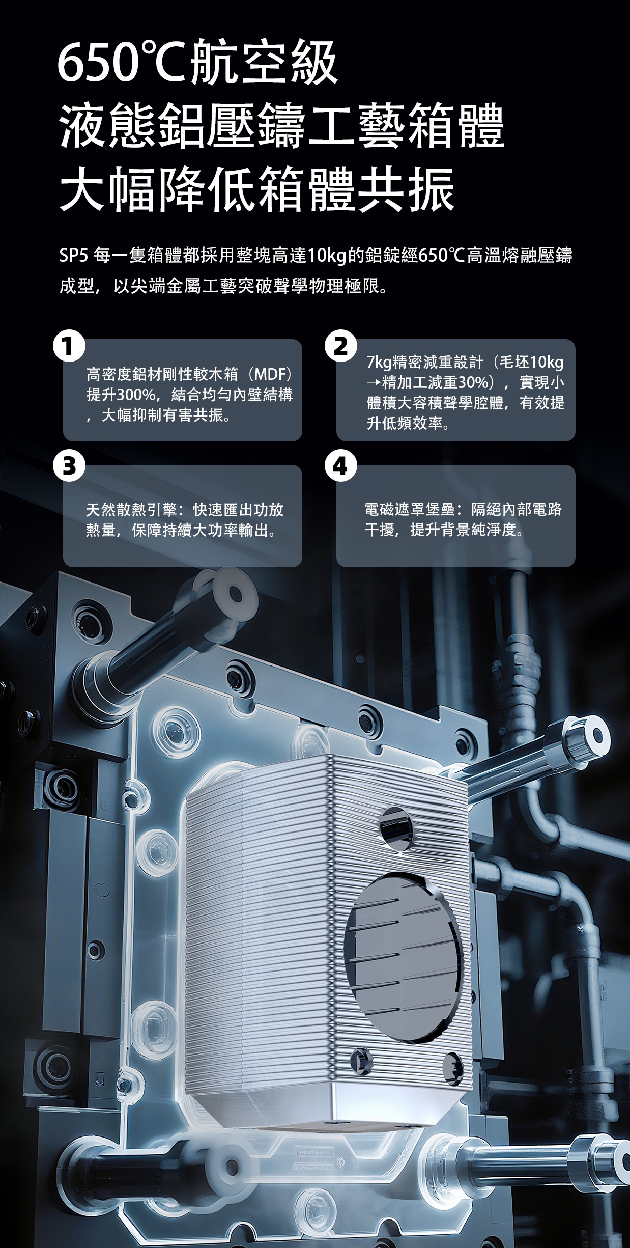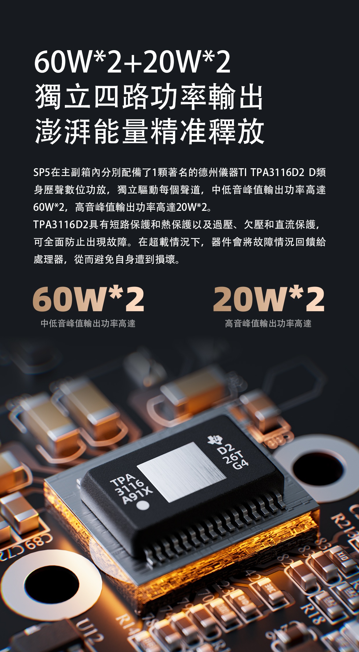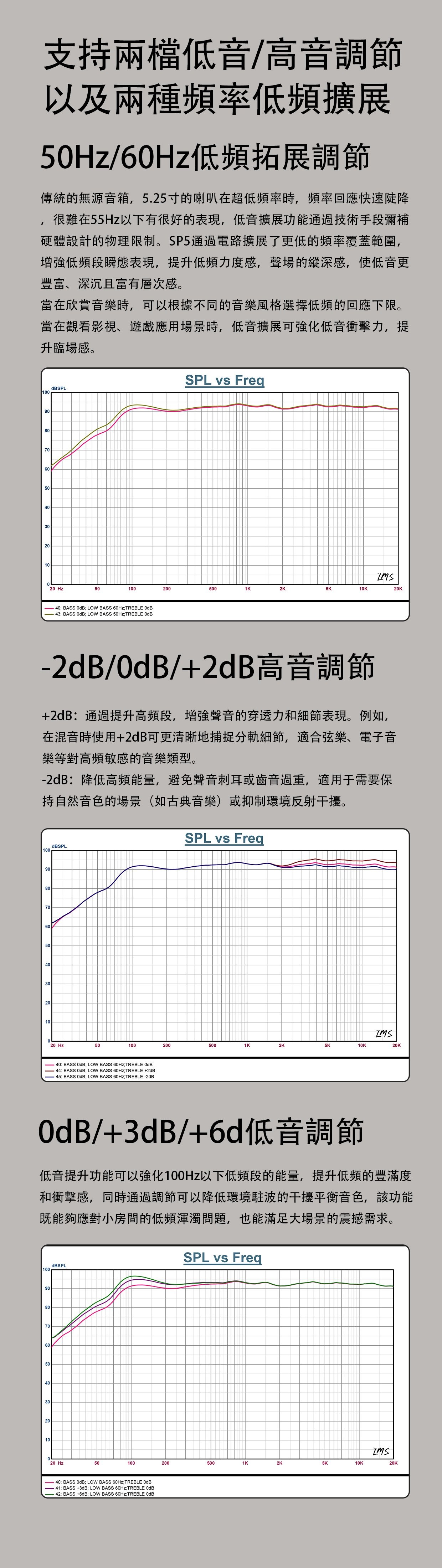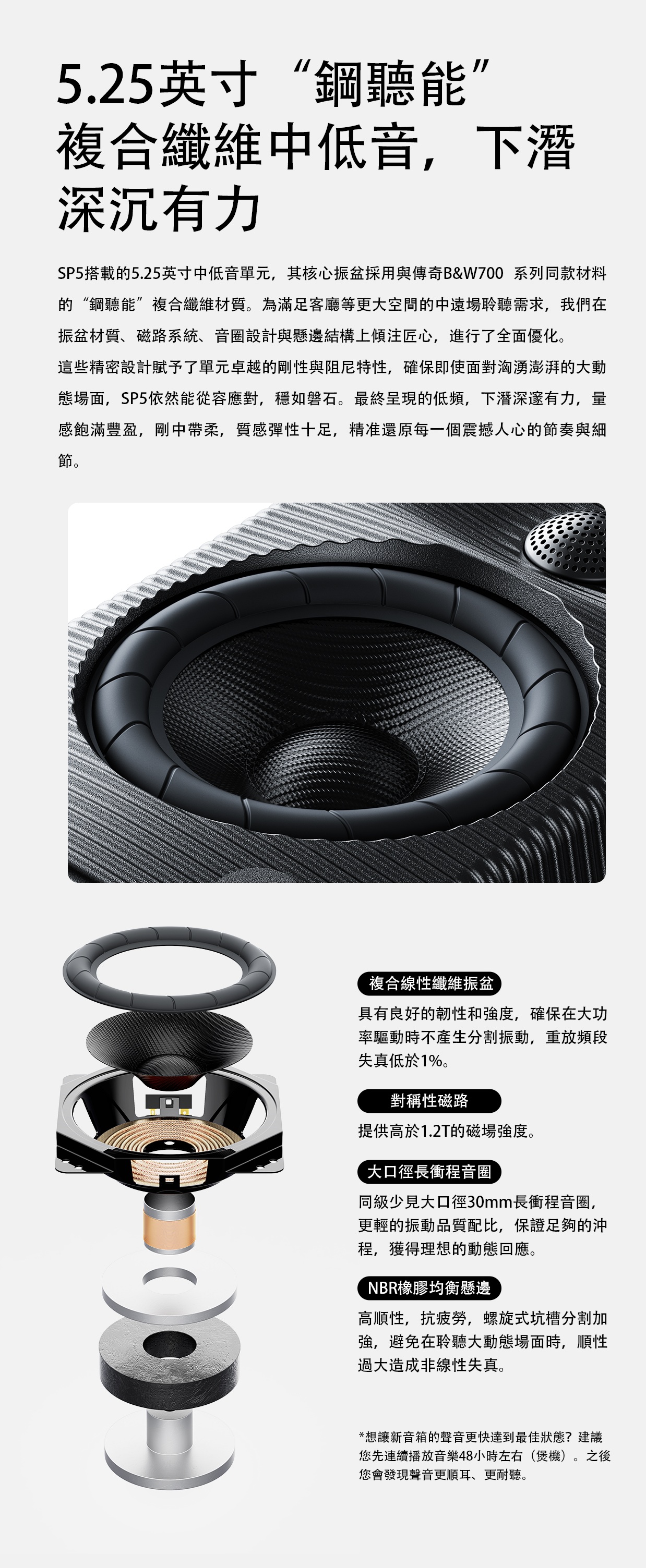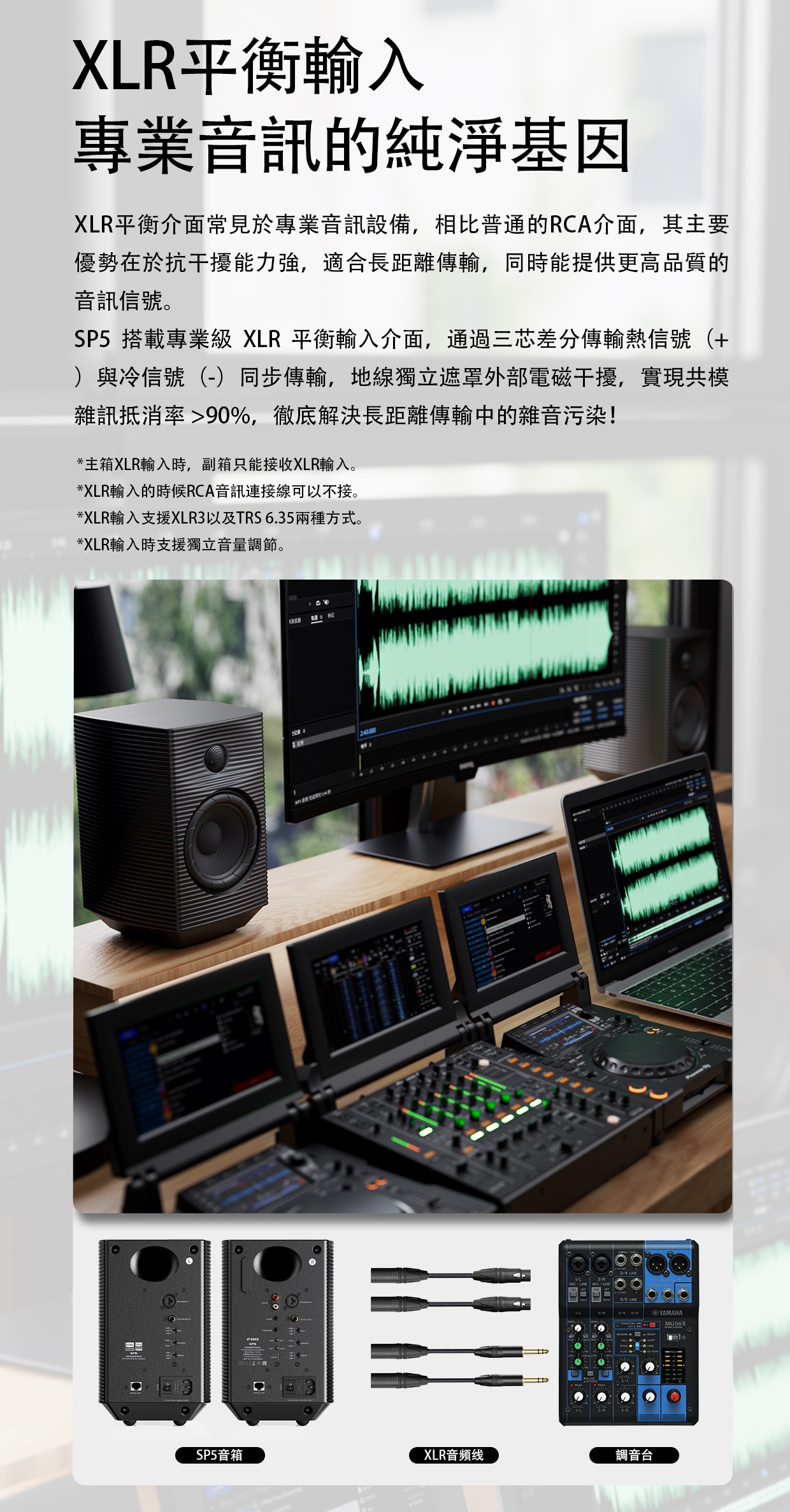 【專業全能桌面有源藍牙音箱 ~ FiiO SP5】 #超多輸入輸出接口 FiiO SP5 (專業全能桌面有源藍牙音箱) 香港版 顏色: 黑色/ 白色 建議零售價: HK$5999 特點: 1. 5.25英寸複合纖維中低音 ~ B&W 700系列同款材料“鋼聽能”振盆,下潛深沉有力 2. 專業XLR等多種音訊輸入 ~ 單端/平衡, 模擬/數位, 藍牙/有線, 應有盡有 3. 60W*2 + 20W*2 ~ 獨立四路精准驅動,控制力非凡 4. 支援FIIO Control APP遠端操控 ~ 支援十段PEQ調節, 精准校聲, 滿足苛刻聽音需求 5. 1英寸複合蠶絲軟質球頂高音 內磁低頻擴展後腔設計,高頻延伸順滑細膩 6. 主副箱獨立 120W雙引擎供電 ~ 自研高品質大功率開關電源, 能量充沛 7. LDAC/ aptX Adaptive 等高清藍牙編碼 ~ 單端/平衡, 模擬/數位, 藍牙/有線,應有盡有 8. 支持兩檔低音高音調節以及兩種頻率低頻擴展 ~ 精准調校, 雙頻澎湃低音 ~ 聲音層次由你掌控 9. 低雜訊高精度電子音量調節 ~ 超低失真, 超寬音量調節範圍, 音量調節更細膩 10. 標配兩條AC電源線 👉設有DEMO 可試 👉網店: https://bit.ly/3VHHi2A 接受八達通App/ 支付寶/ 微信支付/ 信用卡/ X Pay (3 個月免息分期)/ 銀聯/ PayPal/ 銀行轉帳/ 轉數快 ==================== 1. 專業全能桌面有源音箱 專業音質、功能全面、多場景適用 SP5 承襲 SP3 的成功基因,專為追求卓越音質與廣闊空間表現的聽音愛好者打造。搭載更大尺寸專業級聲學單元,提供更強勁功率輸出,配備豐富輸入介面,並支援精准頻率調節。 它不再局限於桌面,而是能與您的臺式系統無縫組合,構建一套完整的家用HiFi音響系統。無論是發燒友鑒賞音樂、客廳沉浸式聆聽、書房影音娛樂,還是專業音訊編輯,SP5 皆能遊刃有餘,呈現震撼人心的專業級聲場,讓您自由暢享每一刻的聽覺盛宴。 2. 5.25英寸“鋼聽能” 複合纖維中低音,下潛 深沉有力 SP5搭載的5.25英寸中低音單元,其核心振盆採用與傳奇B&W700 系列同款材料的“鋼聽能”複合纖維材質。為滿足客廳等更大空間的中遠場聆聽需求,我們在振盆材質、磁路系統、音圈設計與懸邊結構上傾注匠心,進行了全面優化。 這些精密設計賦予了單元卓越的剛性與阻尼特性,確保即使面對洶湧澎湃的大動態場面,SP5依然能從容應對,穩如磐石。最終呈現的低頻,下潛深邃有力,量感飽滿豐盈,剛中帶柔,質感彈性十足,精准還原每一個震撼人心的節奏與細節。 複合線性纖維振盆 ~ 具有良好的韌性和強度,確保在大功率驅動時不產生分割振動,重放頻段失真低於1%。 對稱性磁路 ~ 提供高於1.2T的磁場強度。 大口徑長衝程音圈 ~ 同級少見大口徑30mm長衝程音圈,更輕的振動品質配比,保證足夠的沖 程,獲得理想的動態回應。 NBR橡膠均衡懸邊 ~ 高順性,抗疲勞,螺旋式坑槽分割加強,避免在聆聽大動態場面時,順性 過大造成非線性失真。 *想讓新音箱的聲音更快達到最佳狀態?建議 您先連續播放音樂48小時左右(煲機)。之後 您會發現聲音更順耳、更耐聽。 3. 1英寸複合蠶絲軟質球頂 高音,順滑細膩,高音清晰通透 SP5 的高音單元,不僅選材考究,其聲學設計更見真章。飛傲聲學團隊創新性地將球頂內部的軟半球結構化為高效吸聲體,精准吸收振膜背部的有害諧波,顯著提升高音的純淨度與通透感。 為實現低諧振、高承載這一高階HiFi的追求目標,SP5 採用了突破性的背部大空腔設計。此設計令高頻回應驚人地下探至 800Hz,並確保振膜即便在20kHz以上的超高頻段工作時,也能輕鬆泄壓,大幅抑制本體共振。 球頂高音磁路冷卻技術 SP5 的高頻表現得以進一步昇華:絲般順滑,流暢細膩,將音樂中的每一個微妙細節都從容舒展地呈現在您耳畔。 *球頂高音磁路冷卻技術:一種磁流體冷卻的減振 技術,使高頻具有更佳的解析力與延展性。 高音聲波導技術 根據近場聽音的需求,SP5的高音設計了精准的聲波導,精確控制著高音軸向的輻射角度,高音單元正面的橫紋自前往後延伸,極大的提升了橫向的擴散聲場。 4. 獨立雙120W電源 主副音箱能量充沛互不干擾 飛傲自研高功率開關電源為每只SP5音箱注入高達120W的強勁心臟,賦予其強大的驅動能力與深厚的功率餘量,輕鬆駕馭各種音樂動態。全球通用寬電壓支援,暢享音樂無國界。 純淨供電是HiFi之本。SP5採用多級整流濾波架構並獨立供給後級,大幅降低干擾。革命性地運用變壓器諧振方案實現單轉雙電源,為前級關鍵電路提供純淨、穩定、對稱的能量,從源頭杜絕DC-DC雜訊污染,成就卓越的信噪比表現,讓背景更黑,細節更清。 智慧省電模式* 貼心節能,待機功耗極低;音樂響起,瞬間回應,時刻準備傳遞天籟。 *省電模式預設開啟狀態,支援自動待機喚醒功能;如果不需要此功能可通過APP關閉,就無法 進入待機。 5. 60W*2 + 20W*2 獨立四路功率輸出 澎湃能量精准釋放 SP5在主副箱內分別配備了1顆著名的德州儀器TI TPA3116D2 D類身歷聲數位功放,獨立驅動每個聲道,中低音峰值輸出功率高達60W*2,高音峰值輸出功率高達20W*2。 TPA3116D2具有短路保護和熱保護以及過壓、欠壓和直流保護,可全面防止出現故障。在超載情況下,器件會將故障情況回饋給處理器,從而避免自身遭到損壞。 60W x 2中低音峰值輸出功率高達 20W x 2高音峰值輸出功率高達 6. XLR平衡輸入 專業音訊的純淨基因 XLR平衡介面常見於專業音訊設備,相比普通的RCA介面,其主要優勢在於抗干擾能力強,適合長距離傳輸,同時能提供更高品質的音訊信號。 SP5 搭載專業級 XLR 平衡輸入介面,通