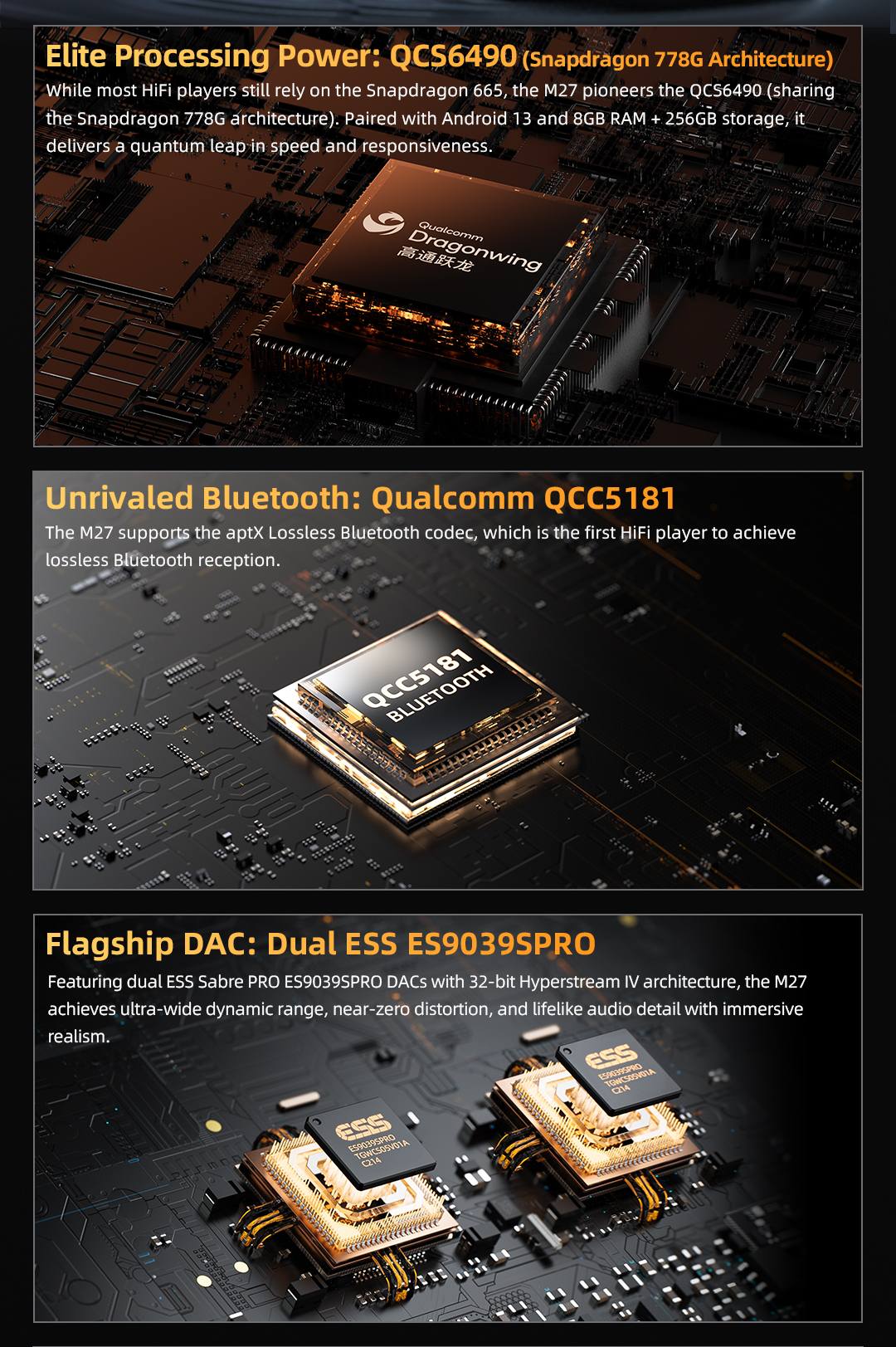 【巔峰之作~ FiiO M27】 【旗艦級也不足以形容 の 超級戰艦級 #FiiO #M27‼】 #超級旗艦級/ #台機級/ #超級戰艦級/ #機甲風造型/ #怪物級 #是要換機升級超級旗艦的時候 由M17戰艦級 到 M27 超級戰艦級 已相隔4年 今年大家終於等到了 Model: 黑色(鋁合金) 建議零售價: HK$14499 早鳥優惠價: HK$13999 鈦色(鈦合金) 建議零售價: HK$17499 早鳥優惠價: HK$16999 FiiO 全新旗艦級 DAP「M27」,可攜式 Hi-Fi 播放機的超級戰艦 如果你以為便攜式 Hi-Fi 播放機已經沒什麼能突破的了,FiiO 最新推出的 M27 將徹底顛覆你的想像。這款被定位為標竿級的數位音樂播放機,不只將桌機等級的硬體塞進口袋大小的機身,還結合了最新的串流功能、超大儲存空間與頂尖設計,是 FiiO 至今為止最具野心的進化之作。 FiiO 便攜式音樂播放機系列的巔峰 M27 是目前 FiiO 行動播放機產品線的最高階機種,位列 JM21、M21、M23 之上,硬體規格大幅升級。搭載 Qualcomm QCS6490 晶片,內含 8 核 Kryo 670 CPU、Adreno 642L GPU,並使用 Android 13 作業系統與 8GB RAM,整體表現媲美高階智慧型手機,但是是以 Hi-Fi 體驗作為核心。 雙 DAC 架構與旗艦級聲音設計 M27 配備兩顆 ESS ES9039SPRO DAC 晶片,帶來極寬的動態範圍與細節再現,無論是耳語或交響樂,都能栩栩如生的呈現。加上 FiiO 自家開發的 DAPS 、飛秒級晶體振盪器與全平衡輸出架構,讓 M27 成為真正標竿等級的播放裝置。 在 Ultra Gain 模式下,M27 能輸出高達 5000mW + 5000mW(平衡訊號)的驚人功率,直逼桌上型耳擴。 連接與儲存 連接埠方面 M27 提供 6.35mm、4.4mm、3.5mm 耳機孔、Line Out 與數位輸出,讓它無論是放在桌面或隨身攜帶都能輕鬆應對。 儲存空間:內建 256GB 容量,加上雙 microSD 卡槽,各支援最高 2TB,讓整個 Hi-Res 音樂庫都能隨身帶著走。 電池方面則搭載 9200mAh 超大電量,支援 FiiO 專利的桌面模式(Desktop Mode),即使長時間播放也能輕鬆應付。 支援 aptX Lossless M27 也是首批支援 Qualcomm aptX Lossless 的 DAP 機種,透過 QCC5181 晶片提供無損藍牙播放,同時也支援 LE Audio 及 Auracast 廣播技術。 外觀設計 M27 機身首次採用鈦合金材質打造,整體質感高貴卻低調,背面則為玻璃纖維面板,細節與設計都顯示著 FiiO 有意朝著高階市場前進。 FiiO M27 預計於 2025 年10月尾發售。 如果你手邊的便攜式設備已經無法滿足你對音質的需求的話,那麼 M27 可能就是你等待許久的選項。