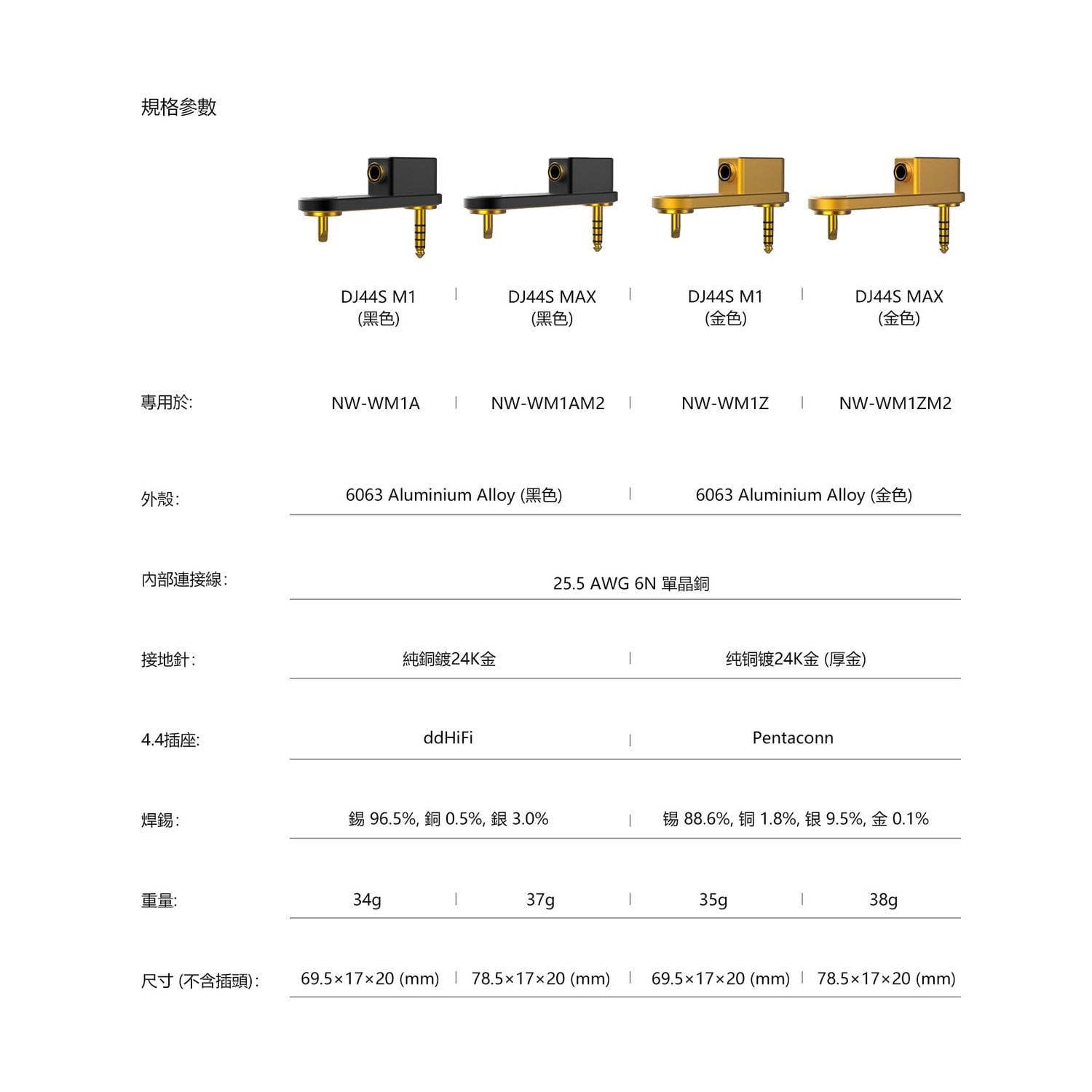 【接地升級 ~ DD Hifi DJ44S M1 & DJ44S MAX】 渾然一體,專機專用 純銅鍍24K金 + DD hifi 4.4插座 ~ 普通版 (黑色) 1. DJ44S M1 (專用於SONY NW-WM1A、NW-WM1Z) – HK$898 2. DJ44S MAX (專用於SONY NW-WM1AM2、NW-WM1ZM2) – HK$998 純銅鍍24K金 (厚金) + Pentaconn ~ 升級版 (金色) 3. DJ44S M1 (專用於SONY NW-WM1A、NW-WM1Z) – HK$1198 4. DJ44S MAX (專用於SONY NW-WM1AM2、NW-WM1ZM2) – HK$1398 不改變原聲音走向 焊接使用加粗型單晶銅連接線,無鉛含金焊錫*。 *焊錫品牌MUNDORF: Sn88.6%, Cu1.8%, Ag9.5%, Au0.1%. 1. SONY播放機的4.4插座 為什麼沒有接地? 常規的耳機線只有R+ R- L+ L-四條線,沒有使用4.4插頭的地線。 另一方面,4.4耳機插座接地後,拔插時有可能產生衝擊聲,也許基於這個 原因,索尼播放機沒有焊接4.4插座的地線。 2. 為什麼接地後的聲音會有提升? 有個前提條件,使用的4.4耳機線必須是帶有遮罩層並且正常接地的。 SONY的播放機,特別是NW-WM1Z和NW-WM1ZM2的外殼採用了 無氧銅鍍金材料,這種材料的純度高且導電性能強,可以起到很好 的接地遮罩效果。帶有遮罩的4.4耳機線連接後,播放機的外殼遮罩 和耳機線的遮罩接通,能更好的防止外部靜電感應或電磁感應的影響。 一體式接地設計,可靠、安全 SONY播放機的外殼和3.5插座的地線是相通的,DJ44S接地針比3.5mm 耳機插頭短很多,在保證了正常接地的同時,還能防止因為受力不平衡* 對插座造成的損壞。 *受力不平衡,是指插入或拔出轉接頭時角度傾斜,朝向一邊受力過大。由於3.5mm耳機插座是塑膠外殼, 這種情況下很有可能損壞插座。 規格參數 DJ44S M1 (黑色)/ DJ44S MAX (黑色)/ DJ44S M1 (金色)/ DJ44S MAX (金色) 專用於: NW-WM1A/ NW-WM1AM2/ NW-WM1Z/ NW-WM1ZM2 外殼:6063 Aluminium Alloy (黑色)/ 6063 Aluminium Alloy (金色) 內部連接線:25.5 AWG 6N 單晶銅 接地針:純銅鍍24K金/ 純銅鍍24K金 (厚金) 4.4插座: DD hifi/ Pentaconn 焊錫:錫 96.5%, 銅 0.5%, 銀 3.0%/ 锡 88.6%, 铜 1.8%, 银 9.5%, 金 0.1%. 重量: 34g/ 37g/ 35g/ 38g 尺寸 (不含插頭):69.5×17×20 (mm)/ 78.5×17×20 (mm)/ 69.5×17×20 (mm)/ 78.5×17×20 (mm)