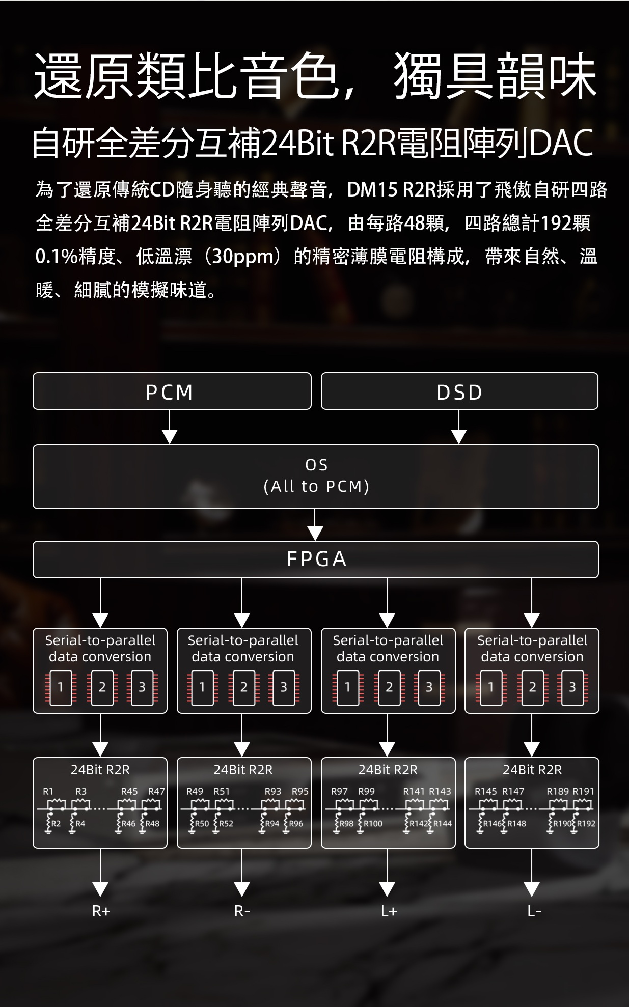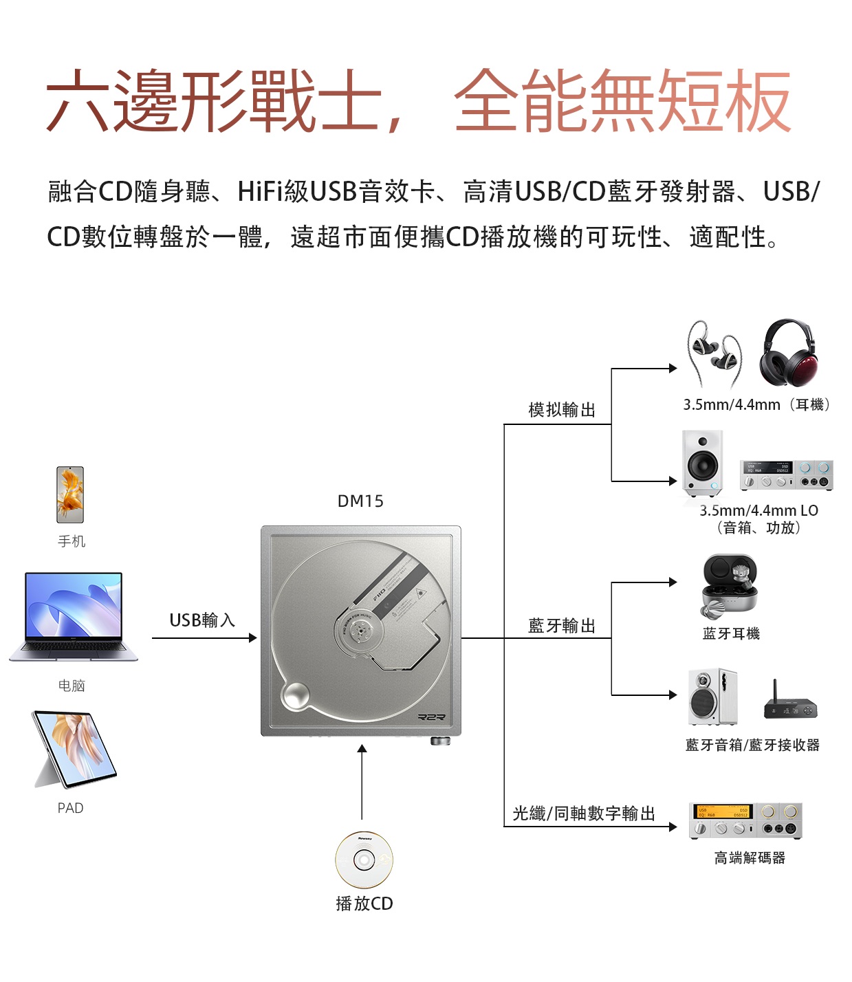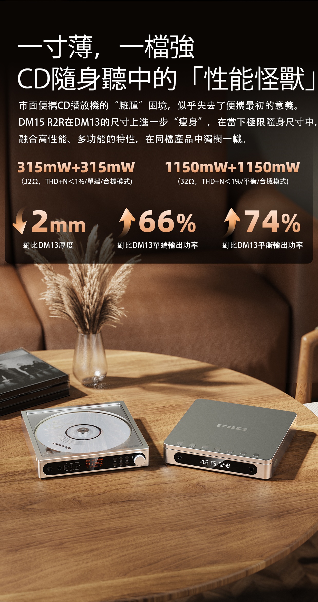 【真便攜,真HiFi ~ FiiO CD隨身聽DM15 R2R】 #一寸薄,一檔強 ~ CD隨身聽中的「性能怪獸」 DM13上市後,我們深入傾聽用戶回饋,汲取建議潛心打磨。 一年後,我們終於可以向大家呈現FiiO 全新便攜CD播放機。 ··· DM15 R2R,凝聚了FiiO 自主研發和CD技術深耕的最新成果, 不僅在DM13的尺寸上進一步“瘦身”,還融入了五大核心設計, 既結合了傳統CD隨身聽的類比音色,又增添了豐富的現代功能, 越級配置,獨到功能,簡易操控,精緻質感,這是FIIO全新力作。 FiiO DM15 R2R (便攜身歷聲CD播放機) 黑色 (現已開售) 銀色 (將於12月初開售) 紅色 (將於12月初開售) 白色 (將於12月底開售) 建議零售價: HK$1999 特點: 1. 五核心設計 ~ 全面升維 2. 還原類比音色,獨具韻味 ~ 自研全差分互補24Bit R2R電阻陣列DAC 3. 便攜/台機雙形態 ~ 1150mW + 1150mW強勁輸出 4. 全域BASS + EQ ~ 24種豐富音效 5. HiFi級USB/CD藍牙發射器 + 轉盤 6. HiFi級USB音效卡 ~ 出眾解碼 7. 支援USB抓軌功能 ~ 珍藏觸動心靈的旋律 8. 高通高端藍牙晶片 ~ 支援aptX/aptX Adaptive/aptX HD/SBC的高清藍牙發射 9. 機械推鈕/旋鈕/按鍵操控 10. 定制紅外遙控器 ~ 遠距離操控 11. 定制高清TFT顯示幕 ~ 輕鬆掌控音樂動態 12. 定制CD機專用機芯 ~ 穩定讀碟 13. 高壓鋰電池供電 ~ 隨身自由 14. ESP電子防震開關 15. 透明天窗設計 ~ 兼具顏值、實力 ==================== 1. 五核心設計,全面升維 DM15 R2R實現了更小體積、更強配置的結合和突破,隨身尺寸中採用五核心設計,CD伺服、USB DAC、R2R模組、藍牙模組各司其職,最終由獨立的MCU控制協調。核“芯”進化,全面升維,突破同檔產品的競爭力。 2. 還原類比音色,獨具韻味 自研全差分互補24Bit R2R電阻陣列DAC 為了還原傳統CD隨身聽的經典聲音,DM15 R2R採用了FiiO 自研四路 全差分互補24Bit R2R電阻陣列DAC,由每路48顆,四路總計192顆 0.1%精度、低溫漂(30ppm)的精密薄膜電阻構成,帶來自然、溫 暖、細膩的模擬味道。 3. 定制CD機專用機芯 穩定讀碟 DM13上市一年多時間,讀碟性能歷經數次升級優化,已有顯著提升。 DM15 R2R在此基礎持續進化,重金定制部分機芯模具,採用自回彈 式鋼制撥珠設計,取放碟片更加絲滑,且不易傷碟。 *DM15 R2R的讀碟能力與DM13新版固件相當。 *因便攜機芯結構限制,不能保證完美讀取所有CD碟片,未來將通過固件升級,持續優化讀碟性能。 *因機芯、碟片材料和錄製環境差異,少量大容量CD讀取時跳幀屬正常現象。 4. HiFi級USB音效卡 出眾解碼 USB音效卡功能,念念不忘,必有迴響。 在保證CD音質、設備相容的前提下,DM15 R2R實現了HiFi級USB聲 卡功能,支援384kHz/32bit以及DSD256的高取樣速率,搭配R2R電路, USB DAC輸出亦有韻味。 5. 高通高端藍牙晶片 輕鬆暢連,體驗升級 復古新呈,功能、體驗雙重進階。 搭載高通藍牙晶片QCC3095,支援aptX/aptX Adaptive/aptX HD/SBC 的高清藍牙發射。CD輸入和USB輸入均支援藍牙發射,全新視覺化介面, 讓藍牙設備配對連接一目了然。 *個別品牌藍牙協議存在差異,還請在接收端設置好所需藍牙編碼再連接。 6. 一寸薄,一檔強 CD隨身聽中的「性能怪獸」 市面便攜CD播放機的“臃腫”困境,似乎失去了便攜最初的意義。 DM15 R2R在DM13的尺寸上進一步“瘦身”,在當下極限隨身尺寸中, 融合高性能、多功能的特性,在同檔產品中獨樹一幟。 315mW+315mW (32Ω,THD+N<1%/單端/台機模式) 1150mW+1150mW (32Ω,THD+N<1%/平衡/台機模式) 下降2mm 對比DM13厚度 上升66%對比DM13單端輸出功率 上升74%對比DM13平衡輸出功率 7. 全域BASS+EQ 24種豐富音效 配備3擋BASS音效,以及8種內置EQ,組合搭配高達24種豐富音效, 還特調了RETRO(復古)音效,滿滿類比復古味。 *選擇BASS或EQ後,輸出會有變化,請適當調整音量。 8. 六邊形戰士,全能無短板 融合CD隨身聽、HiFi級USB音效卡、高清USB/CD藍牙發射器、USB/ CD數位轉盤於一體,遠超市面便攜CD播放機的可玩性、適配性。 9. 高清TFT顯示幕 輕鬆掌控音樂動態 沿用經典產品復古UI主題設計,現代與復古交融,觀感、顯示俱佳, 能清晰、直觀顯示電量、工作模式、EQ、取樣速率,藍牙連接列表等 資訊,讓你輕鬆掌控音樂動態,增添聽音樂趣。 10. 復古機械交互 奏響美好樂章 煥然一新的復古設計,融入了機械推鈕、按鍵、旋鈕的真實交互,操 控簡易,上手簡單。更重要的是,每一次操控的真實觸感回饋,讓你 從視覺、觸覺、聽覺中,全方位感受聆聽CD的美好。 11. 支援USB抓軌功能 珍藏觸動心靈的旋律 支援邊聽歌邊抓軌,可以將喜愛的CD以WAV格式珍藏至移動存儲 設備*,還能與好友分享那份觸動心靈的旋律。 *僅支援FAT32格式的移動存放裝置。 *僅支援CDDA格式的音樂抓軌。推薦容量為32G及以下的Type-C介面的U盤進行升級或抓軌。 12. 便攜/台機雙形態 雙重體驗 專利台機模式,電池保護專家 隔離電池作為台機使用,無懼大功率輸出耗電,還有效減少電池充放 電迴圈次數,延長電池壽命。 *當電池電量為0%強制關機後,無論是否處於台機模式,都將啟動電池充電,以保護電池。 專利號:ZL202321946664.8 13. 標配紅外遙控器 遠距離操控,可以使用紅外遙控器遠端操控,更便捷,更貼心。 14. 高壓鋰電池供電 隨身自由 精選4700mAh、3.85V的純鈷高壓鋰電池,為DM15 R2R注入澎湃 動力。隨身聆聽可以連續播放約7小時*,輕鬆應對長時間的聽音需 求,無需擔心續航問題。 *資料來自FiiO 實驗室,請以實際使用為准。實際情況會因測試環境和測試條件等不同略有差異。 4700mAh電池容量 3