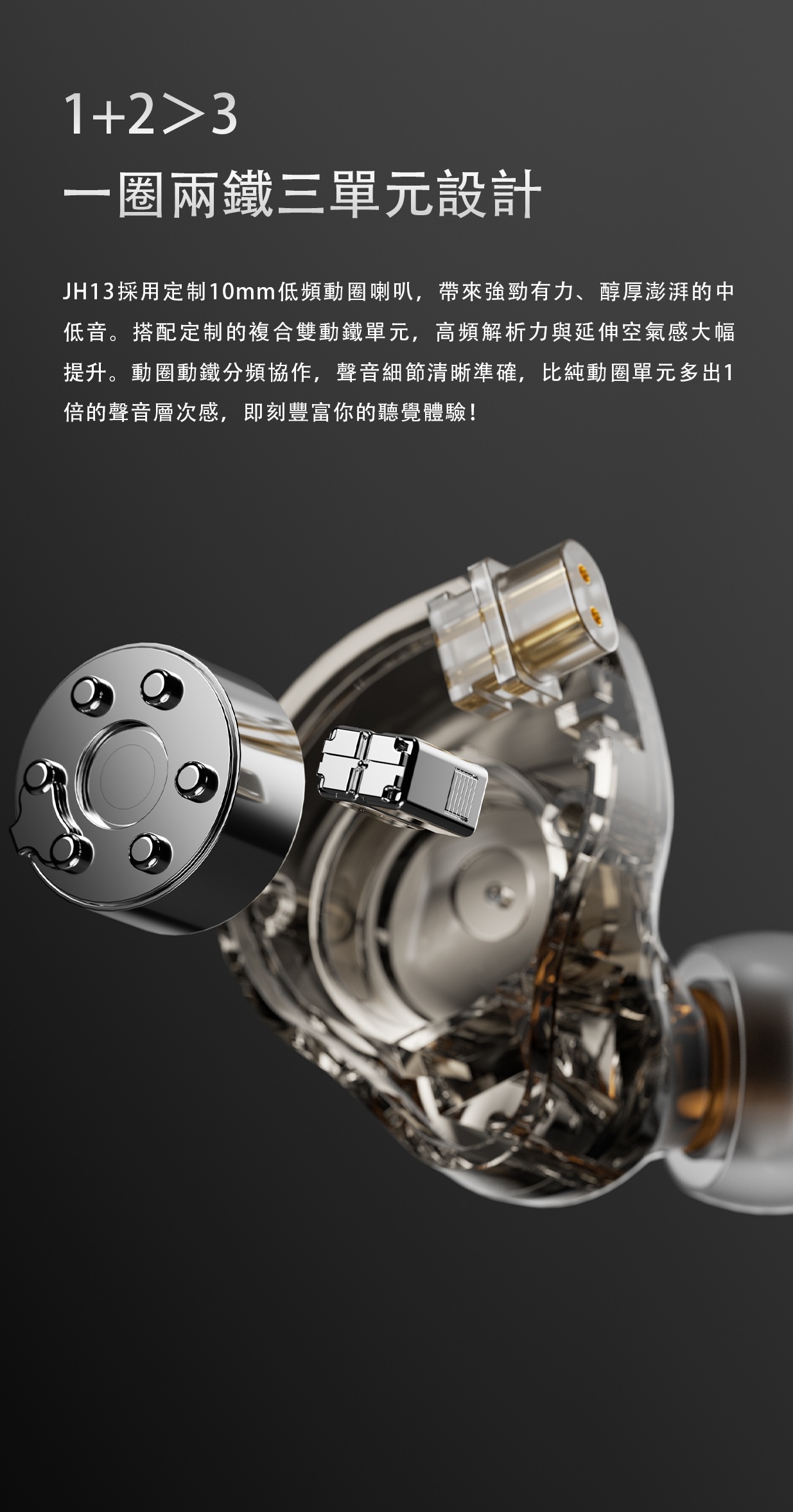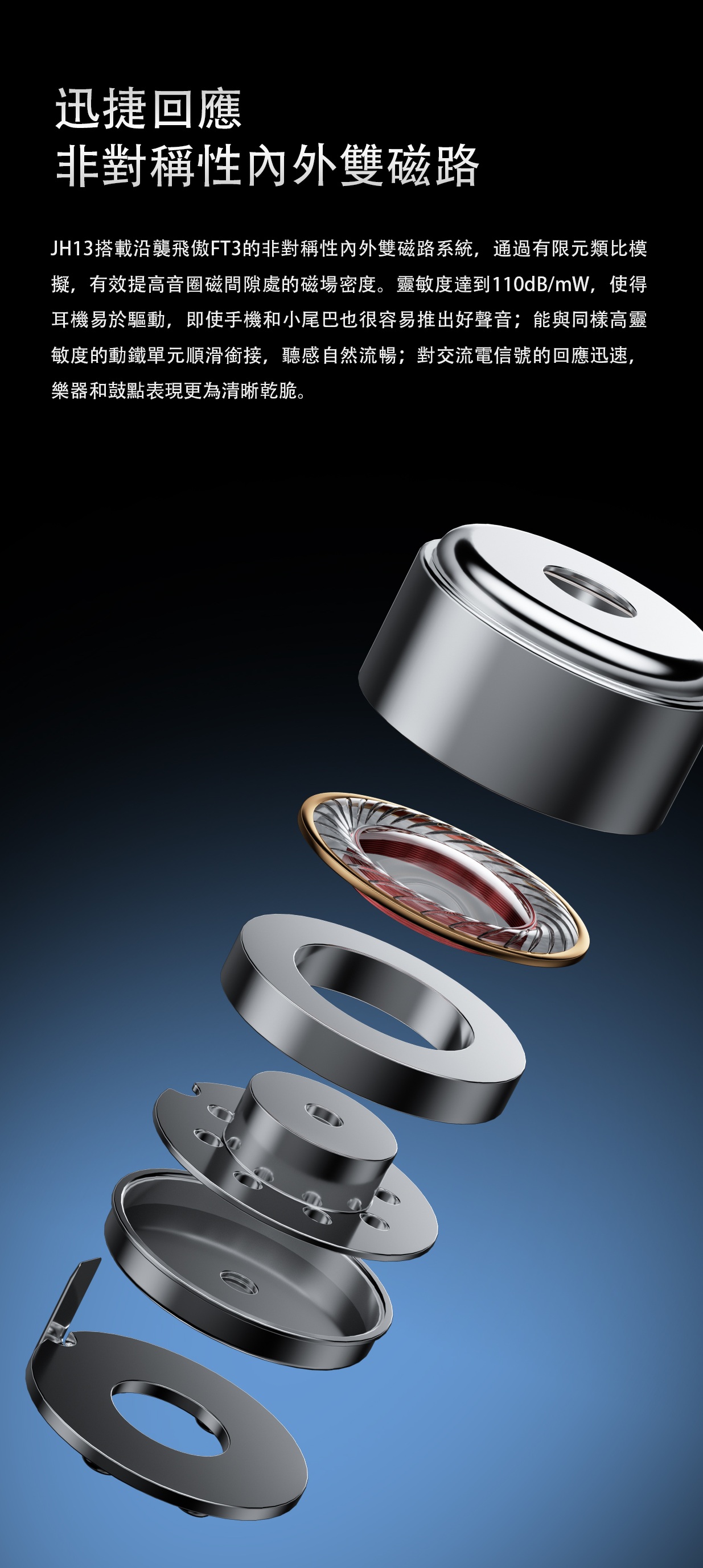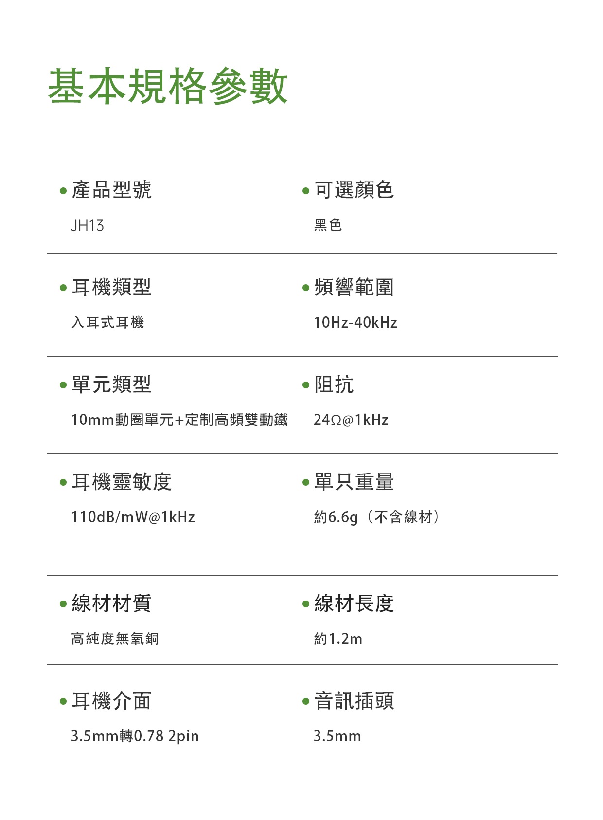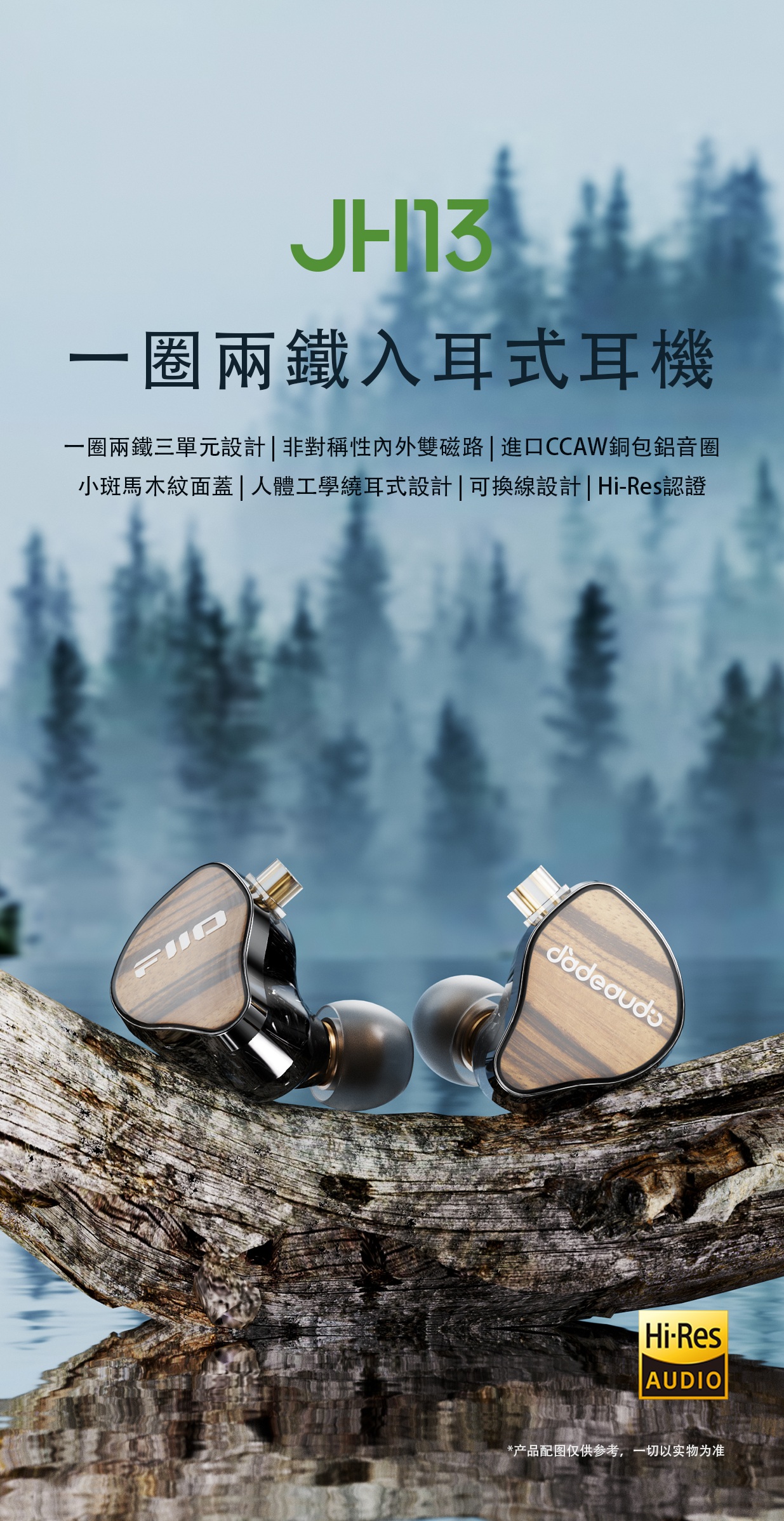 【超抵玩之選 ~ 一圈兩鐵三單元 ~ FiiO Jade audio JH13】 FiiO Jade audio JH13 (一圈兩鐵入耳式耳機) 建議零售價: HK$299 核心亮點: 1. 一圈兩鐵三單元 ~ 聽見每一層細節 2. 非對稱性內外雙磁路 ~ 迅疾回應 3. 進口CCAW銅包鋁音圈 ~ 輕巧有力 4. 小斑馬木紋面蓋 ~ 真實木質肌理 5. 繞耳式設計 ~ 符合人體工學 6. 可換線設計 ~ 高拓展性 7. Hi-Res認證 ~ 權威音質 ==================== 1. 1+2>3 一圈兩鐵三單元設計 JH13採用定制10mm低頻動圈喇叭,帶來強勁有力、醇厚澎湃的中低音。搭配定制的複合雙動鐵單元,高頻解析力與延伸空氣感大幅提升。動圈動鐵分頻協作,聲音細節清晰準確,比純動圈單元多出1倍的聲音層次感,即刻豐富你的聽覺體驗! 2. 迅捷回應 非對稱性內外雙磁路 JH13搭載沿襲飛傲FT3的非對稱性內外雙磁路系統,通過有限元類比模擬,有效提高音圈磁間隙處的磁場密度。靈敏度達到110dB/mW,使得耳機易於驅動,即使手機和小尾巴也很容易推出好聲音;能與同樣高靈敏度的動鐵單元順滑銜接,聽感自然流暢;對交流電信號的回應迅速,樂器和鼓點表現更為清晰乾脆。 3. 輕巧有力 進口CCAW銅包鋁音圈 耳機搭載了日本大黑公司生產的高性能CCAW音圈。線芯的直徑只有0.033mm,細如髮絲,相比純銅音圈,鋁音圈能夠減輕振動系統的重量,在振動時具有更快的回應速度,使高頻更為明亮通透,細節更為豐富,樂器、鼓點表現更為清晰、乾脆。 4. 賞心悅「木」 小斑馬木紋面蓋 耳機的面蓋採用了小斑馬木原木,每一對耳機都是天然的藝術品,擁有自然長成、深淺交錯的條紋,盡顯復古質感。木材具有良好的硬度和穩定性,能夠持久可靠地使用。 5. 有跡可循的動聽 我們潛心打造的JH13耳機,通過精密的物理結構與電子分頻,將不同單 元的優勢完美整合,實現了音質的極致順滑。它既有動圈產品深邃的低 頻表現,亦有動鐵產品的細膩解析;既保留了高頻的空氣感,在聽笛子、 鑔,吉他等金屬樂器時具有豐富的泛音,又削弱了人聲換氣聲帶來的齒音, 實現多面性與耐聽度的融合。 6. 舒享純音 人體工學繞耳式設計 特製的繞耳式結構將耳機本體牢固安置在耳道內,又能分散對耳道的壓 力,佩戴穩定舒適;緊貼耳廓的線材能減少晃動和摩擦,有效消除傳統 入耳式耳機常有的“聽診器效應”,為您提供更為純淨、清晰的聲音。 7. 可換線設計 拓展更多玩法 耳機採用高純度的無氧銅線,共四股120芯,品質優良;可換線設計,更 多前端随心搭配;插头为通用的3.5mm转0.78mm 2pin插头,外包式设计, 保护脆弱的插针,让线材与耳机的连接更为紧密。 高純度無氧銅線 4股120芯 傳輸穩定 可換線設計 支持更換 搭配便捷 外包式插頭 保護插針 連接牢靠 8. 權威音質 Hi-Res小金標認證 JH13已獲得行業認可的Hi-Res小金標認證,確保其能夠為您提供高 標準的音訊呈現。 包裝清單: 1. 耳機主體*1 2. 耳機套*3對(S/M/L) 3. 快速入門指南*1本 4. 3.5mm介面耳機線*1條 基本規格參數: 產品型號: JH3 可選顏色: 黑色 耳機類型: 入耳式耳機 頻響範圍: 10Hz-40kHz 單元類型: 10mm動圈單元+定制高頻雙動鐵 阻抗: 24Ω@1kHz 耳機靈敏度: 110dB/mW@1kHz 單只重量約: 6.6g(不含線材) 線材材質: 高純度無氧銅 線材長度: 約1.2m 耳機介面: 3.5mm轉0.78 2pin 音訊插頭: 3.5mm