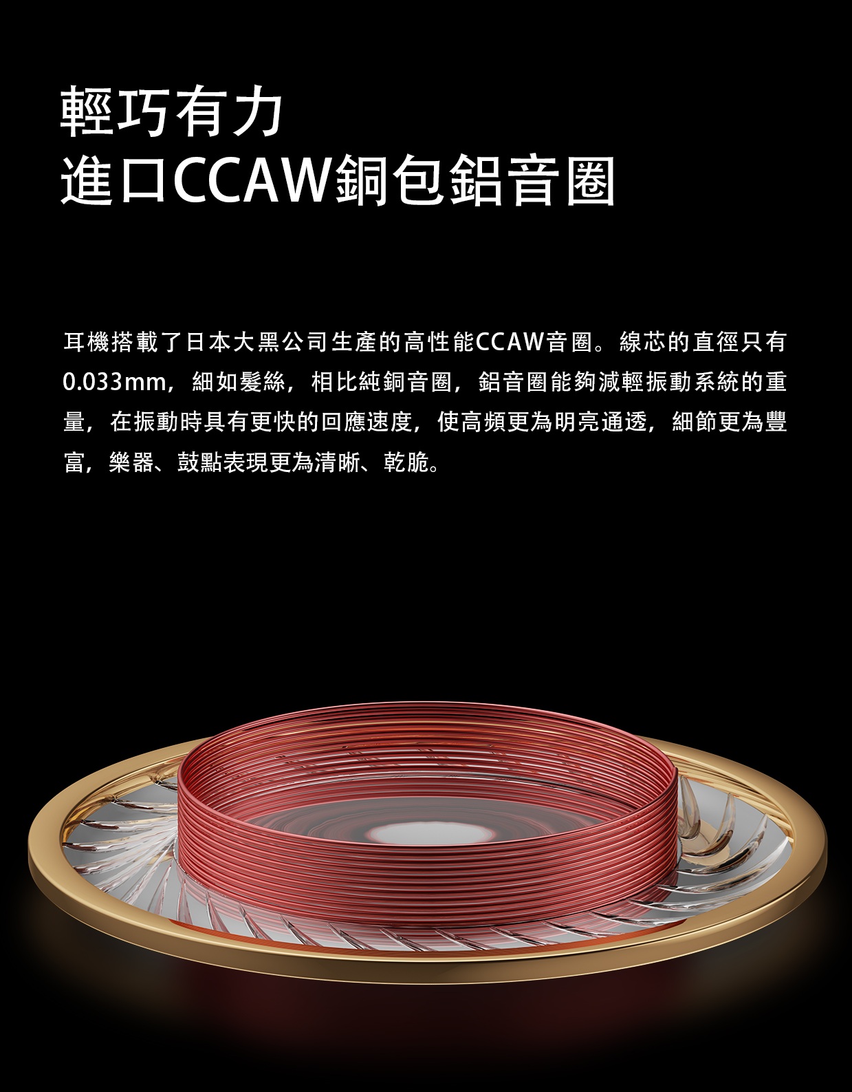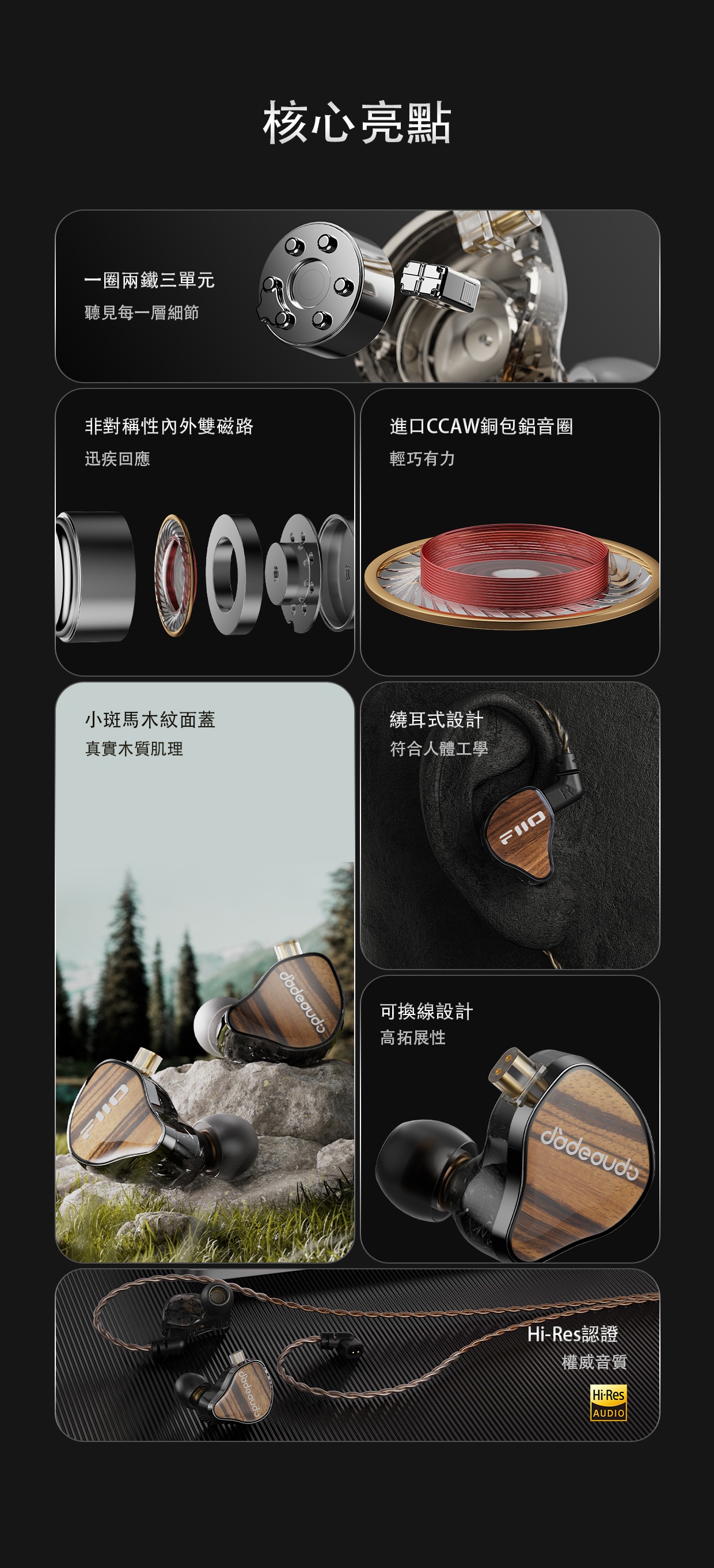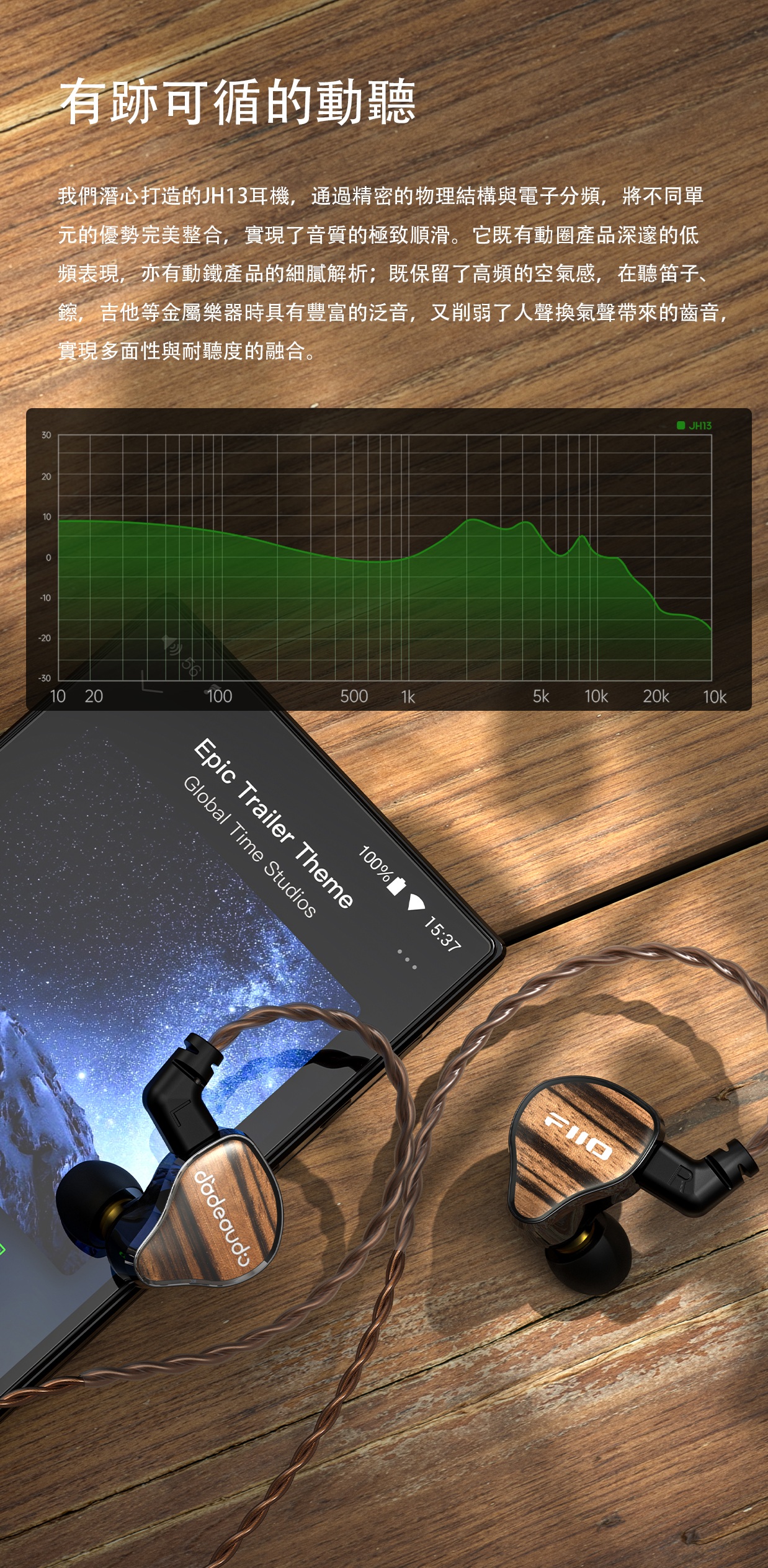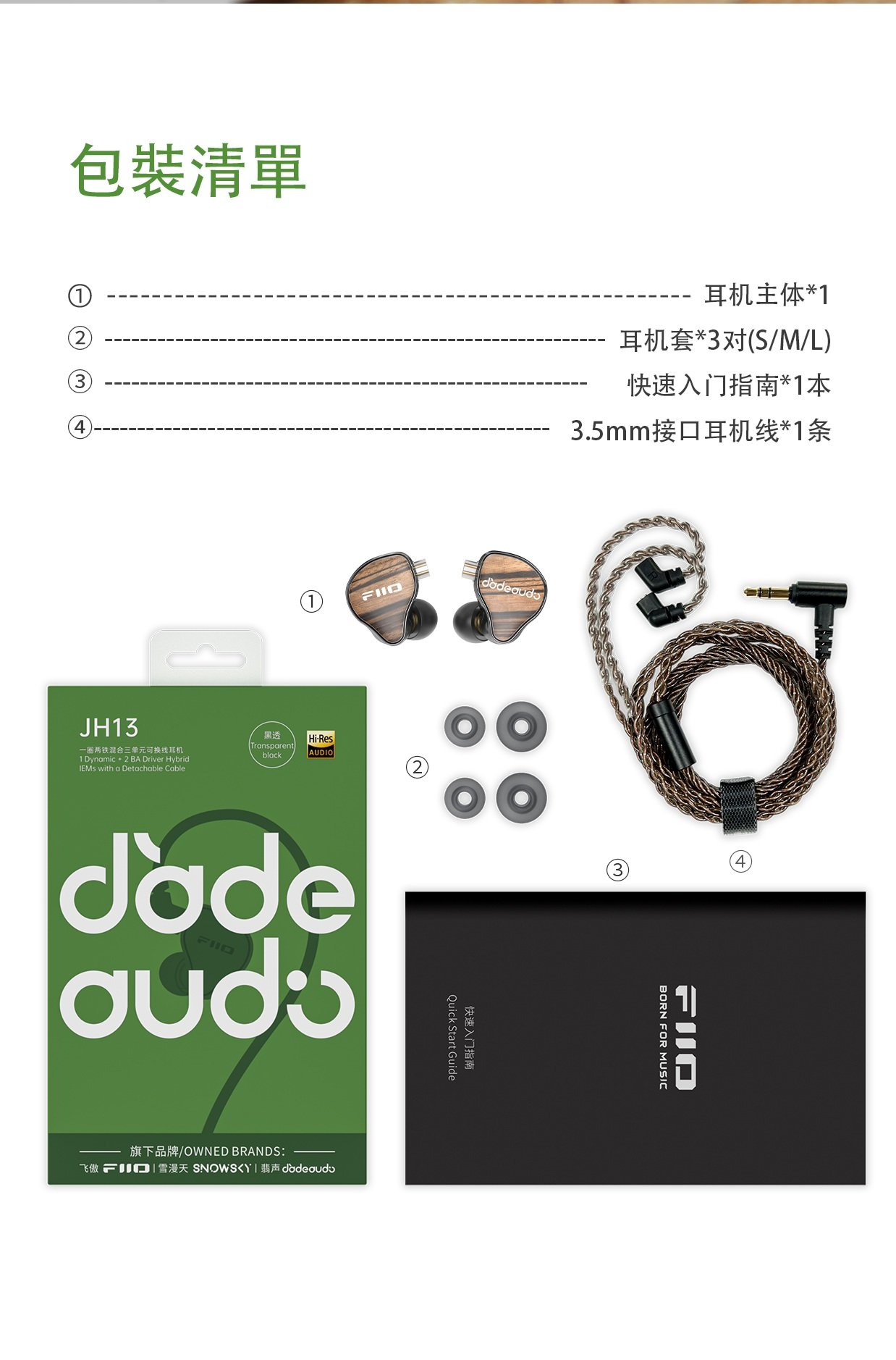 【超抵玩之選 ~ 一圈兩鐵三單元 ~ FiiO Jade audio JH13】 FiiO Jade audio JH13 (一圈兩鐵入耳式耳機) 建議零售價: HK$299 核心亮點: 1. 一圈兩鐵三單元 ~ 聽見每一層細節 2. 非對稱性內外雙磁路 ~ 迅疾回應 3. 進口CCAW銅包鋁音圈 ~ 輕巧有力 4. 小斑馬木紋面蓋 ~ 真實木質肌理 5. 繞耳式設計 ~ 符合人體工學 6. 可換線設計 ~ 高拓展性 7. Hi-Res認證 ~ 權威音質 ==================== 1. 1+2>3 一圈兩鐵三單元設計 JH13採用定制10mm低頻動圈喇叭,帶來強勁有力、醇厚澎湃的中低音。搭配定制的複合雙動鐵單元,高頻解析力與延伸空氣感大幅提升。動圈動鐵分頻協作,聲音細節清晰準確,比純動圈單元多出1倍的聲音層次感,即刻豐富你的聽覺體驗! 2. 迅捷回應 非對稱性內外雙磁路 JH13搭載沿襲飛傲FT3的非對稱性內外雙磁路系統,通過有限元類比模擬,有效提高音圈磁間隙處的磁場密度。靈敏度達到110dB/mW,使得耳機易於驅動,即使手機和小尾巴也很容易推出好聲音;能與同樣高靈敏度的動鐵單元順滑銜接,聽感自然流暢;對交流電信號的回應迅速,樂器和鼓點表現更為清晰乾脆。 3. 輕巧有力 進口CCAW銅包鋁音圈 耳機搭載了日本大黑公司生產的高性能CCAW音圈。線芯的直徑只有0.033mm,細如髮絲,相比純銅音圈,鋁音圈能夠減輕振動系統的重量,在振動時具有更快的回應速度,使高頻更為明亮通透,細節更為豐富,樂器、鼓點表現更為清晰、乾脆。 4. 賞心悅「木」 小斑馬木紋面蓋 耳機的面蓋採用了小斑馬木原木,每一對耳機都是天然的藝術品,擁有自然長成、深淺交錯的條紋,盡顯復古質感。木材具有良好的硬度和穩定性,能夠持久可靠地使用。 5. 有跡可循的動聽 我們潛心打造的JH13耳機,通過精密的物理結構與電子分頻,將不同單 元的優勢完美整合,實現了音質的極致順滑。它既有動圈產品深邃的低 頻表現,亦有動鐵產品的細膩解析;既保留了高頻的空氣感,在聽笛子、 鑔,吉他等金屬樂器時具有豐富的泛音,又削弱了人聲換氣聲帶來的齒音, 實現多面性與耐聽度的融合。 6. 舒享純音 人體工學繞耳式設計 特製的繞耳式結構將耳機本體牢固安置在耳道內,又能分散對耳道的壓 力,佩戴穩定舒適;緊貼耳廓的線材能減少晃動和摩擦,有效消除傳統 入耳式耳機常有的“聽診器效應”,為您提供更為純淨、清晰的聲音。 7. 可換線設計 拓展更多玩法 耳機採用高純度的無氧銅線,共四股120芯,品質優良;可換線設計,更 多前端随心搭配;插头为通用的3.5mm转0.78mm 2pin插头,外包式设计, 保护脆弱的插针,让线材与耳机的连接更为紧密。 高純度無氧銅線 4股120芯 傳輸穩定 可換線設計 支持更換 搭配便捷 外包式插頭 保護插針 連接牢靠 8. 權威音質 Hi-Res小金標認證 JH13已獲得行業認可的Hi-Res小金標認證,確保其能夠為您提供高 標準的音訊呈現。 包裝清單: 1. 耳機主體*1 2. 耳機套*3對(S/M/L) 3. 快速入門指南*1本 4. 3.5mm介面耳機線*1條 基本規格參數: 產品型號: JH3 可選顏色: 黑色 耳機類型: 入耳式耳機 頻響範圍: 10Hz-40kHz 單元類型: 10mm動圈單元+定制高頻雙動鐵 阻抗: 24Ω@1kHz 耳機靈敏度: 110dB/mW@1kHz 單只重量約: 6.6g(不含線材) 線材材質: 高純度無氧銅 線材長度: 約1.2m 耳機介面: 3.5mm轉0.78 2pin 音訊插頭: 3.5mm