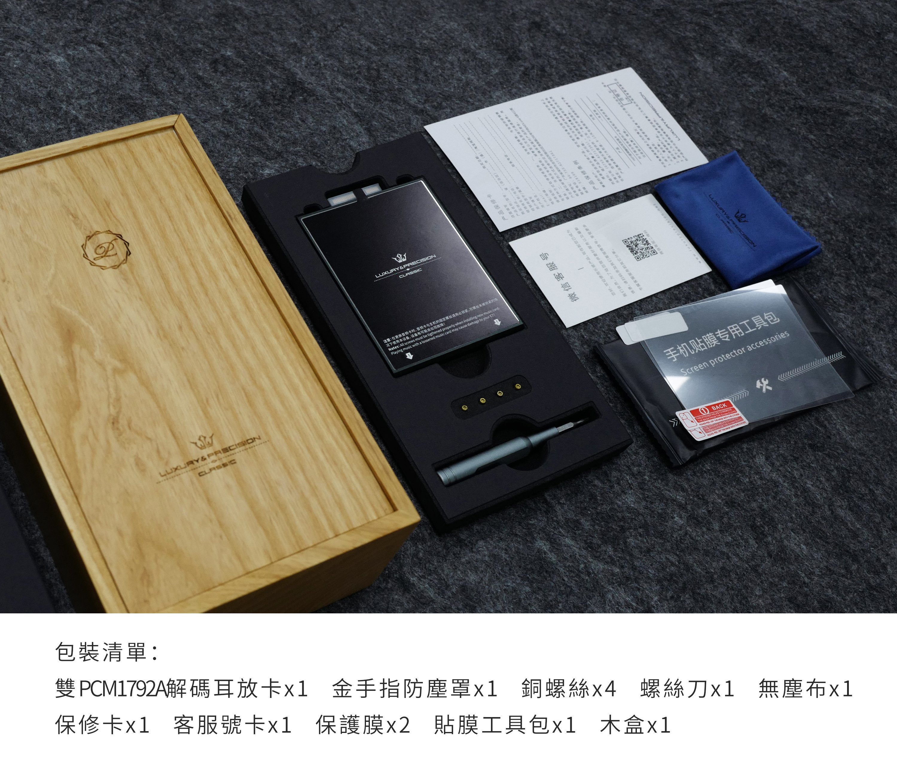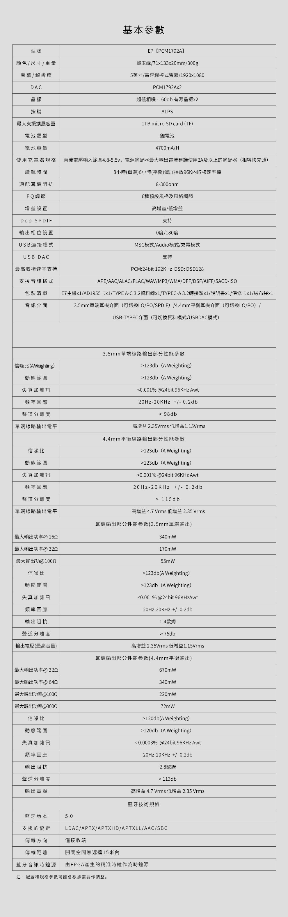 【雙PCM1792A ~ L&P 全新7系列插卡式旗艦DAP ~ E7 (雙PCM1792A)】 #隨身E時代 #更甜更潤 #暖甜到更甜 #單端火力全開 #經典旗艦DAC #為EA4特調LO E7 雙PCM1792A解碼耳放插卡 換卡設計的一大好處在於,原有機型用家只需單獨購買新卡,能省去一大部分購機預算。 Model: 1. 雙PCM1792A插卡 建議零售價: HK$7999 為感謝E7 4497/AD1955系列版本使用者支援特別優惠價為HK$5999 隨機附贈替換工具螺絲刀和備用螺絲 2. E7搭配雙PCM1792A卡整機 建議零售價: HK$28888 有一種「甜」叫1792 ~ E7雙PCM1792A插卡 經過AK4497、AD1955,E7終於迎來第三張音訊卡 ~ PCM1792A,內置兩顆PCM1792A DAC。 AK4497→AD1955→PCM1792A,「全名芯陣容」 AK4497和AD1955分別是AKM和ADI的經典旗艦晶片,PCM1792A同樣是大名鼎鼎的Ti旗艦芯,堪稱 最能代表Ti調音風格的DAC,以此構成E7 Delta-Sigma架構的「全名芯陣容」。通過不同的音訊卡,讓這些曾經輝煌、如今難得一見的經典晶片重現新聲,既是對黃金時代的致敬,也能讓新一批燒友聽到獨特的動人調音。這是E7使用可換卡設計的精髓所在。 125dB→123dB,「暖甜到更甜」 作為老一代DS晶片裡的「性能王」,使用PCM1792A的機型可實現極高的動態範圍,但達到該性能的都是臺式解碼,在±15V供電 輸出9Vrms情況下才能實現,如此高的供電和輸出電壓放在便攜機上只有 “秀肌肉” 的作用,實際應用中直接套用官方電路即不現實也不好用,更不好聽,首先過高的電壓可攜式裝置的續航撐不住,過高的模擬輸出並不適合可攜式裝置,需要大幅衰減信號,這會白白丟失不少細節,於是第一版的樣機我們在權衡了功耗與性能之後將IV供電電壓改為±5.8V,輸出降低為5.2Vrms,此時的動態範圍為125dB。 展會試聽版 在之後的展會中,這版E7經過了多輪試聽,大部分燒友認為音色夠甜,但還有少部分覺得還可以更甜。於是,這段時間我們又進行了些調試,包括驗證音訊卡在±15V供電基本按官方電路能否達到PCM1792A動態標稱性能,並得出結論:即使性能再高也無法給暖甜音色加分。在此基礎上,我們著力調整了聽感,重打了兩版PCB,最終的量產版本調整為IV和運放為非對稱供電,整機動態範圍調整至123dB,輸出降低至4.7Vrms,由此獲得了「更甜更潤」的最終版調音。 驗證音訊卡LAYOUT設計的極限性能 另外PCM1792A新卡單端也是火力全開的,而且依舊有專為EA4優化的LO特調輸出選項。 基本參數: 型號: E7 【PCM1792A】 顏色/尺寸/重量: 墨玉綠/ 71x133x20mm/ 300g 螢幕/ 解析度: 5英寸/ 電容觸控螢幕/ 1920 × 1080 DAC: PCM1792A x 2 品振: 超低相噪 -160db有源晶振 ×2 按鍵: ALPS 最大支援擴展容量1TB micro SD card (TF) 電池類型: 鋰電池 電池容量: 4700mA/H 使用充電器規格: 直流電壓輸入範圍4.8-5.5v,電源適配器最大輸出電流建遞使用2A及以上的適配器(相容快充頭) 續航時間: 8小時(單端)6小時(平衡)滅屏播放96K內取樣速率檔 適配耳機阻抗: 8-300ohm EQ調節: 6種預設風格及風格調節 增益設置: 高增益/低增益 Dop SPDIF: 支持 輸出相位設置: 0度/180度 USB連接模式: MSC模式/ Audio模式/ 充電模式 USB DAC: 支持 最高取樣速率支援: PCM:24bit 192KHz DSD:DSD128 支援音訊格式: APE/AAC/ALAC/FLAC/WAV/MP3/WMA/DFF/DSF/AIFF/SACD-ISO 包裝清單: E7主機x1/PCM1792A卡×1/TYPEA-C3.2資料×1/TYPEC-A3.2轉接頭x1/說明者x1/保修卡x1/線布袋×1 音訊介面: 3.5mm單端耳機介面(可切換LO/PO/SPDIF)/4.4mm平衡耳機介面(可切換LO/PO) USB-TYPEC介面(可切換資料模式/USBDAC模式) 3.5mm單端線路輸出部分性能參數 信噪比(AWeighting): >123db (A Weighting) 動態範圍: >123db (A Weighting) 失真加雜訊: <0.001%@24bit96KHzAwt 頻率回應: 20Hz-20KHz+/-0.2db 聲道分離度: >98db 單端線路輸出電平: 高增益2.35Vrms低增益1.15Vrms 4.4mm平衡線路輸出部分性能參敷 信噪比: >123db (A Weighting) 動態範圍: >123db (A Weighting) 失真加雜訊: 0.001%@24bit 96KHzAwt 頻率回應: 20Hz-20KHz+/-0.2db 聲道分離度: >115db 單端線路輸出電平: 高增益4.7Vrms低增益2.35Vrms 耳機輸出部分性能參數(3.5mm單端輸出) 最大輸出功率@160Ω: 340mW 最大輸出功率@32Ω: 170mW 最大輸出功@100Ω: 55mW 信噪比: >123db(A Weighting) 動態範圍: >123db (A Weighting) 失真加雜訊: <0.001%@24bit96KHzAwt 頻率回應: 20Hz-20KHz+/-0.2db 翰出阻抗: 1.4歐姆 聲道分離度: >75db 輸出電壓(最高音量): 高增益2.35Vrms低增益1.15Vrms 耳機輸出部分性能參數(4.4mm平衡輸出) 最大輸出功率@32Ω: 670mW 最大輸出功率@64Ω: 340mW 最大輸出功率@100Ω: 220mW 最大輸出功率@300Ω: 72mW 信噪比: >120db(A Weighting) 動態範圍: >120db (A Weighting) 失真加雜訊: <0.0003%@24bit96KHzAwt 頻率回應: 20Hz-20KHz+/-0.2db 輸出阻抗: 2.8歐姆 聲道分離度: >113db 輸出電壓: 高增益4.7Vrms低增益2.35Vrms 藍牙技術規格 藍牙版本: 5.0 支援的協定: LDAC/APTX/APTXHD/APTXLL/AAC/SBC 傅輸方向: 僅接收端 傅輸距離: 開闊空間無遮擋15米內 藍牙音訊時鍾源: 由FPGA產生的精准時鐘作為益時鐘源 注:配置和規格參數可能會根據需要作調整。 手機貼膜專用工具包 包裝清單: 雙PCM1792A解碼耳放卡 × 1 金手指防塵罩 × 1 銅螺絲 × 4 螺絲刀 ×1 無塵布 × 1 保修卡 × 1 客服號卡 × 1 保護膜 × 2 貼膜工具包 × 1 木盒 × 1
