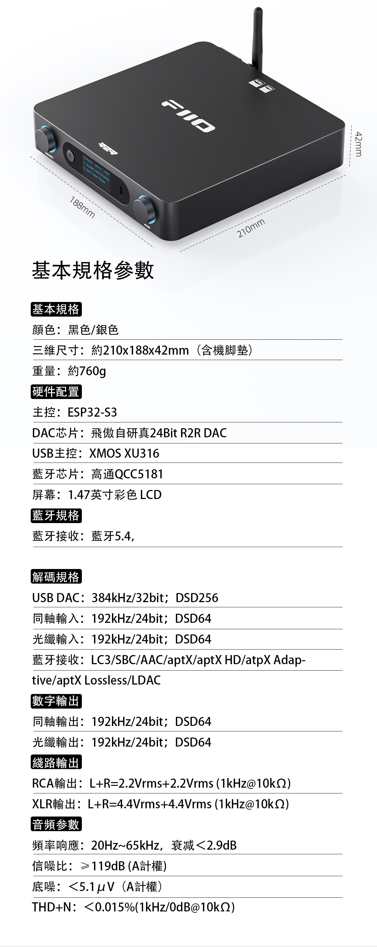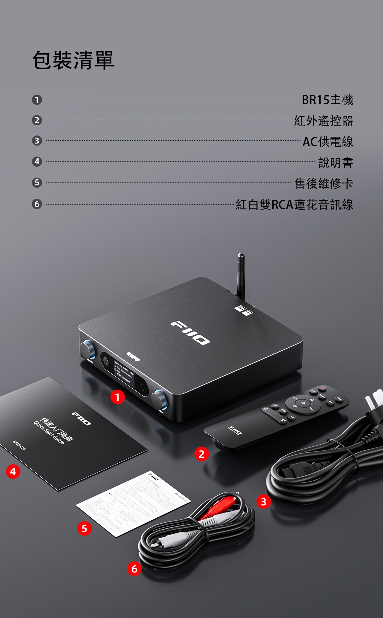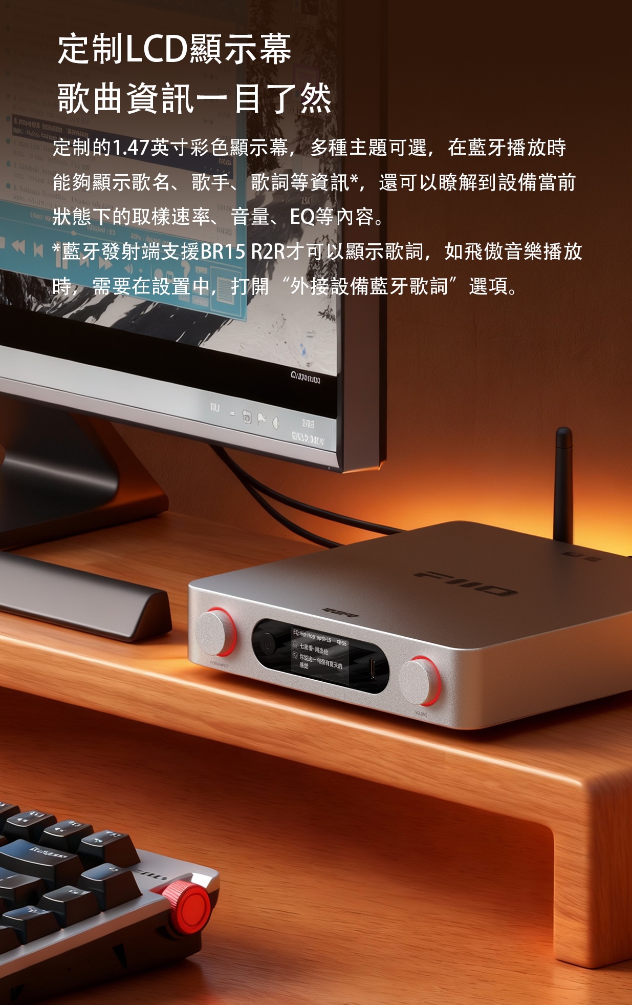 【高清藍牙音訊接收器 ~ FiiO BR15 R2R香港版】 不受「 線 」制 無線HiFi 為音箱、功放升級藍牙連接功能, 無損藍牙,自由聆聽,不受“線”制, 暢聽高品質無線音訊的舒爽體驗 FiiO BR15 R2R (高清藍牙音訊接收器) 香港版 顏色:黑色/ 銀色 建議零售價: HK$1699 特點: 1. 高通旗艦藍牙晶片QCC5181,藍牙5.4 2. 支持LDAC,aptX Lossless無損藍牙 3. 全差分互補24Bit R2R 電阻陣列 4. NOS/ OS雙模式 5. 藍牙/USB/光纖/同軸解碼 6. 2組RCA + 1組XLR線路輸出 7. 光纖 + 同軸數位輸出 8. 全域10段PEQ調節 9. AC/ DC雙供電 10. 標配紅外遙控器 ==================== 1. 暢享CD級無損音質 高通旗艦藍牙晶片QCC5181 搭載高通旗艦藍牙晶片QCC5181,符合LE Audio標準並高達2.1Mbps頻寬傳輸能力,支援aptX Adaptive系統中的Lossless規格,藍牙也能達到CD級無損音質,還原動聽細節,仿佛置身於現場。 2. 讓你的音箱/功放「 如虎添翼 」 aptX Lossless無損藍牙、LDAC 讓你的音箱/功放升級支援aptX Lossless無損藍牙、LDAC、aptX Adaptive 96kHz/24bit,追劇觀影,聽歌娛樂,耳目一新! 3. 藍牙5.4,連接新境界 高性能,低功耗,配合獨立外置天線的加持,傳輸距離更遠,抗干擾能力更強,延遲更低,連接更穩定,無線更自由。 4. 全差分互補24Bit R2R 電阻陣列 NOS/OS雙模式,雙重樂趣 飛傲自研四路全差分互補24Bit R2R電阻陣列DAC,由每路48顆,四路總計192顆0.1%精度、低溫漂(30ppm)的精密薄膜電阻構成,帶來獨具韻味的音質表現。相較非互補架構R2R電阻,BR15 R2R採用的互補架構,雜訊更低,FFT諧波分量更少,音樂背景更黑。 全域升頻高達384kHz的高取樣速率*,音訊指標更優秀,音質更為細膩、清晰。 *OS過採樣模式可以自訂取樣速率,出廠設置默認192kHz。 *BR15支援1Bit DSD硬解模式。播放DSD曲目時音量稍小屬正常現象,建議將音量調至正常 聽音音量值。此模式下,功能表SAM:OS不生效。 *不同模式下,實際感受隨各種主、客觀因素因人而異,以個人試聽體驗為准。 5. 藍牙/USB/SPDIF解碼 多場景自由切換 支援藍牙、USB、SPDIF(同軸/光纖)輸入,一機多能,相容手機、電腦、CD機、電視、DVD等設備,輕鬆為你打造全新的無線HiFi音訊系統。 藍牙解碼 手機藍牙+BR15 R2R+K15+耳機 USB解碼 手機USB+BR15 R2R+K11/K9+耳機 SPDIF解碼 AirPlay+SR11+BR15 R2R+功放+無源音箱+遙控器 6. 豐富輸出介面,輕鬆適配你的設備 配備2組RCA+1組XLR類比線路路輸出介面,以及光纖、同軸數位輸出介面,無論是有源音箱、解碼器還是功放,都能輕鬆連接,滿足各種設備搭配需求。 7. 全域10段PEQ調節 AUTO EQ,懶人福音 所有工作模式下都支援十段PEQ調節,通過飛傲自主研發的調節演算法和APP,不僅可以使用內置的復古、流行等多種預設調音,還可以模擬或修正耳機/音箱的頻響曲線,並支援匯出、導入、分享、保存EQ曲線,輕鬆玩轉調音。 手動微調過於專業?AUTO EQ以及預設音效助你輕鬆上手。AUTO EQ只需上傳/選擇耳機原始資料以及目標耳機曲線,就能實現多樣化的聽音體驗。 *開啟PEQ時,最高支持PCM 192kHz/24bit取樣速率的調節。 8. 全平衡音訊電路 從R2R DAC、LPF、音量調節全程採用全差分信號處理,具備抗干擾、低失真、大動態的特性;還配備POP音消除系統,確保音訊電路的專業性和可靠性。 9. AC/DC雙供電設計 內置高品質開關電源,電源更純淨;還配置了外部DC電源介面*,可搭配更高性能的線性電源使用,體驗不同的聲音表現。 *外置DC供電請選擇5V輸出電流≥2A,5.5*2.1mm介面的電源。 *接入DC電源後自動切換,優先DC供電。 10. 定制LCD顯示幕 歌曲信息一目了然 定制的1.47英寸彩色顯示幕,多種主題可選,在藍牙播放時能夠顯示歌名、歌手、歌詞等資訊*,還可以瞭解到設備當前狀態下的取樣速率、音量、EQ等內容。 *藍牙發射端支援BR15 R2R才可以顯示歌詞,如飛傲音樂播放時,需要在設置中,打開“外接設備藍牙歌詞”選項。 11. 近可調節,遠可遙控 輕鬆掌控你的音樂世界 延續極簡科技的家族設計,雙旋鈕操控+顯示幕,桌面等近距離操控更加方便;標配紅外遙控器,還支援FIIO CONTROL APP控制,遠距離聆聽大系統,遙控更加得心應手。 12. 雙Hi-Res金標認證,音質更有保障 BR15 R2R已經通過Hi-Res Audio/Hi-Res Audio Wireless的雙重金標認證,有線無線,音質都很線上。 包裝清單: 1. BR15主機 2. 紅外遙控器 3. AC供電線 4. 說明書 5. 售後維修卡 6. 紅白雙RCA蓮花音訊線 基本規格參數: 基本規格 顏色:黑色/銀色 三維尺寸:約210x188x42mm(含機腳墊) 重量:約760g 硬體設定 主控:ESP32-S3 DAC晶片:飛傲自研真24Bit R2R DAC USB主控:XMOS XU316 藍牙晶片:高通QCC5181 螢幕:1.47英寸彩色 LCD 藍牙規格 藍牙接收:藍牙5.4, 解碼規格 USB DAC:384kHz/32bit;DSD256 同軸輸入:192kHz/24bit;DSD64 光纖輸入:192kHz/24bit;DSD64 藍牙接收:LC3/SBC/AAC/aptX/aptX HD/atpX Adaptive/aptX Lossless/LDAC 數位輸出 同軸輸出:192kHz/24bit;DSD64 光纖輸出:192kHz/24bit;DSD64 線路輸出 RCA輸出:L+R=2.2Vrms+2.2Vrms (1kHz@10kΩ) XLR輸出:L+R=4.4Vrms+4.4Vrms (1kHz@10kΩ) 音訊參數 頻率回應:20Hz~65kHz,衰減<2.9dB 信噪比:≥119dB (A計權) 底噪:<5.1μV(A計權) THD+N:<0.015%(1kHz/0dB@10kΩ)