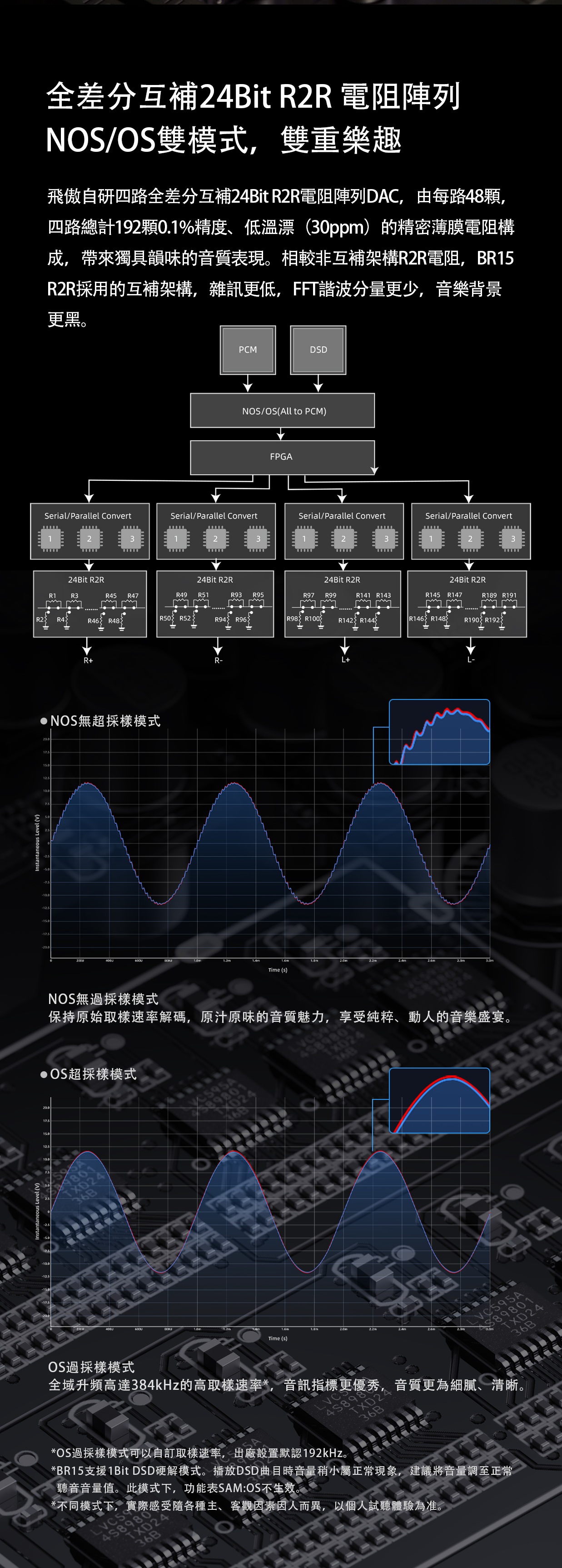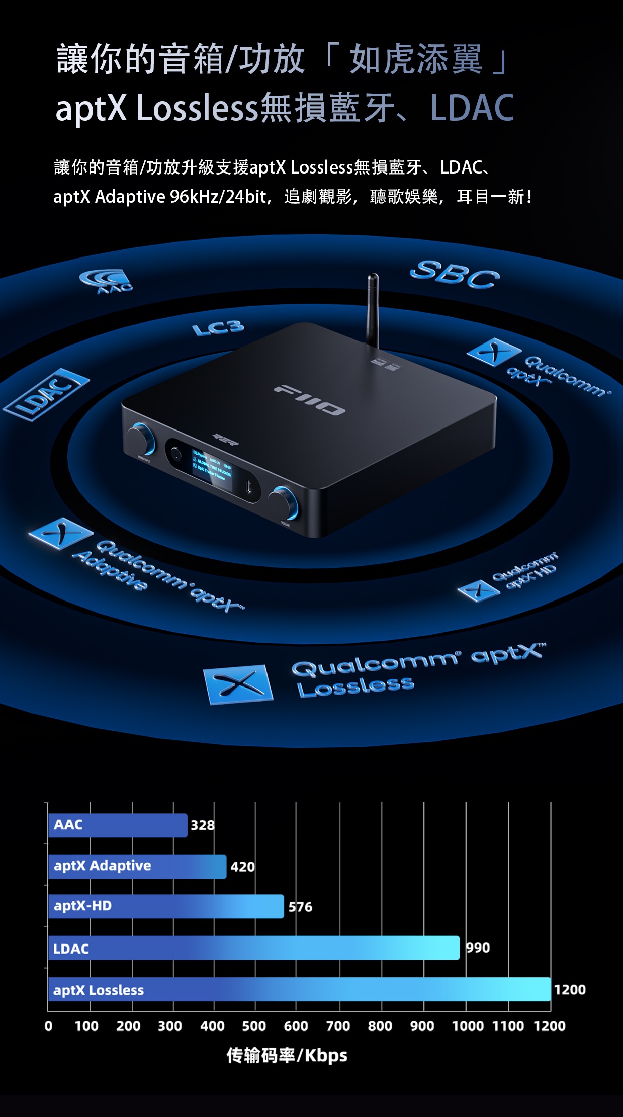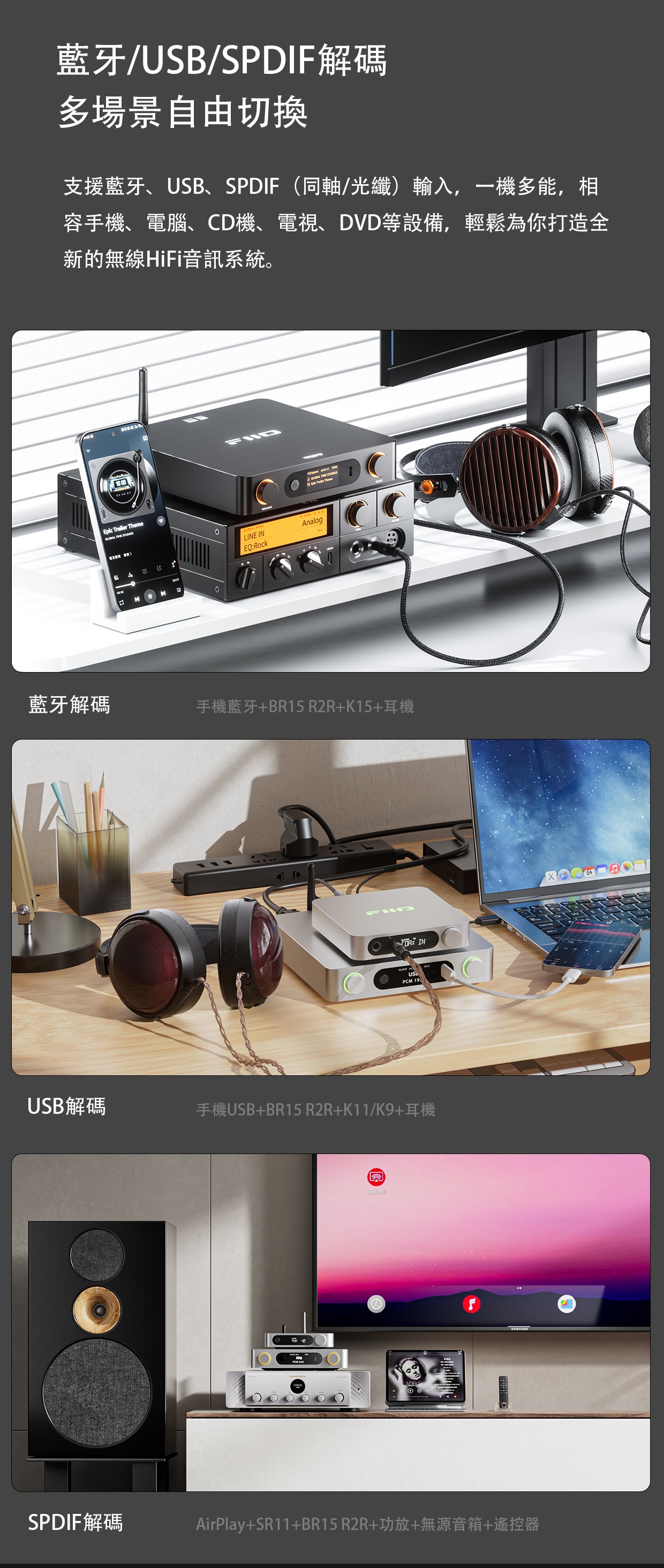 【高清藍牙音訊接收器 ~ FiiO BR15 R2R香港版】 不受「 線 」制 無線HiFi 為音箱、功放升級藍牙連接功能, 無損藍牙,自由聆聽,不受“線”制, 暢聽高品質無線音訊的舒爽體驗 FiiO BR15 R2R (高清藍牙音訊接收器) 香港版 顏色:黑色/ 銀色 建議零售價: HK$1699 特點: 1. 高通旗艦藍牙晶片QCC5181,藍牙5.4 2. 支持LDAC,aptX Lossless無損藍牙 3. 全差分互補24Bit R2R 電阻陣列 4. NOS/ OS雙模式 5. 藍牙/USB/光纖/同軸解碼 6. 2組RCA + 1組XLR線路輸出 7. 光纖 + 同軸數位輸出 8. 全域10段PEQ調節 9. AC/ DC雙供電 10. 標配紅外遙控器 ==================== 1. 暢享CD級無損音質 高通旗艦藍牙晶片QCC5181 搭載高通旗艦藍牙晶片QCC5181,符合LE Audio標準並高達2.1Mbps頻寬傳輸能力,支援aptX Adaptive系統中的Lossless規格,藍牙也能達到CD級無損音質,還原動聽細節,仿佛置身於現場。 2. 讓你的音箱/功放「 如虎添翼 」 aptX Lossless無損藍牙、LDAC 讓你的音箱/功放升級支援aptX Lossless無損藍牙、LDAC、aptX Adaptive 96kHz/24bit,追劇觀影,聽歌娛樂,耳目一新! 3. 藍牙5.4,連接新境界 高性能,低功耗,配合獨立外置天線的加持,傳輸距離更遠,抗干擾能力更強,延遲更低,連接更穩定,無線更自由。 4. 全差分互補24Bit R2R 電阻陣列 NOS/OS雙模式,雙重樂趣 飛傲自研四路全差分互補24Bit R2R電阻陣列DAC,由每路48顆,四路總計192顆0.1%精度、低溫漂(30ppm)的精密薄膜電阻構成,帶來獨具韻味的音質表現。相較非互補架構R2R電阻,BR15 R2R採用的互補架構,雜訊更低,FFT諧波分量更少,音樂背景更黑。 全域升頻高達384kHz的高取樣速率*,音訊指標更優秀,音質更為細膩、清晰。 *OS過採樣模式可以自訂取樣速率,出廠設置默認192kHz。 *BR15支援1Bit DSD硬解模式。播放DSD曲目時音量稍小屬正常現象,建議將音量調至正常 聽音音量值。此模式下,功能表SAM:OS不生效。 *不同模式下,實際感受隨各種主、客觀因素因人而異,以個人試聽體驗為准。 5. 藍牙/USB/SPDIF解碼 多場景自由切換 支援藍牙、USB、SPDIF(同軸/光纖)輸入,一機多能,相容手機、電腦、CD機、電視、DVD等設備,輕鬆為你打造全新的無線HiFi音訊系統。 藍牙解碼 手機藍牙+BR15 R2R+K15+耳機 USB解碼 手機USB+BR15 R2R+K11/K9+耳機 SPDIF解碼 AirPlay+SR11+BR15 R2R+功放+無源音箱+遙控器 6. 豐富輸出介面,輕鬆適配你的設備 配備2組RCA+1組XLR類比線路路輸出介面,以及光纖、同軸數位輸出介面,無論是有源音箱、解碼器還是功放,都能輕鬆連接,滿足各種設備搭配需求。 7. 全域10段PEQ調節 AUTO EQ,懶人福音 所有工作模式下都支援十段PEQ調節,通過飛傲自主研發的調節演算法和APP,不僅可以使用內置的復古、流行等多種預設調音,還可以模擬或修正耳機/音箱的頻響曲線,並支援匯出、導入、分享、保存EQ曲線,輕鬆玩轉調音。 手動微調過於專業?AUTO EQ以及預設音效助你輕鬆上手。AUTO EQ只需上傳/選擇耳機原始資料以及目標耳機曲線,就能實現多樣化的聽音體驗。 *開啟PEQ時,最高支持PCM 192kHz/24bit取樣速率的調節。 8. 全平衡音訊電路 從R2R DAC、LPF、音量調節全程採用全差分信號處理,具備抗干擾、低失真、大動態的特性;還配備POP音消除系統,確保音訊電路的專業性和可靠性。 9. AC/DC雙供電設計 內置高品質開關電源,電源更純淨;還配置了外部DC電源介面*,可搭配更高性能的線性電源使用,體驗不同的聲音表現。 *外置DC供電請選擇5V輸出電流≥2A,5.5*2.1mm介面的電源。 *接入DC電源後自動切換,優先DC供電。 10. 定制LCD顯示幕 歌曲信息一目了然 定制的1.47英寸彩色顯示幕,多種主題可選,在藍牙播放時能夠顯示歌名、歌手、歌詞等資訊*,還可以瞭解到設備當前狀態下的取樣速率、音量、EQ等內容。 *藍牙發射端支援BR15 R2R才可以顯示歌詞,如飛傲音樂播放時,需要在設置中,打開“外接設備藍牙歌詞”選項。 11. 近可調節,遠可遙控 輕鬆掌控你的音樂世界 延續極簡科技的家族設計,雙旋鈕操控+顯示幕,桌面等近距離操控更加方便;標配紅外遙控器,還支援FIIO CONTROL APP控制,遠距離聆聽大系統,遙控更加得心應手。 12. 雙Hi-Res金標認證,音質更有保障 BR15 R2R已經通過Hi-Res Audio/Hi-Res Audio Wireless的雙重金標認證,有線無線,音質都很線上。 包裝清單: 1. BR15主機 2. 紅外遙控器 3. AC供電線 4. 說明書 5. 售後維修卡 6. 紅白雙RCA蓮花音訊線 基本規格參數: 基本規格 顏色:黑色/銀色 三維尺寸:約210x188x42mm(含機腳墊) 重量:約760g 硬體設定 主控:ESP32-S3 DAC晶片:飛傲自研真24Bit R2R DAC USB主控:XMOS XU316 藍牙晶片:高通QCC5181 螢幕:1.47英寸彩色 LCD 藍牙規格 藍牙接收:藍牙5.4, 解碼規格 USB DAC:384kHz/32bit;DSD256 同軸輸入:192kHz/24bit;DSD64 光纖輸入:192kHz/24bit;DSD64 藍牙接收:LC3/SBC/AAC/aptX/aptX HD/atpX Adaptive/aptX Lossless/LDAC 數位輸出 同軸輸出:192kHz/24bit;DSD64 光纖輸出:192kHz/24bit;DSD64 線路輸出 RCA輸出:L+R=2.2Vrms+2.2Vrms (1kHz@10kΩ) XLR輸出:L+R=4.4Vrms+4.4Vrms (1kHz@10kΩ) 音訊參數 頻率回應:20Hz~65kHz,衰減<2.9dB 信噪比:≥119dB (A計權) 底噪:<5.1μV(A計權) THD+N:<0.015%(1kHz/0dB@10kΩ)