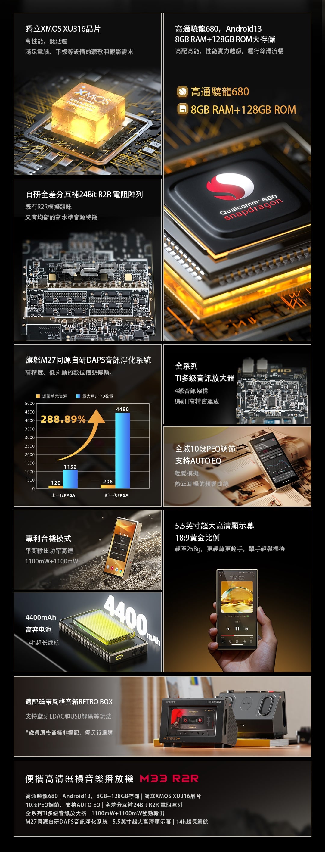 【FiiO 首台R2R便攜 ~ FiiO M33 R2R】 #秒變音箱: 適配磁帶風格音箱RETRO BOX 支持藍牙LDAC和USB解碼等玩法 *磁帶風格音箱非標配,需另行選購 FiiO M33 R2R (便攜高清無損音樂播放機) 顏色: 復古金/ 黑色/ 深藍色 建議零售價: HK$4999 早鳥優惠價: HK$4499 第一批大約到貨 1-2026 特點: 1. 高通驍龍680 2. Android13,8GB+128GB存儲 3. 獨立XMOS XU316晶片 4. 10段PEQ調節,支持AUTO EQ 5. 全差分互補24Bit R2R 電阻陣列 6. 全系列Ti多級音訊放大器 7. 1100mW + 1100mW強勁輸出 8. 旗艦M27同源自研DAPS音訊淨化系統 9. 5.5英寸超大高清顯示幕 10. 14h超長續航 ==================== 1. 獨立XMOS XU316晶片 高性能,低延遲 滿足電腦、平板等設備的聽歌和觀影需求 2. 高通驍龍680,Android13 8GB RAM+128GB ROM大存儲 高配高能,性能實力越級,運行絲滑流暢 高通驍龍680 8GB RAM+128GB ROM 3. 自研全差分互補24Bit R2R 電阻陣列 既有R2R模擬韻味 又有均衡的高水準音源特徵 4. 旗艦M27同源自研DAPS音訊淨化系統 高精度、低抖動的數位信號傳輸。 5. 全系列 Ti多級音訊放大器 4級音訊架構 8顆Ti高精密運放 6. 全域10段PEQ調節 支持AUTO EQ 輕鬆模擬 修正耳機的頻響曲線 7. 專利台機模式 平衡輸出功率高達 1100mW+1100mW 8. 5.5英寸超大高清顯示幕 18:9黃金比例 輕至258g,更輕薄更趁手,單手輕鬆握持