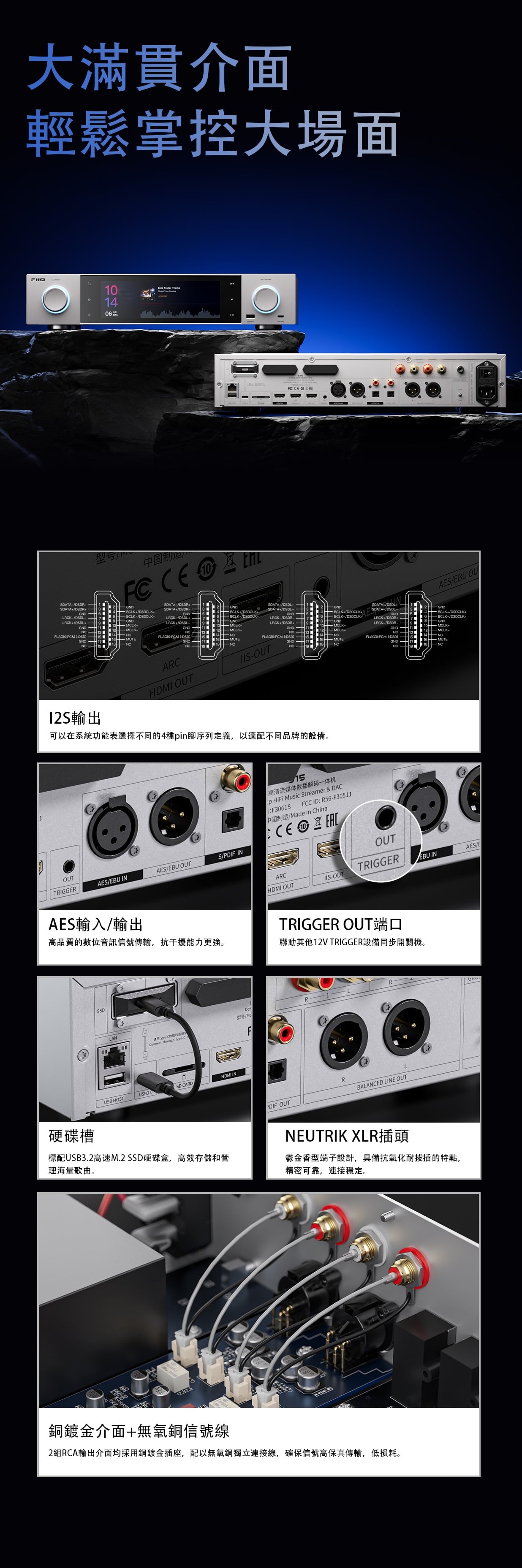 【FiiO 首款全尺寸、全能流媒體前端 ~ FIIO S15】 #百搭,彰顯全能本色 #全能HiFi音源解決方案 #全旗艦配置 FiiO S15 (台式高清流媒體一體機) 香港版 顏色:黑色/ 銀色 建議零售價: HK$8499 早鳥優惠價: HK$7999 特點: 1. 流媒體·本地播放·解碼·前級 2. AKM旗艦DAC組合 AK4191 + AK4499EX 3. 超低相噪飛秒級晶振 4. 開放式Android 12 + 定制封閉橫屏系統 5. 驍龍660 + 高通QCC5125 + XMOS 16核芯 XU316 6. 35W低雜訊線性電源 7. 7.84英寸車規級超大彩屏 8. 全平衡類比音訊架構 9. HDMI/ARC解碼 ==================== 1. 全能HiFi音源解決方案 專業全能,大有乾坤 FiiO 首款全尺寸、全能流媒體前端S15 精通流媒體/網路串流/局域網播放/本地播放/解碼/前級/數位轉盤 配備全旗艦配置、全滿貫介面、全能操控,全面適配後級解碼器/功放/音箱 以無短板的高能表現,助您輕鬆掌控各種音樂大場面,超乎您對全能數播的想像 2. 恢宏大氣,穩若泰山 全尺寸、全金屬機身,聲來不凡 S15以台機標準寬度430mm進行設計,在客廳或者聽音室都可以完美融合您的後級設備,融為一體的音訊系統,更能彰顯恢宏大氣之聲勢。得益于S15重達10斤的全金屬高強度機身,以及穩固防滑的機腳,可以有效防止震動帶來的聲音劣化。 3. 7.84英寸車規級超大彩屏,大有作為 採用比同級產品更大尺寸的彩屏,配合開放式的安卓12系統+封閉式的定制橫屏系統,顯示佈局更加清晰、合理,近距離操控更直觀,更好用,上手就可以輕鬆玩轉各種操作,每次觸控的回應都如影隨形。 4. 35W低雜訊線性電源,儲能深不見底 採用定制的高品質低雜訊變壓器供電,可以保證本機的供電純淨度;搭配4顆4700μF ELNA音訊電容,充沛的功率儲備,可以提供源源不斷的動力。 5. 尖端力作,洞見未來 包羅萬象,掌管音源的「大師」 流媒體:開放式安卓12系統+定制封閉式橫屏系統,自由安裝和流暢使 用各大音樂APP。 網路串流:通過Roon Ready*、DLNA、AirPlay、藍牙接收讓您暢享高品質的流媒體音樂。 局域網播放:通過UPNP/SMB/WebDAV等網路通訊協定播放NAS/局域網/雲伺服器的歌曲。 本地播放:除本地儲存的音樂檔外,可以通過TF卡、U盤、移動硬碟等設備直接在本地播放。 *Roon Ready認證正在進行中,具體通過時間以FiiO 官方通知為准 6. 精確還原,纖毫畢現 ACCUSILICON 雙高性能超低相噪飛秒晶振 FiiO 播放機首次採用兩顆業界權威 ACCUSILICON AS318-B系列超低相噪飛秒晶振(45.1584MHz,49.1520MHz),並且經過100%篩選,能夠有效降低相位雜訊對音訊信號的影響,本機解碼的還原度以及數位輸出的精准度都達到了超高水準,搭配後級功放或解碼器都能有參考級的聲音表現。 7. 全域原取樣速率輸出 自研DAPS數位音訊淨化系統 FiiO 自研的DAPS數位音訊淨化系統,由HiFi級Android通層音訊核+低抖動時鐘輔助處理器組成,已經深耕多年並持續精進,不僅在應用層、系統層實現了全域音訊取樣速率直通,還能精准匹配各取樣速率PCM和DSD音訊,為你帶來更為醇正的音樂。 8. 數模分離式結構, 原音重現 AKM旗艦DAC組合 AK4191+AK4499EX 繼Q15,K9 AKM、M23之後再度採用備受好評的AKM旗艦DAC組合 —— AK4191+AK4499EX,基於全新設計技術的數位/類比完全分離式結構,融合了全新研發的“DWA ROUTING技術”,提升信噪比及降低各種振幅的雜訊,進一步淨化背景,提高解析力,聲音張弛有度,盡顯寬鬆、自然之韻。 9. 全平衡模擬音訊架構 從DAC解碼到前級採用全平衡電路設計,可以顯著減少雜訊和降低串擾,提升線路輸出和前級輸出的品質,亦可設置固定幅度或者可變幅度;IV、LPF等音訊部分還採用低雜訊精密運放OPA1612進行高壓供電,確保大動態的音訊輸出。 10. 奢華用料,只為聲音 ELNA音訊電解電容 精確還原,精調樂味。 24顆高精度薄膜電阻+ 8顆WIMA薄膜電容+4顆固態電容 精確還原,纖毫畢現,動能充沛的音質表現。 隔離型數字變壓器 同軸輸出和AES輸出均採用了隔離型數位變壓器,不僅增強了輸出 能力,還有效避免了地線環路干擾,隔離性能媲美光纖輸出。 11. 淨”享天籟之聲 物理分板與遮罩設計 內部數位、類比、電源部分獨立分板佈局,在物理結構上避免相互串擾,有效保證信號處理的精度和動態,讓您盡享如天籟般純淨、細膩的音質。 12. 精准供電設計 數模分開供電 有效避免類比/數位電路之間的串擾,供電隔離和抗干擾效果更好。 13. 模擬分級供電 類比部分設有分級供電系統,並精細劃分控制電路,包括數模轉換、LPF等供電系統,每級採用大量精密LDO進行二級穩壓,持續提供穩定純粹的電源。 14. 全旗艦配置 詮釋全能實力 高通驍龍660 高通驍龍660與開放式安卓系統的搭配,已經經過多年近十款產品的精心打磨,調教早已爐火純青,S15的整體運行、操控,十分流暢絲滑。 高通藍牙晶片QCC5125 藍牙5.1,支持LDAC、aptX Adaptive等音訊編解碼,為您帶來更勝以往的藍牙聽音體驗。 XMOS 16核芯 XU316 高性能,低延遲,相容性更好,USB DAC支持768kHz/32bit,DSD512(Native)。 15. 全新 橫屏數播FIIO OS FiiO 全新深度定制橫屏數播系統,專為橫屏使用場景優化,不僅支持直觀的操作佈局,還強化了視覺效果,帶來更沉浸式的操作體驗。系統介面整體簡潔有序,可通過近距離觸摸或APP、藍牙遠端操作,不同場景下都可輕鬆操控。 16. 定制橫屏數播版FiiO 音樂 基於S15顯示幕量身定制的FiiO 音樂,可快捷直達各音樂播放及設置入口,並支援VU表等視覺化音訊效果,為使用者提供更直觀的音樂播放和視覺回饋體驗。 桌面自