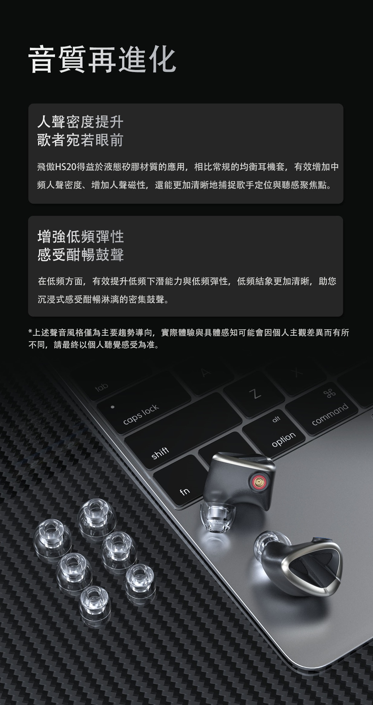 【液態矽膠耳機套 ~ FiiO HS20】 FiiO HS20 (液態矽膠耳機套) 建議零售價: HK$69 食品級液態矽膠材質 | 有效提高中頻人聲密度 優化低頻彈性 | 改善漏音 | 標配S/M/L三種尺寸 1. 液態矽膠材質 食品級標準 奶嘴級安全 液態矽膠又名液體膠,具有流動性好、硫化快、安全環保的特點,可完全達到食品級要求;主要用於嬰幼兒用品、醫療用品及電子產品。 貼合耳道不漏音 嬰兒般的肌膚觸感 液態矽膠材質自帶軟糯、親膚的觸感,充分放鬆耳道,久聽不累。經過特殊設計後,HS20擁有出色的氣密性與表面粘滯性,深入耳道時,不會因為耳套形變而產生漏音現象,醇享HiFi原音。 清澈音質 透亮如泉 相比較於其他類型的矽膠材質,真正的液態矽膠材質可以實現高透明度、高透亮的可見性,顏值線上,清澈如泉。 2. 音質再進化 人聲密度提升 歌者宛若眼前 FiiO HS20得益於液態矽膠材質的應用,相比常規的均衡耳機套,有效增加中頻人聲密度、增加人聲磁性,還能更加清晰地捕捉歌手定位與聽感聚焦點。 增強低頻彈性 感受酣暢鼓聲 在低頻方面,有效提升低頻下潛能力與低頻彈性,低頻結象更加清晰,助您沉浸式感受酣暢淋漓的密集鼓聲。 *上述聲音風格僅為主要趨勢導向,實際體驗與具體感知可能會因個人主觀差異而有所不同,請最終以個人聽覺感受為准。 3. 權威認證,正品原材 FiiO HS20所採用的液態矽膠原材料,已取得德國LFGB食品級認證,真材實料,健康安全。 標配S/M/L三種尺寸 FiiO HS20含有3對耳機套,即S/M/L 三種尺寸,適配不同耳道大小。