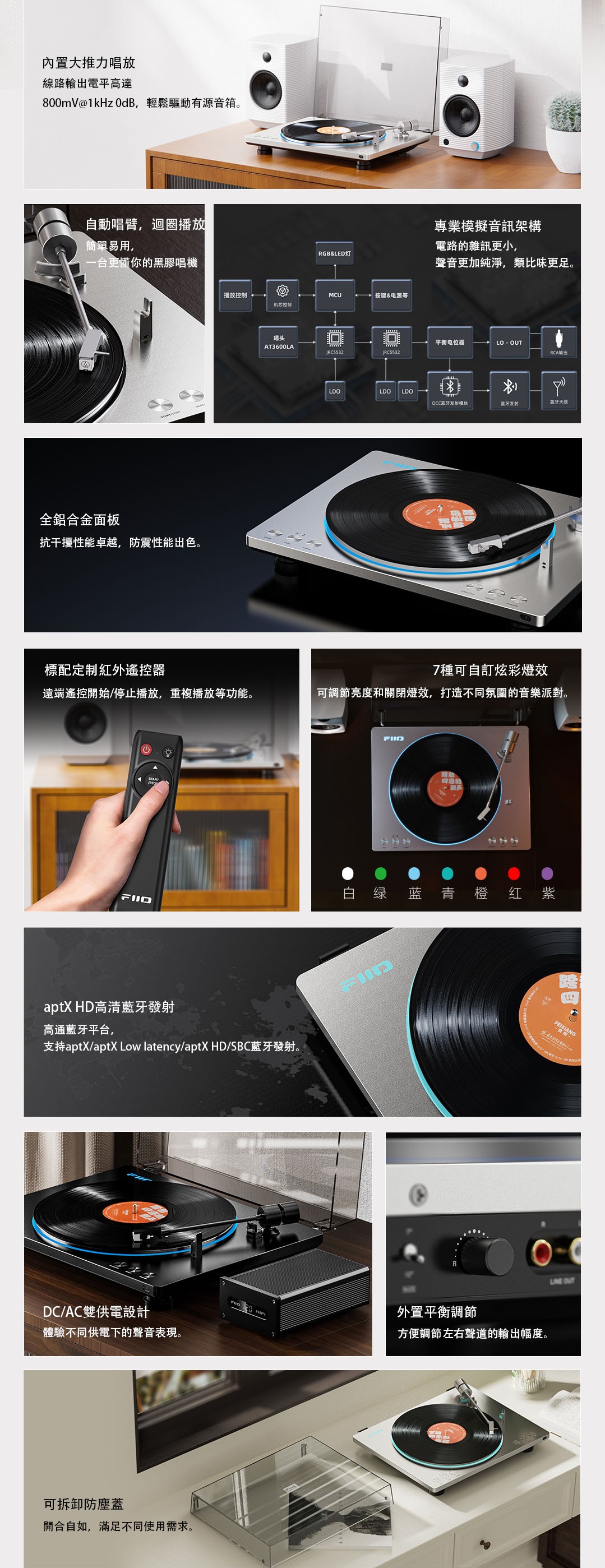 【金屬抗震機身,自動黑膠唱片機 ~ FiiO TT13】 FiiO TT13 (金屬抗震機身,自動黑膠唱片機) 自動唱臂 | 模擬音訊架構 | 內置大推力唱放|全鋁合金面板 | 7種可切換燈效 | 標配定制紅外遙控器aptX/aptX LL/aptX HD高清藍牙發射 | DC/AC雙供電設計 | 外置平衡調 銀色版本,預計9月中旬開始發貨; 黑色和白色版本,將在10月開始陸續推出 Model: 標準版 (銀/ 黑):HK$1899 藍牙版 (銀/ 黑/ 白):HK$1999 特點: 1. 內置大推力唱放 線路輸出電平高達 800mV@1kHz 0dB,輕鬆驅動有源音箱。 2. 自動唱臂,迴圈播放 簡單易用,一台更懂你的黑膠唱機 3. 專業模擬音訊架構 電路的雜訊更小, 聲音更加純淨,類比味更足。 4. 全鋁合金面板 抗干擾性能卓越,防震性能出色。 5. 標配定制紅外遙控器 遠端遙控開始/停止播放,重複播放等功能。 6. 7種可自訂炫彩燈效 可調節亮度和關閉燈效,打造不同氛圍的音樂派對。 7. aptX HD高清藍牙發射 高通藍牙平台, 支持aptX/aptX Low latency/aptX HD/SBC藍牙發射。 8. DC/AC雙供電設計 體驗不同供電下的聲音表現。 9. 外置平衡調節 方便調節左右聲道的輸出幅度。 10. 可拆卸防塵蓋 開合自如,滿足不同使用需求。