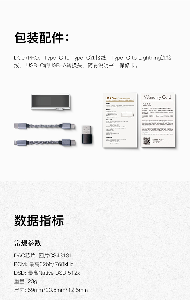 【iBasso 最強小尾巴4片CS43131火力全開 ~ DC07 PRO】 #五零級失真 #指標/音質雙高峰 iBasso DC07 PRO (小尾巴音質代言人) 顏色:黑色 或 銀色 建議零售價: HK$1688 特點: 1. 自研FPGA演算法+KDS飛秒晶振 ~ 構建小尾巴獨立音訊主控,實現信號重組,同步全域時鐘 2. CS43131×4 Array ~ 4片CS43131火力全開,實現對晶片指標的全方位超越 3. 0.96”OLED顯示幕 ~ 配合多功能旋鈕,在小尾巴上輕鬆實現全部操作 4. 五“零”級THD+N ~ THD+N達到0.000098%,比其他小尾巴多一個“0” 5. 納伏級底噪 ~ 底噪低至760nV,這才是真正的幾乎“0”底噪 6. 430mW+430mW@32Ω ~ 強悍驅動力,輕鬆推開大部分耳塞及大耳 7. 94%轉換效率,能耗比驚人 ~ 誰說大推力必須高功耗?功耗低至80mA,好聽更要長久聽 8. 動態範圍:134dB 9. 4.4mm平衡 + 3.5mm單端 ~ 原裝Pentaconn 4.4mm母座 10. SPDIF輸出支援32bit/768kHz 11. 安卓APK操控 ==================== 什麼才是理想的小尾巴? 6大特質,DC07PPRO給你答案! 1. 聲音要好聽! iBasso 調音從不讓人失望。 2. 指標要出色! 五零級別THD+N,比同檔產品多個零。 3. 功耗要低! 手機負擔更小,便攜無憂。 DC04PPRO的136mA低耗電已優勝於其他同是大推力的小尾巴, ——而DC07PRO更是低至80mA。 4. 推力要大! 430mW + 430mW@32ohm,在小耗電下實現絕佳推力。 5. 操作要方便! 多功能旋鈕、OLED螢幕、安卓配套APK。統統都有! 6. 用料要優質! 原裝Pentaconn4.4mm插口、飛秒晶振、FPGA、沉金 + 樹脂塞孔 + 過孔灌銅PCB.……我們從不吝惜用料做工。 ==================== 1. 五零級THD+N,小尾巴大成之作 DC07PRO不僅凝聚了iBasso 多年小尾巴開發經驗,更從播放機設計中汲取靈感,以深厚的技術積累,打造THD+N五零級小尾巴。不僅如此,DC07PRO的動態範圍、驅動力等核心指標也實現了全面飛躍! 2. 塔尖指標,一覽眾山小 THD+N:0.000098%(-120.2dB)~ 五零級失真,小尾巴之首。 動態範圍:134dB ~ 靜如處子動如脫兔。 底噪:760nV ~ 納伏級底噪,不懼任何高靈敏度耳機。 推力:430mW+430mW@32Ω ~ 耳塞/大耳,全部征服。 頻響:10Hz-75kHz(+/-0.5dB)~ 頻響超越標準,帶上耳機,如臨現場。 3. FPGA ~ 小尾巴音訊主控 DC07PRO採用iBasso 自研FPGA技術,集音訊演算法之大成,構建小尾巴獨立音訊主控,統領全域,起到信號重組和時鐘同步的作用,FPGA生成高精度低抖動的時鐘給DAC以及USB-Controller,可以有效降低由USB匯流排帶來的時鐘抖動。 DCO7PRO的FPGA支援數位匯流排波形整形。與大多採用USB控制器+DAC的解碼線不同,DC07PRO採用USB控制器->FPGA->DAC的形式,通過FPGA內部的“去抖動”演算法,可以消除音訊匯流排上的抖動和波形失真。 4. CS43131 x 4,全方位超越 DC07PRO採用四片Cirrus Logic旗艦級DAC晶片——CS43131,通過自研FPGA技術及電路設計,讓 4片CS43131火力全開,實現對晶片指標的全方位超越,AP實測THD+N達到驚人的-120.2dB!在自研FPGA加持下,DC07PRO支持DSD512和PCM 32bit/768kHz硬解碼,這是CS43131×4 Array模式的又一次超越。 5. 能耗比無出其右 ~ 低耗電,大推力 DC07PRO採用同步整流技術,擁有高達94%的電源轉換效率。整機功耗低至80mA,相比DC04PRO降低40%,推力大幅增加82%。DAC電源採用專供射頻和類比電路的超低雜訊LDO,具備高達100dB的PSRR(電源抑制比)保證電源的純淨度。 6. 0.96英寸OLED螢幕 ~ 便捷操作瞬息之間 DC07PRO加入了0.96英寸OLED螢幕,並配備了ALPS編碼器,可通過機身多功能旋鈕,進行全功能設置。更大的螢幕,更簡單高效的交互邏輯,決勝方寸之間。DC07PRO支援安卓手機配套APK——iBasso UAC,可以實現多種硬體級功能調節。兩種調節方式自由選擇。 點按 [旋鈕] 打開或關閉OLED螢幕。在滅屏或主介面旋轉 [旋鈕] 可以調整音量。螢幕亮起後長按 [旋鈕] 進入功能選擇功能表。選擇功能表裡旋轉 [旋鈕] 可流覽選項。 點擊 [旋鈕] 可更改設置。設置自動保存。 7. 實力派,顏值亦可萬眾矚目 外殼由整塊鋁合金CNC加工而成,一體成型工藝為DC07PRO帶來滿滿高級感。整機僅一個多功能旋鈕,遵循極簡美學。雙面鋼化玻璃面板,擁有無與倫比的精緻感。得益於OLED螢幕高對比,DC07PRO無論是息屏還是亮屏,正面都渾然一體,深邃美麗! 8. 無懼iPhone限流保護 無需APK,也能玩轉全功能 iPhone對外接設備有電流限制。小尾巴功耗過高,易觸發iPhone供電保護,導致推力虛弱或強制關機。DC07PRO功耗低至80mA,不必擔憂蘋果供電限制。多功能旋鈕和OLED螢幕雙劍合璧,可快速設置各種增益、濾波。iOS端無需APK,同樣玩轉DC07PRO全部功能。 9. 32bit/768kHz SPDIF輸出 手機就是專業數字轉盤 DC07PRO支持SPDIF輸出,實現高達32bit/768kHz的數位信號輸出,通過機身操作或UAC軟體,接上手機就是一台專業數位轉盤,實用性更勝一籌。 包裝配件: DC07PRO,Type-C to Type-C連接線,Type-C to Lightning連接線, USB-C轉USB-A轉換頭,簡易說明書,保修卡。 資料指標 常規參數: DAC晶片: 四片CS43131 PCM:最高32bit/768kHz DSD:最高Native DSD 512x 重量:23g 尺寸: 59mm*23.5mm*12.5mm 音訊參數: 4.4mm平衡輸出: THD+N: -120.2dB(0.000098%)@1kHz 300Ω Load 輸出電平: 2.8Vrms(Low Gain) 3.5Vrms(Mid Gain) 4Vrms(High Gain) 輸出功率: 510mW+510mW@16Ω 失真<0.1% 430mW+430mW@32Ω 失真<0.1% 信噪比: 134dBA 動態範圍: 134dBA 分離度: 142dB 頻率回應: 10Hz-80kHz -0.5dB 底噪: 0.85μV 3.5mm單端輸出: THD+N: -116dB(0.00017%)@1kHz 300Ω Load 輸出電平: 1.4Vrms(Low Gain) 1.73Vrms(Mid Gain) 2Vrms(High Gain) 輸出功率: 210mW+210mW@16Ω 失真<0.1% 118mW+118mW@32Ω 失真<0.1% 信噪比: 129dBA 動態範圍: 129dBA 分離度: 136dB 頻率回應: 10Hz-75kHz -0.5dB 底噪: 0.76μV