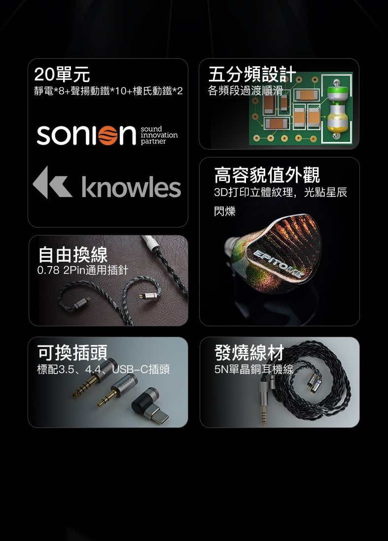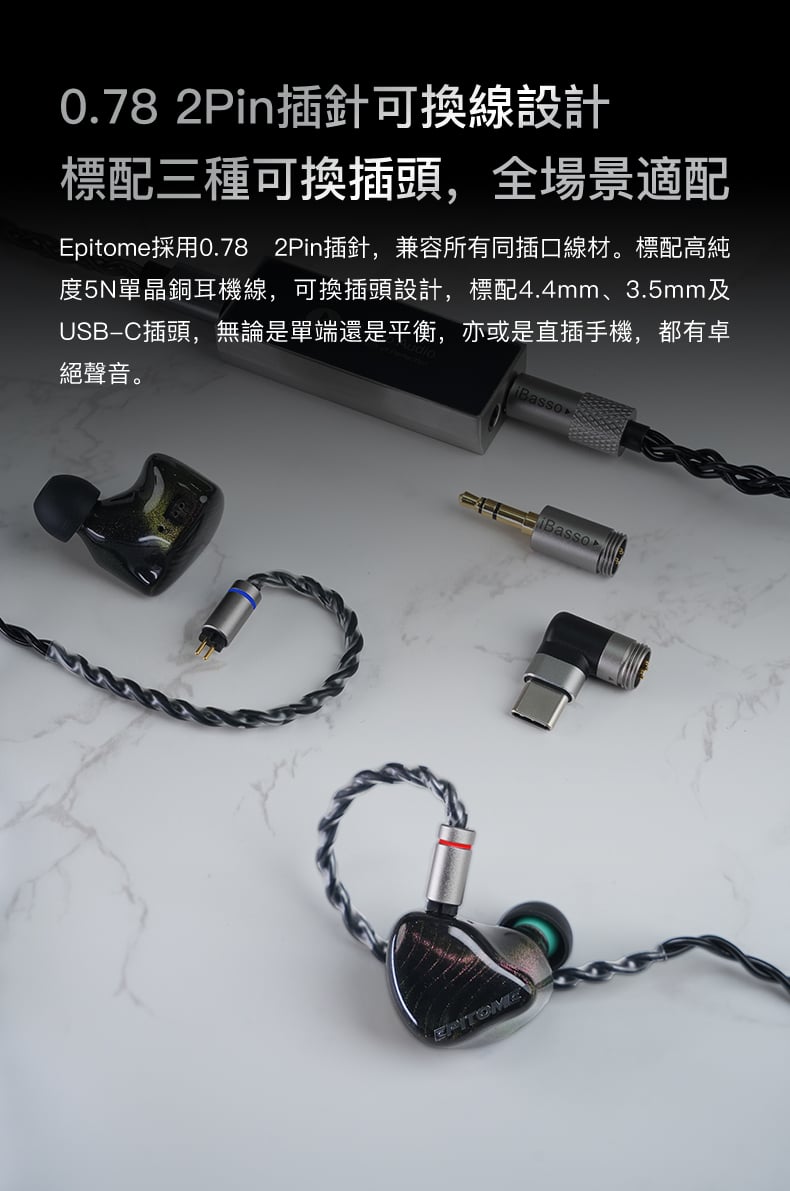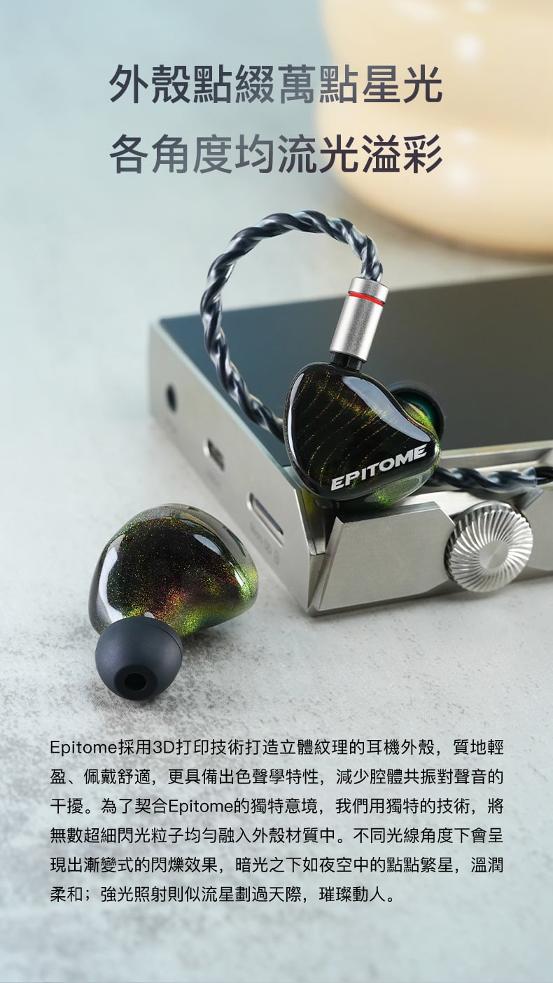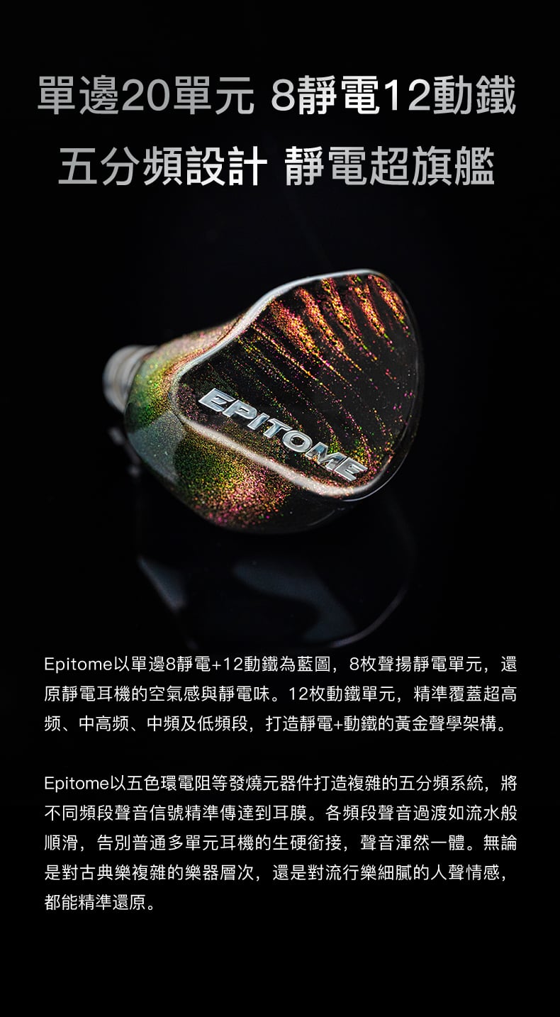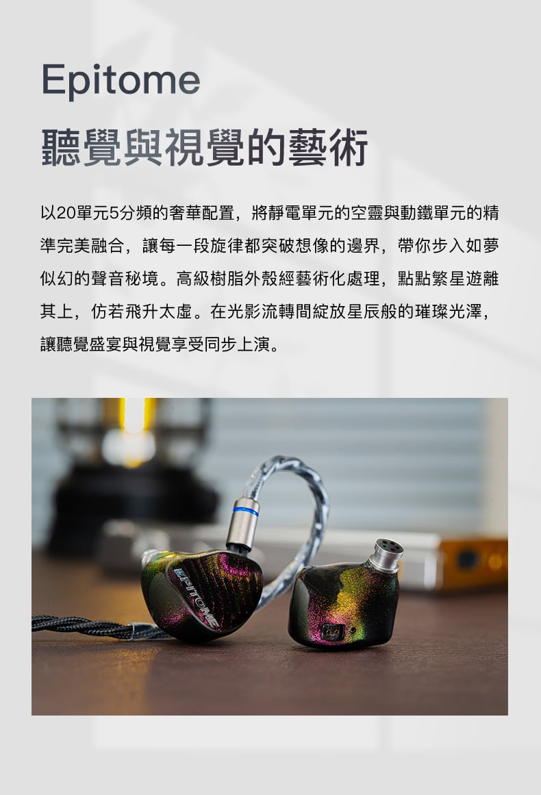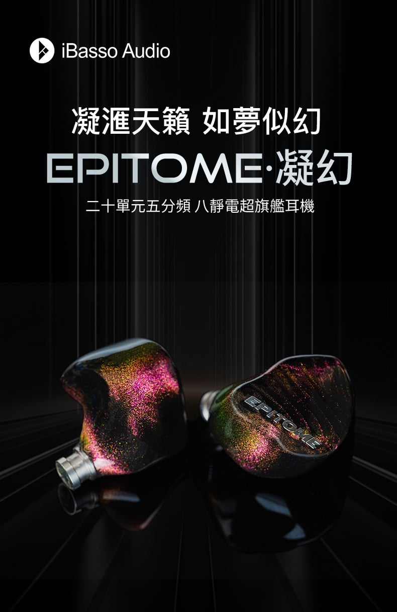 【iBasso 的第一款超旗艦耳機 ~ iBasso Epitome·凝幻】 #贈送實驗室合金鍍銀線 #精緻配件 奢品待遇 聽覺與視覺的藝術 以20單元五分頻的奢華配置,將靜電單元的空靈與動鐵單元的精准完美融合,讓每一段旋律都突破想像的邊界,帶你步入如夢似幻的聲音秘境。高級樹脂外殼經藝術化處理,點點繁星遊離其上,仿若飛升太虛。在光影流轉間綻放星辰般的璀璨光澤,讓聽覺盛宴與視覺享受同步上演。 凝匯天籟如夢似幻 iBasso Epitome·凝幻 (二十單元五分頻 八靜電超旗艦耳機) 建議零售價: HK$22999 早鳥優惠價: HK$21999 特點: 1. 20單元 ~ 靜電x 8 + 聲揚動鐵 x 10 + 樓氏動鐵 x 2 2. 五分頻設計各頻段過渡順滑 3. 高顏值外觀 ~ 3D打印立體紋理,光點星辰閃爍 4. 自由換線~ 0.78 2Pin通用插針 5. 可換插頭 ~ 標配3.5、4.4、USB-C插頭 6. 發燒線材 ~ CN單晶銅耳機線 ==================== 1. 單邊20單元 8靜電12動鐵 五分頻設計 靜電超旗艦 Epitome以單邊8靜電+12動鐵為藍圖,8顆聲揚高解析靜電單元,還原靜電耳機的空氣感與靜電味。12枚動鐵單元,精准覆蓋超高頻、中高頻、中頻及低頻段,打造靜電+動鐵的黃金聲學架構。 Epitome採用複雜的物理+電子五分頻設計,將不同頻段聲音信號精准傳達到耳膜。各頻段聲音過渡如流水般順滑,告別普通多單元耳機的生硬銜接,聲音渾然一體。無論是對古典樂複雜的樂器層次,還是對流行樂細膩的人聲情感,都能精准還原。 2. 4個聲揚複合靜電8單元(10K~20KHz及以上):聲音更具空氣感,靜電味十足 1個樓氏複合雙高頻動鐵2單元(6K~12KHz):保障高頻和極高頻銜接,超高頻自然過度 2個聲揚複合雙中高頻動鐵4單元(3K~6KHz):負責高頻與中頻段銜接,使樂器解析有力 2個聲揚複合中頻動鐵4單元(400~3KHz):人聲濃鬱,感情充沛,更具感染力 1個聲揚複合低頻動鐵2單元(20~400Hz):渾厚低頻來源,使鼓聲重而有彈性 3. 外殼點綴萬點星光 各角度均流光溢彩 Epitome採用3D打印技術打造立體紋理的耳機外殼,質地輕盈、佩戴舒適,更具備出色聲學特性,減少腔體共振對聲音的干擾。為了契合Epitome的獨特意境,我們用獨特的技術,將無數超細閃光粒子均勻融入外殼材質中。不同光線角度下會呈現出漸變式的閃爍效果,暗光之下如夜空中的點點繁星,溫潤柔和;強光照射則似流星劃過天際,璀璨動人。 4. 0.78 2Pin插針可換線設計 標配三種可換插頭,全場景適配 Epitome採用0.78 2Pin插針,兼容所有同插口線材。標配高純度5N單晶銅耳機線,可換插頭設計,標配4.4mm、3.5mm及USB-C插頭,無論是單端還是平衡,亦或是直插手機,都有卓絕聲音。 5. 贈送實驗室合金鍍銀線 Epitome上市之前,搭配線材實驗室內一款新型合金材料鍍銀線材,擁有出色的聲音表現。由於未經完整的耐久性測試,我們決定將其作為標配線之外的贈品,送給所有購買Epitome耳機的用戶。 技術規格: 產品型號: Epitome 單元: 聲揚靜電x 8 + 聲揚動鐵 x 10 + 樓氏動鐵 x 2(單邊) 耳機線: 0.78 雙針5N單晶銅線材 線長: 120CM(+/-5CM) 插頭: 4.4mm平衡,3.5mm單端,及USB-C插頭 頻響: 20~20kHz 阻抗: 17ohm 靈敏度: 113dB SPL/mW 單邊淨重: 6.2g