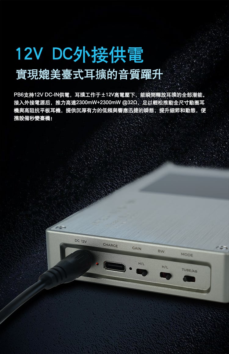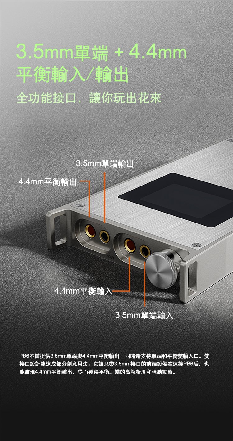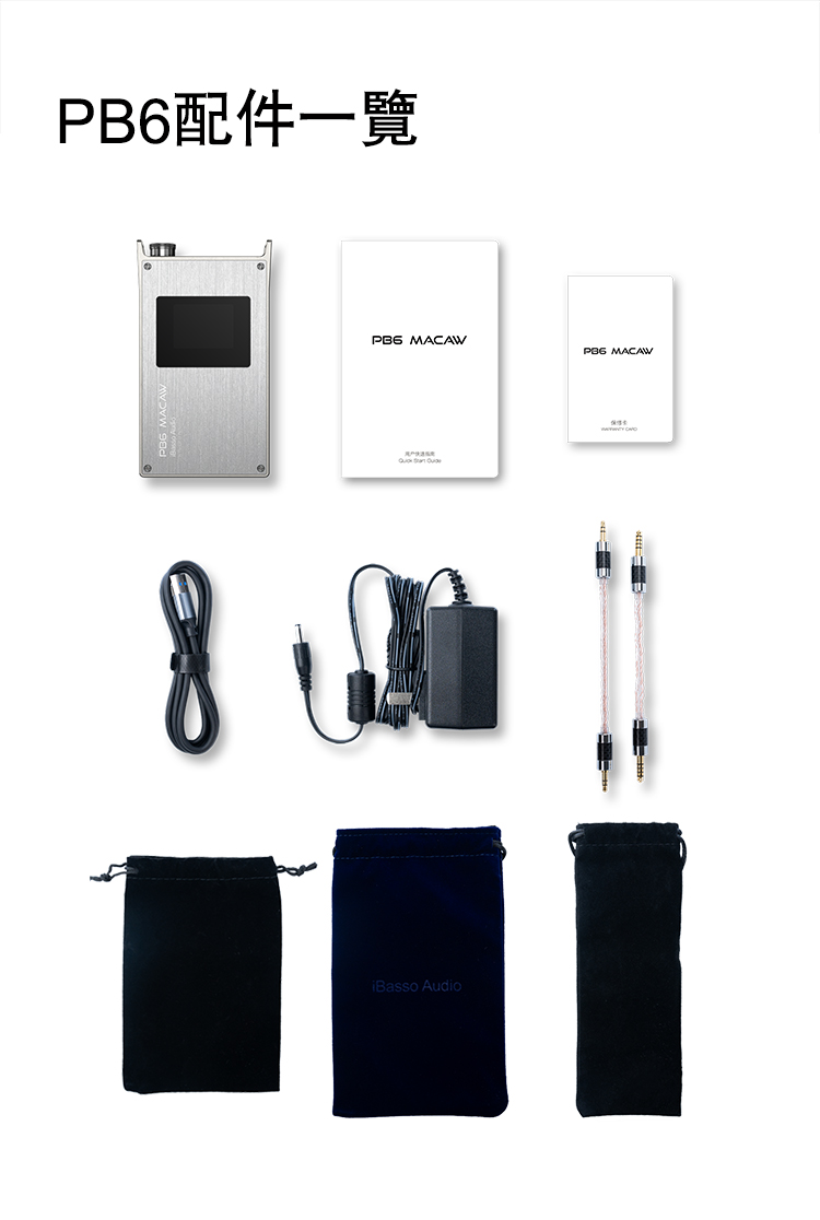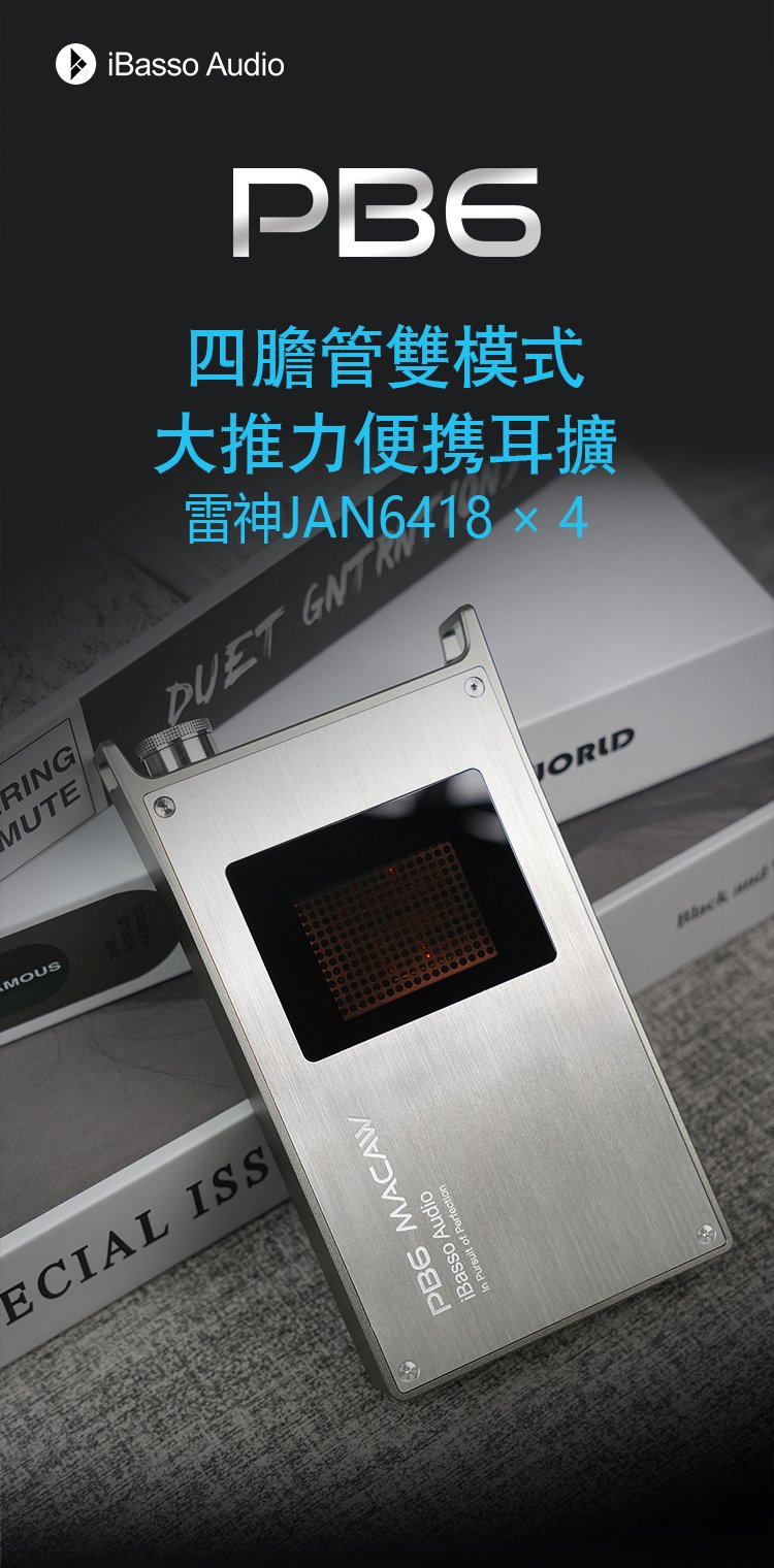 【創新架構,出眾音質 ~ iBasso PB6】 iBasso PB6是一款內置膽管的便攜耳放設備,定位高端市場,具備獨特音色設計。 內置膽管(電子管)設計,提供溫暖音色,支援高解析音訊。 面向追求 “模擬味” 音質的發燒友,延續iBasso在便攜音訊設備領域的技術探索。 iBasso PB6 (四膽管雙模式大推力便攜耳放 ~ 雷神JAN6418 × 4) 建議零售價: HK$3999 早鳥優惠價: HK$3499 特點: 1. 4顆軍工級JAN6418膽管 ~ 滿血供電確保純正膽味 2. TUBE+ Class AB雙輸出模式 ~ 膽管溫潤與運放澎湃,一機兩得 3. 8.4V高壓電池組 ~ 內部高壓供電,純淨動聽 4. 12V DC外接供電 ~ 實現便攜耳放向臺式耳放的音質躍升 5. NJW1195A高精度4通道音量控制器 ~ 模調數控,徹底杜絕聲道不均衡 6. 高低頻寬雙模式 ~ 聲音,隨心定制 7. PORON懸掛式減震+金屬遮罩罩 ~ 抑制麥克風效應,更遮罩外部干擾 8. 奢華用料,卓越配置 ~ 為HiFi級好聲音而生 9. 3.5mm單端+4.4mm平衡輸入/輸出 ~ 全功能介面,讓你玩出花來 10. 多彩LED指示燈,充電/電量一目了然 ==================== 1. 4顆軍工級JAN6418膽管 滿血供電確保純正膽味 PB6 採用4顆軍工級雷神JAN6418直熱五極管,打造四通道全平衡放大架構。艾巴索為其設計了高達22.5V的陽極供電,提供充足的Headroom和強勁動態。所有電子管均由工程師通過APX555嚴格測試匹配,保證聲道一致性及出色的聲音表現。全平衡架構帶來醇厚溫暖的膽味,使音樂呈現自然悠長的聽感。 2. TUBE+ Class AB雙輸出模式 膽管溫潤與運放澎湃,一機兩得 PB6支援TUBE與Class AB雙輸出模式。TUBE模式下,4顆JAN6418作為放大核心,同時由4顆TIBUF634A實現電流放大,帶來細膩醇厚、溫暖順滑的聲音。Class AB模式,採用經典的OP+BUF耳放電路。緩衝電路則採用4顆BUF634A進行電流放大。Class AB模式下解析力飆升,動態充沛。讓PB6滿足你:一款便攜耳放,兩種卓越音色的期待。 3. 8.4V高壓電池組 內部高壓供電,純淨動聽 PB6配備8.4V高壓聚合物電池組,相比于傳統單顆3.7V電池供電的設備,工作電壓擺伏高達16.8V,電源效率和電源瞬態能力大幅提升。大幅降低DC-DC轉換產生的紋波干擾,供電系統更純淨。純淨的電源架構,為音訊信號提供強悍驅動力,聲音細節與動態得以完整展現,遠超其他便攜耳放。 4. 12V DC外接供電 實現便攜耳放向臺式耳放的音質躍升 PB6支持12V DC-IN供電,耳放工作於±12V高電壓下,能瞬間釋放耳放的全部潛能。接入外接電源後,推力高達2300mW+2300mW @32Ω,足以輕鬆推動全尺寸動圈耳機與高阻抗平板耳機,提供沉厚有力的低頻與回應迅捷的瞬態,提升細節和動態,可攜式裝置秒變台機! 5. NJW1195A高精度4通道音量控制器 模調數控,徹底杜絕聲道不均衡 PB6採用高精度4通道音量控制器——NJW1195A,可提供0.5dB步進的精細調節,通過硬體音量調節可以有效降低底噪,擁有漆黑的背景與更強的沉浸感。音量以“模調數控”的方式調節,相比普通碳膜電位器在低音量時的左右聲道失衡,PB6能徹底避免這一問題,確保音量調節過程中左右聲道平衡。 6. 高低頻寬雙模式 聲音,隨心定制 PB6為耳放輸出級提供高頻寬和低頻寬兩種模式,隨心定制喜愛的聲音風格。高頻寬模式,瞬態回應出色,擁有優秀的控制力、聲音解析力。低頻寬模式,聲場更顯柔和溫暖。高/低頻寬切換,能滿足燒友的個性化聽感需求,帶來豐富多樣且富有層次的聲音表現。 7. PORON懸掛式減震+金屬遮罩罩 抑制麥克風效應,更遮罩外部干擾 為了抑制振動引入的麥克風效應,PB6四支電子管均採用PORON環保海綿懸掛,有效隔絕管體振動對聲音的影響。在電子管外部,還配備金屬網格遮罩罩,有效阻隔特定頻段的外部電磁干擾,避免音訊信號混入額外雜音。多重遮罩,確保移動聆聽時聲音依舊清澈純淨。 8. 奢華用料,卓越配置 為HiFi級好聲音而生 PB6整機採用了海量發燒級元器件。包括但不限於——日本松下薄膜電容、高性能POSCAP聚合物鉭電容、AVX高穩定性鉭電容和發燒級黑金剛電解電容等。超規格用料,為好聲音打下堅實基礎,實現更為通透細膩的聲音表現。 9. 3.5mm單端+4.4mm平衡輸入/輸出 全功能介面,讓你玩出花來 PB6不僅提供3.5mm單端與4.4mm平衡輸出,同時還支持單端和平衡雙輸入口。雙介面設計能達成部分創意用法:它讓只帶3.5mm介面的前端設備在連接PB6後,也能實現4.4mm平衡輸出,從而獲得平衡耳放的高解析度和強勁動態。 10. 多彩LED指示燈,充電/電量一目了然 綠色1秒閃爍:正在充電 綠色常亮:100%-75% 藍色常亮:75%-50% 紅色常亮:50%-25% 紅色1秒閃爍:25%-5% 紅色0.3秒快速閃爍:電池低於5% 參數指標: 4.4輸入-4.4輸出 增益:低增益+6dB,高增益+12dB(Class AB模式) 低增益+8dB,高增益+14dB(TUBE模式) 注:3.5輸入4.4輸出會獲得額外+6dB增益 THD+N:-112dB(2V Input 300Ω Load)(Class AB模式) 頻響:10Hz-80kHz -0.1dB(Class AB模式) 15Hz-80kHz -0.5dB(TUBE模式) 動態範圍:125dB(Class AB模式) 116dB(TUBE模式) CrossTalk:135dB(Class AB模式) 100dB(TUBE模式) 最大輸出電平:9.5Vrms(DC-IN) 8.5Vrms(電池供電) 最大輸出功率(THD<1%):2300mW+2300mW@32ohm(DC-IN) 1600mW+1600mW@32ohm(電池供電) 輸出阻抗:1.2Ω 本底雜訊:2.3μV