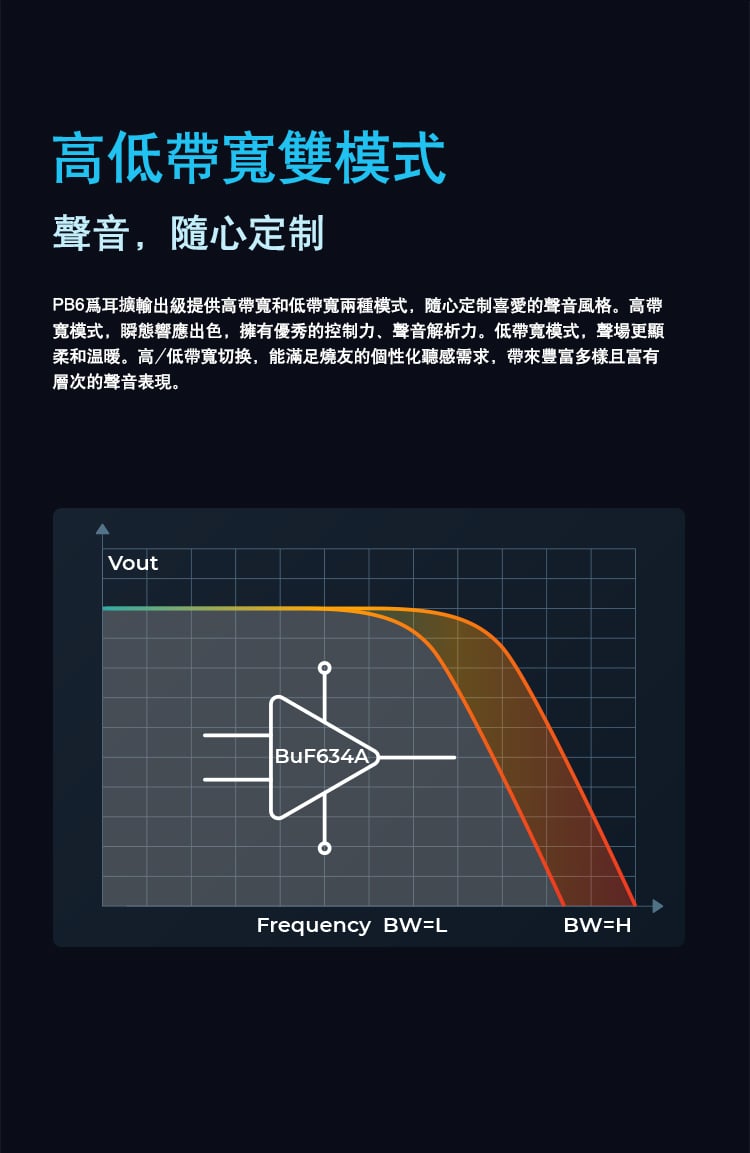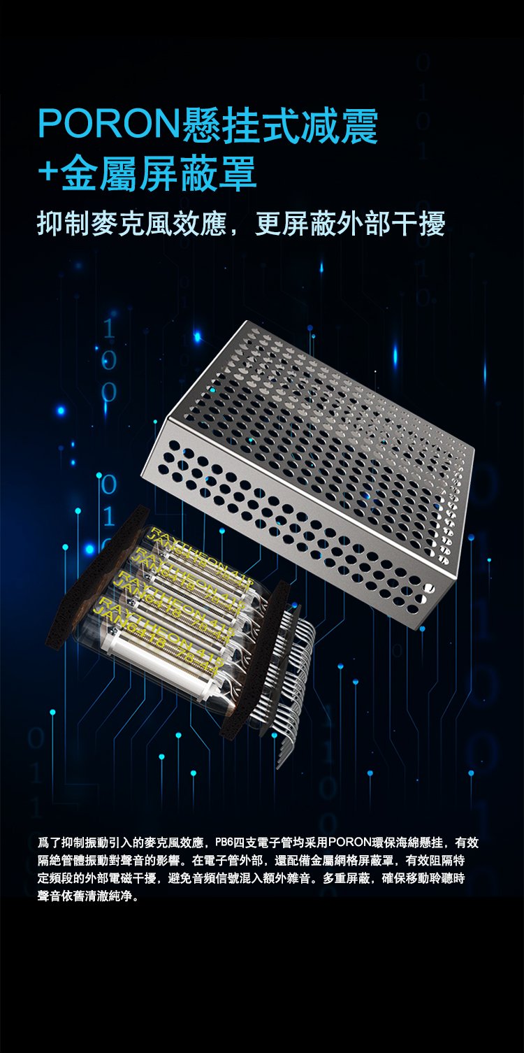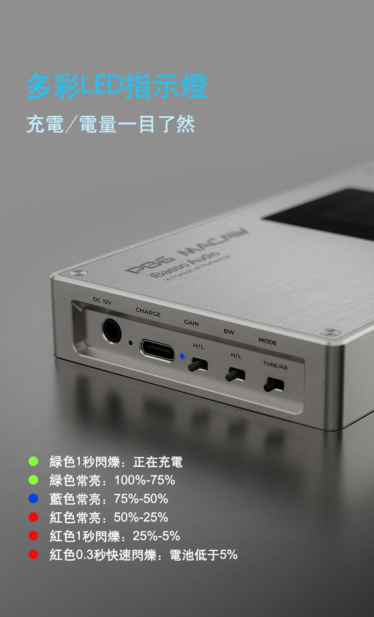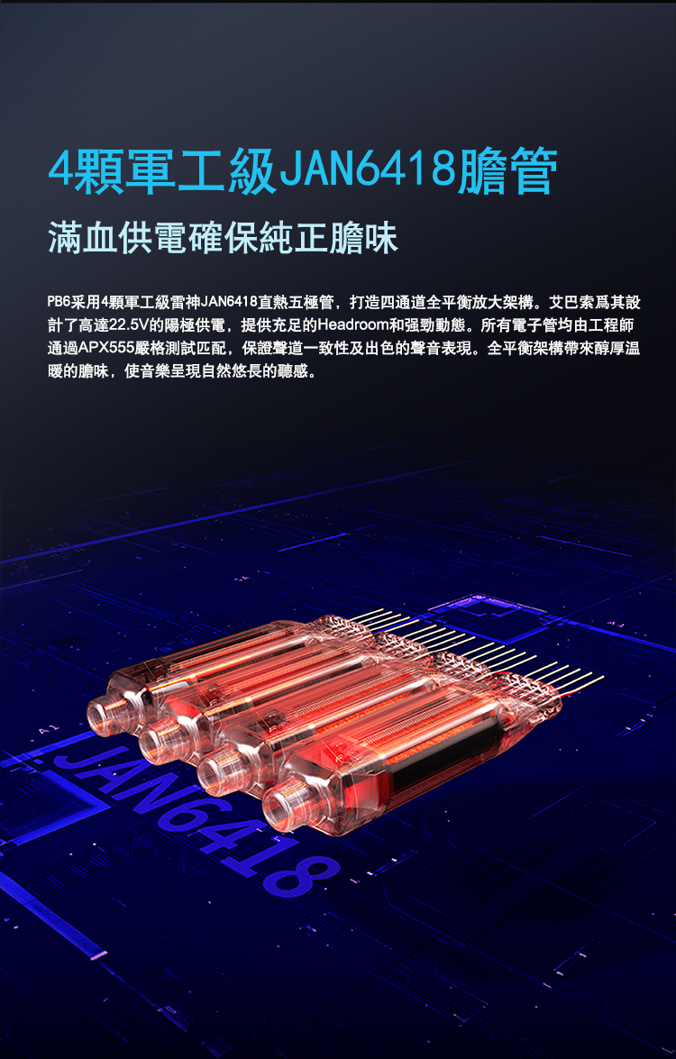 【創新架構,出眾音質 ~ iBasso PB6】 iBasso PB6是一款內置膽管的便攜耳放設備,定位高端市場,具備獨特音色設計。 內置膽管(電子管)設計,提供溫暖音色,支援高解析音訊。 面向追求 “模擬味” 音質的發燒友,延續iBasso在便攜音訊設備領域的技術探索。 iBasso PB6 (四膽管雙模式大推力便攜耳放 ~ 雷神JAN6418 × 4) 建議零售價: HK$3999 早鳥優惠價: HK$3499 特點: 1. 4顆軍工級JAN6418膽管 ~ 滿血供電確保純正膽味 2. TUBE+ Class AB雙輸出模式 ~ 膽管溫潤與運放澎湃,一機兩得 3. 8.4V高壓電池組 ~ 內部高壓供電,純淨動聽 4. 12V DC外接供電 ~ 實現便攜耳放向臺式耳放的音質躍升 5. NJW1195A高精度4通道音量控制器 ~ 模調數控,徹底杜絕聲道不均衡 6. 高低頻寬雙模式 ~ 聲音,隨心定制 7. PORON懸掛式減震+金屬遮罩罩 ~ 抑制麥克風效應,更遮罩外部干擾 8. 奢華用料,卓越配置 ~ 為HiFi級好聲音而生 9. 3.5mm單端+4.4mm平衡輸入/輸出 ~ 全功能介面,讓你玩出花來 10. 多彩LED指示燈,充電/電量一目了然 ==================== 1. 4顆軍工級JAN6418膽管 滿血供電確保純正膽味 PB6 採用4顆軍工級雷神JAN6418直熱五極管,打造四通道全平衡放大架構。艾巴索為其設計了高達22.5V的陽極供電,提供充足的Headroom和強勁動態。所有電子管均由工程師通過APX555嚴格測試匹配,保證聲道一致性及出色的聲音表現。全平衡架構帶來醇厚溫暖的膽味,使音樂呈現自然悠長的聽感。 2. TUBE+ Class AB雙輸出模式 膽管溫潤與運放澎湃,一機兩得 PB6支援TUBE與Class AB雙輸出模式。TUBE模式下,4顆JAN6418作為放大核心,同時由4顆TIBUF634A實現電流放大,帶來細膩醇厚、溫暖順滑的聲音。Class AB模式,採用經典的OP+BUF耳放電路。緩衝電路則採用4顆BUF634A進行電流放大。Class AB模式下解析力飆升,動態充沛。讓PB6滿足你:一款便攜耳放,兩種卓越音色的期待。 3. 8.4V高壓電池組 內部高壓供電,純淨動聽 PB6配備8.4V高壓聚合物電池組,相比于傳統單顆3.7V電池供電的設備,工作電壓擺伏高達16.8V,電源效率和電源瞬態能力大幅提升。大幅降低DC-DC轉換產生的紋波干擾,供電系統更純淨。純淨的電源架構,為音訊信號提供強悍驅動力,聲音細節與動態得以完整展現,遠超其他便攜耳放。 4. 12V DC外接供電 實現便攜耳放向臺式耳放的音質躍升 PB6支持12V DC-IN供電,耳放工作於±12V高電壓下,能瞬間釋放耳放的全部潛能。接入外接電源後,推力高達2300mW+2300mW @32Ω,足以輕鬆推動全尺寸動圈耳機與高阻抗平板耳機,提供沉厚有力的低頻與回應迅捷的瞬態,提升細節和動態,可攜式裝置秒變台機! 5. NJW1195A高精度4通道音量控制器 模調數控,徹底杜絕聲道不均衡 PB6採用高精度4通道音量控制器——NJW1195A,可提供0.5dB步進的精細調節,通過硬體音量調節可以有效降低底噪,擁有漆黑的背景與更強的沉浸感。音量以“模調數控”的方式調節,相比普通碳膜電位器在低音量時的左右聲道失衡,PB6能徹底避免這一問題,確保音量調節過程中左右聲道平衡。 6. 高低頻寬雙模式 聲音,隨心定制 PB6為耳放輸出級提供高頻寬和低頻寬兩種模式,隨心定制喜愛的聲音風格。高頻寬模式,瞬態回應出色,擁有優秀的控制力、聲音解析力。低頻寬模式,聲場更顯柔和溫暖。高/低頻寬切換,能滿足燒友的個性化聽感需求,帶來豐富多樣且富有層次的聲音表現。 7. PORON懸掛式減震+金屬遮罩罩 抑制麥克風效應,更遮罩外部干擾 為了抑制振動引入的麥克風效應,PB6四支電子管均採用PORON環保海綿懸掛,有效隔絕管體振動對聲音的影響。在電子管外部,還配備金屬網格遮罩罩,有效阻隔特定頻段的外部電磁干擾,避免音訊信號混入額外雜音。多重遮罩,確保移動聆聽時聲音依舊清澈純淨。 8. 奢華用料,卓越配置 為HiFi級好聲音而生 PB6整機採用了海量發燒級元器件。包括但不限於——日本松下薄膜電容、高性能POSCAP聚合物鉭電容、AVX高穩定性鉭電容和發燒級黑金剛電解電容等。超規格用料,為好聲音打下堅實基礎,實現更為通透細膩的聲音表現。 9. 3.5mm單端+4.4mm平衡輸入/輸出 全功能介面,讓你玩出花來 PB6不僅提供3.5mm單端與4.4mm平衡輸出,同時還支持單端和平衡雙輸入口。雙介面設計能達成部分創意用法:它讓只帶3.5mm介面的前端設備在連接PB6後,也能實現4.4mm平衡輸出,從而獲得平衡耳放的高解析度和強勁動態。 10. 多彩LED指示燈,充電/電量一目了然 綠色1秒閃爍:正在充電 綠色常亮:100%-75% 藍色常亮:75%-50% 紅色常亮:50%-25% 紅色1秒閃爍:25%-5% 紅色0.3秒快速閃爍:電池低於5% 參數指標: 4.4輸入-4.4輸出 增益:低增益+6dB,高增益+12dB(Class AB模式) 低增益+8dB,高增益+14dB(TUBE模式) 注:3.5輸入4.4輸出會獲得額外+6dB增益 THD+N:-112dB(2V Input 300Ω Load)(Class AB模式) 頻響:10Hz-80kHz -0.1dB(Class AB模式) 15Hz-80kHz -0.5dB(TUBE模式) 動態範圍:125dB(Class AB模式) 116dB(TUBE模式) CrossTalk:135dB(Class AB模式) 100dB(TUBE模式) 最大輸出電平:9.5Vrms(DC-IN) 8.5Vrms(電池供電) 最大輸出功率(THD<1%):2300mW+2300mW@32ohm(DC-IN) 1600mW+1600mW@32ohm(電池供電) 輸出阻抗:1.2Ω 本底雜訊:2.3μV