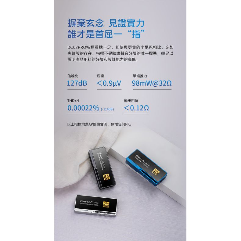 【小尾巴音質代言人 ~ iBasso DC03PRO‼】 #超強性價比 iBasso DC03PRO (旗艦解碼CS43131 x 2) – HK$598 顏色: 黑、銀、藍色 ***現免費贈送: 1. Lighting 去 Type C線 (送完即止) 2. Type C 去 Type C線 (內盒已附送) 特點: 1. 雙CS43131旗艦DAC 2. 日本KDS飛秒晶振 3. 信噪比: 127dB 4. THD+N: -114dB 5. 輸出阻抗<0.12Ω 6. 推力98mW@32Ω 7. 底噪低至0.9μV 8. 多功能配套APK 9. 3.5mm身歷聲介面 10. 獨立音量按鍵 11. 鋁合金CNC外殼 12. 雙面鋼化玻璃面板 網店: https://bit.ly/3WNmhCN 接受八達通App/ 支付寶/ 微信支付/ 信用卡/ Atome (3 個月免息分期)/ 銀聯/ PayPal/ 銀行轉帳/ 轉數快 =============== 1. 雙CS43131旗艦DAC ~ PRO不負其名 大獲好評的Cirrus Logic CS43131在DC03PRO上重新回歸,作為搭載Master HiFiT™技術的旗艦DAC,指標出色,聽感卓越。艾巴索是最早將雙CS43131應用於小尾巴的品牌之一,對這款晶片調校得心應手,見解獨到。我們在前代基礎上百尺竿頭更進一步,最終帶來重磅升級之作——DC03PRO。 2. 日本KDS飛秒晶振 ~ 顯著提升時鐘準確性 DC03PRO加入了全球三大晶振製造商之一KDS (日本大真空)旗下的飛秒晶振,大幅降低相位抖動,提升數位時鐘準確性。更好的數位音訊系統,帶來純淨通透的聽感。 3. 底噪達到納伏級 ~ 趨近於零純淨通透 在AP實測中,DC03PRO底噪小於0.9uV (900nV),在同類產品中一枝獨秀。獨特的底噪控制,令DC03PRO擁有純淨的聲底。音樂中每個動人的旋律與音符,宛如在漆黑的巨幕中呈現。 *底噪小知識:一般播放機和小尾巴的底噪值在3-10uV之間。 4. 摒棄玄念 見證實力 ~ 誰才是首屈一“指” DC03PRO指標看點十足,即使與更貴的小尾巴相比,宛如尖峰般的存在。指標不是驗證聲音好壞的唯一標準,卻足以說明產品用料的好壞和設計能力的高低。 信噪比 ~ 127dB 底噪 ~ <0.9μV 單端推力 ~ 98mW@32Ω THD+N ~ 0.00022% (-114dB) 輸出阻抗 ~ 0.12Ω 以上指標均為AP整機實測,無懼任何PK。 不對比 無高低 主流千元播放機/ 同價位單端小尾巴/ DC03PRO DAC: ES9018Q2M/ES9218 ES9281/ES9038Q2M √CS43131*2 信噪比 約為120dB 約為114dB √127dB THD+N: 約為0.004% 約為0.0005% √0.00022% 底噪: 5μV左右 / √0.9μV 單端推力: 60mW@32Ω 45mW@32Ω √98mW@32Ω 輸出阻抗: 5Ω左右 2Ω √0.12Ω 線上流媒體: 不支持 支持 √支持 可換線設計: / 不支持 √支持 5. 新版配套APK ~ 實用功能已就位 iBasso UAC軟體全面升級,配合DC03PRO使用。 100級 ~ 硬體音量調節 5種 ~ 可選數位濾波 3檔 ~ 高中低增益 2種 ~ 可選輸出模式 20級 ~ 聲音平衡調節 6. 更低能耗 更小負擔 ~ 讓好聽長長久久 手機續航焦慮已成普遍之勢。如何在保證音質水準的同時,讓續航沒煩惱? DC03PRO採用業內領先的電源管理IC晶片,智慧控制功耗,並通過同步整流電源技術,將“好鋼用在刀尖上”。 相比業內小尾巴動輒600mW以上功耗,DC03PRO功耗相比前者降低36%以上。享受手機HiFi好音質,就要長長久久! 功耗低至380mW 7. 一體成型 鏤空工藝 ~ 雙面玻璃潮流多色 DC03PRO外殼由整塊鋁合金CNC加工而成,採用工藝複雜的鏤空設計,加工難度高。雙面鋼化玻璃面板,外觀硬朗,棱角分明,精緻感與時尚感拉滿。銀色、槍色、藍色多彩配色,典雅耐看,愉悅感官。加入音量控制按鈕,操作體驗更便捷。 6次 ~ CNC複合加工 8道 ~ 高難度工序 鏤空 ~ 精妙外觀設計 陶瓷噴砂 ~ 外殼精細處理 2顆 ~ 實體音量按鈕 雙面 ~ 鋼化玻璃面板 8. 3.5mm身歷聲輸出 ~ 手機化身HiFi播放機 手機方便性不言而喻,耳機口的消失卻讓人惋惜。DC03PRO為習慣手機聽音樂、對音質不妥協的HiFi燒友而生,3.5mm通用介面,相容性出眾,方便又好聽。 9. 可換線設計 ~ 搭什麼設備任你挑 DC03PRO採用可換線設計,標配Type-C to Type-C線材,安卓設備直接使用。更換Type-C to Lightning線材,即可在iOS設備上體驗HiFi好聲音。 *上圖為CB18,非標配線材,CB18及C to L連接線需單獨購買。 10. 多彩LED指示燈 播放模式一目了然 不同模式的指示色 紅色: 連接不播放 藍色: DSD模式 綠色: PCM模式 11. 不僅是聽歌神器 ~ 也適合觀影遊戲 HiFi之餘,何妨來一局遊戲?更清晰的聽聲辯位,在遊戲裡所向披靡;全方位提升電影音效,沉浸式娛樂體驗。 *圖片僅為展示,C to L連接線非標配,需單獨購買。 12. 手機電腦平板均相容 ~ 全場景適用滿足所需 相容市面上的大部分安卓手機和平板,更能連接PC和MAC,化身USB DAC,一機多用更超值。 13. 操作介紹 DC03PRO在Android5.1以上系統的安卓設備上隨插即用(受設備系統或者硬體影響,在極少數安卓設備上可能存在相容性差異)。為了體驗DC03PRO的全部功能,建議您安裝艾巴索解碼耳放線專屬安卓APK——iBasso UAC,既能實現精細的音量調節,還可以更換濾波與聲道平衡設置。某些型號的安卓設備,可能需要手動在系統設置裡打開OTG功能。配合手機使用時,最高支持PCM 32bit/384kHz及Native DSD256輸出。 iPhone手機的音量調節只有16級。DC03PRO可通過音量按鍵實現100級的音量調整。配合iPhone使用可以實現音量精細調節。 產品配件 DC03PRO,Type-C to Type-C連接線,Type-C轉Type-A轉換頭,簡易說明書。 參數指標 DAC晶片:Cirrus Logic CS43131*2 THD+N: -114dB (300Ω load) -111dB (32Ω load) 輸出電平:2Vrms (300Ω load) 1.77Vrms (32Ω load) 信噪比:127dB 頻率回應:20Hz~40kHz +/-0.5dB 底噪:<0.9μV 輸出抗阻:<0.12Ω PCM:最高32bit/384kHz DSD:最高Native DSD 256x 重量:10.5g 尺寸:49.4*21*8mm
