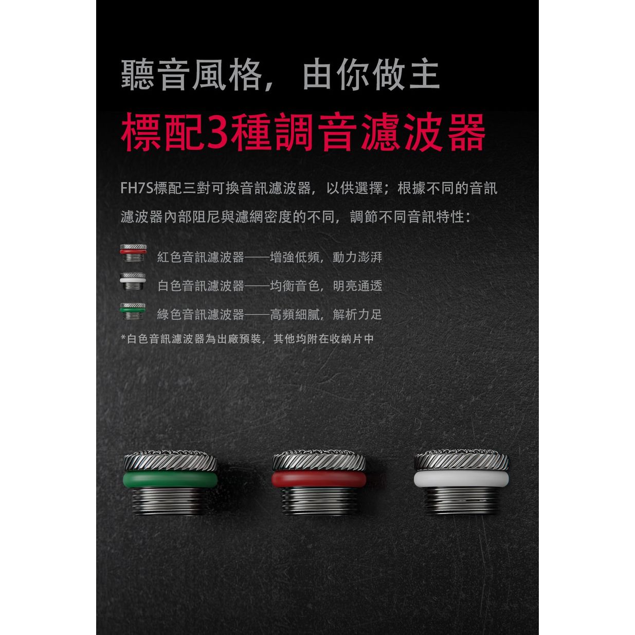 【年度壓軸 ~ FiiO FH7S ~ 機甲鱗 の 圈鐵】 自FH5S龍鱗 ~ 大受好評後 “它將成為4K內最受歡迎的高顏值耳機之一” “它將成為4K內最能打的實力派耳機之一” “它將成為4K內最具競爭力的圈鐵耳機之一” “......” “它”究竟如何,現在就來一起認識!!! 01.FH7S萃取FH9高端技術精華,量身打造一圈四鐵聲學架構 02.搭載第二代FiiO 自研低頻動圈,13.6mm大尺寸DLC振膜單元 03.中頻採用FiiO 聯合樓氏定制的DFK複合單元,人聲演繹更具韻味 04.高頻採用樓氏SWFK-31736複合動鐵單元,好的高頻的解析力與空氣感 優秀的臨場感,讓音符穿梭於空氣之間 琴瑟悠揚,宛若臨場,FH7S採用全新的第二代半開放式聲學後腔體,基於FiiO 前後腔平衡洩壓技術,不僅有效平衡腔內氣壓,消除耳膜壓迫感,同時,聲音的表現更為柔和自然,聲場廣闊,恢弘篇章近在眼前。 0.4mm的愉悅, 全新的FiiO 矽膠耳機套 全新的FiiO 矽膠耳機套將在FH7S上首次登場,對於細節的把握是FiiO 不懈的追求,甄選優質矽膠材質,不僅擁有柔軟親膚、抗拉性強的特點,更是在實際成品上,耳機套傘邊僅為0.4mm厚度,根源上解決佩戴漲耳的問題。 線材大跨越,聽感再升級 FH7S標配了一條8股152芯單晶銅鍍銀耳機線,每股19支線芯,並採用單支絕緣處理,音頻插頭升級為直插旋鎖可換插頭,並標配3.5/4.4mm音頻插頭。 ==================== FiiO FH7S (一圈四鐵五單元耳機) 機甲鱗 の 圈鐵 – HK$3688 一圈四鐵聲學架構/ 13.6mm大尺寸DLC振膜單元/ 樓氏定制四動鐵單元/ 科幻鱗甲造型設計/ 獨特的陷波聲學濾波技術/ 第二代半開放式聲學後腔體/ 8股152芯單晶銅鍍銀耳機線/ 全新的FiiO 矽膠耳機套/ 標配3種調音濾波器/ S.TURBO聲學濾波專利技術/ 直插旋鎖式可換音訊接頭 推薦購買理由: 1. 一圈四鐵聲學架構 ~ 高端配置拉滿,性能時刻線上 2. 13.6mm大尺寸DLC振膜單元 ~ 第二代自研動圈,澎湃之選 3. 樓氏定制四動鐵單元 ~ 獨家定制,探索中高頻聲韻之美 4. 陷波聲學濾波技術 ~ 有效抑制齒音,還原通透明亮好聲音 5. 第二代半開放式聲學後腔體 ~ 聲音自然悠揚,宛如臨場傾聽 6. CNC加工鋁合金腔體 ~ 優選材質,品質工藝 7. 8股152芯單晶銅鍍銀耳機線 ~ 更多線芯,傳遞純淨好聲音 8. 全新FiiO 矽膠耳機套HS18 ~ 標配SML三種規格,傘邊僅為0.4mm ==================== 1. 一圈四鐵 ~ 值得 7 待 01.FH7S萃取FH9高端技術精華,量身打造一圈四鐵聲學架構 02.搭載第二代FiiO 自研低頻動圈,13.6mm大尺寸DLC振膜單元 03.中頻採用FiiO 聯合樓氏定制的DFK複合單元,人聲演繹更具韻味 04.高頻採用樓氏SWFK-31736複合動鐵單元,帶來優秀的解析 力與空氣感 2. 高端技術下放 ~ 13.6mm大尺寸DLC振膜動圈單元 FH7S搭載高端耳機FH9相同的第二代FiiO 自研低頻動圈單元,單元口徑高達13.6mm,更大的口徑能量轉換效率更高,在動圈單元發聲時,聲音的表現更自然扎實,並且,13.6mm單元口徑能夠帶來更低的下限頻率,讓聲音的下潛更為深入,從容應對低頻回應。 同時,FH7S的振膜球頂部分採用了DLC類鑽石材質,高阻尼、高剛性、輕品質的物理特性,能夠提供更快的瞬態回應,讓低頻的演繹更為澎湃,鼓點深入人心。 3. 聆聽細膩人聲 ~ 獨家定制樓氏四單元動鐵 基於人聲部分主要在中頻區間,為了實現更具韻味的人聲表現,FiiO 與樓氏強強聯手,為FH7S獨家定制出DFK中頻複合單元,通過改變中頻單元的透氣量,能夠有效減少與低頻單元的重疊部分,讓人聲更為清澈,音色更具韻味。 同時,為了讓高品質音訊更為細膩,高頻部分採用了樓氏 SWFK-31736複合動鐵單元,該單元具有諧振頻率高的特性, 提供更好的高頻解析力與空氣感,有效提升橫向聲場。 4. 科幻鱗甲造型設計 ~ 佩戴舒適,內外兼修 FH7S採用了全新的科幻鱗甲造型 ,在耳機面蓋上,巧妙地設計出斜線陣列的半開放鏤孔,嵌以銀金色的飾片與導氣網,能夠實現設計美學與聲學的平衡,層層相疊、鱗次櫛比;同時,在FH7S鋁合金殼體的人耳接觸面部分,保留了貼而人耳的圓潤設計,在開啟硬朗機甲風格的同時,讓舒適的佩戴體驗,時刻線上。 5. 消除齒音,還原靚麗聲線 ~ 獨特的陷波聲學濾波技術 聲學團隊通過有限元模擬模擬技術,經過無數次實驗,引導聲波在腔內傳播路徑,為FH7S量身打造出獨特的陷波聲學濾波技術,能夠有效消除腔體、音管以及耳道所產生的諧波共振,讓高頻的延展性更好,聲音亮而不刺,同時,能夠有效抑制齒音的產生。 6. 現場,近在眼前 ~ 第二代半開放式聲學後腔體 FH7S採用了全新的第二代半開放式聲學後腔體,能夠還原真實聲場,通過FiiO 前後腔平衡泄壓技術,讓腔內氣壓達到平衡,在發聲單元在推動空氣時,所遇空氣阻力更小,讓聲音的擴散與傳播更為順滑,音色表現柔和自然,聲場空間寬廣,精准還原每一處聲域定位。 同時,能夠有效地消除耳膜壓迫感,久戴不累,讓聆聽更為輕鬆舒適;舞臺,宛若眼前。 7. 線材大升級, 聲音新體驗~ 8股152芯單晶銅鍍銀耳機線 FH7S標配一條8股152芯單晶銅鍍銀耳機線,每股19支線芯,並採用單支絕緣處理;採用里茲結構編絞,基於趨膚效應與鄰近效應原理,增加電流通過導體表面積,減少渦流損耗,提高高頻解析力。 8. 應用廣泛,直插旋鎖式可換音訊插頭 FH7S相較於FH7,採用了直插旋鎖式可換音訊插頭,可根據自身播放機介面更換3.5mm單端/4.4mm平衡音訊插頭,可應用於多種音訊插頭,聆聽豐富多彩的世界之聲。 *可換音訊插頭專利經FABRILOUS授權使用 9. 來自0.4mm的舒適 ~ FiiO 全新矽膠耳機套