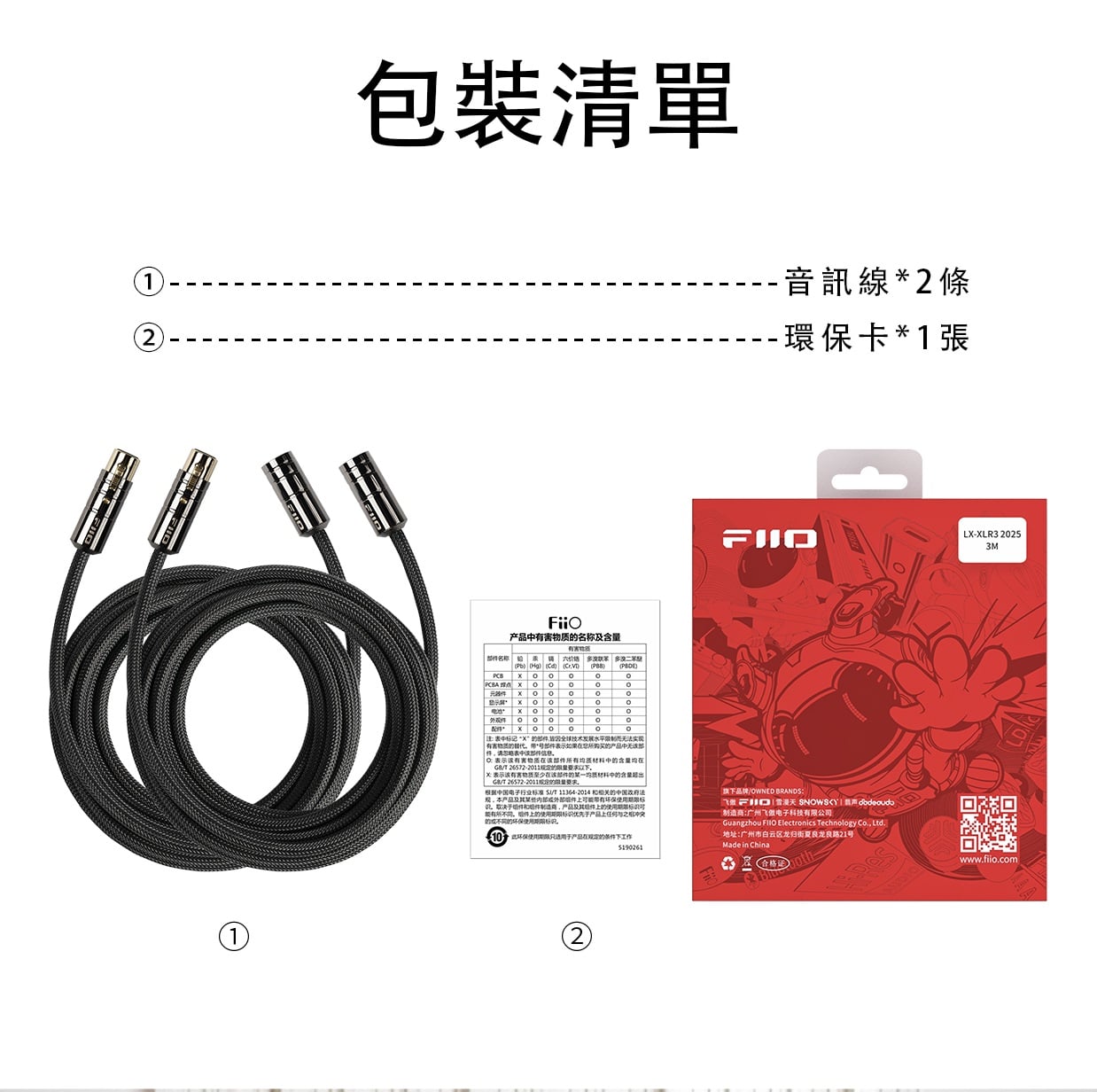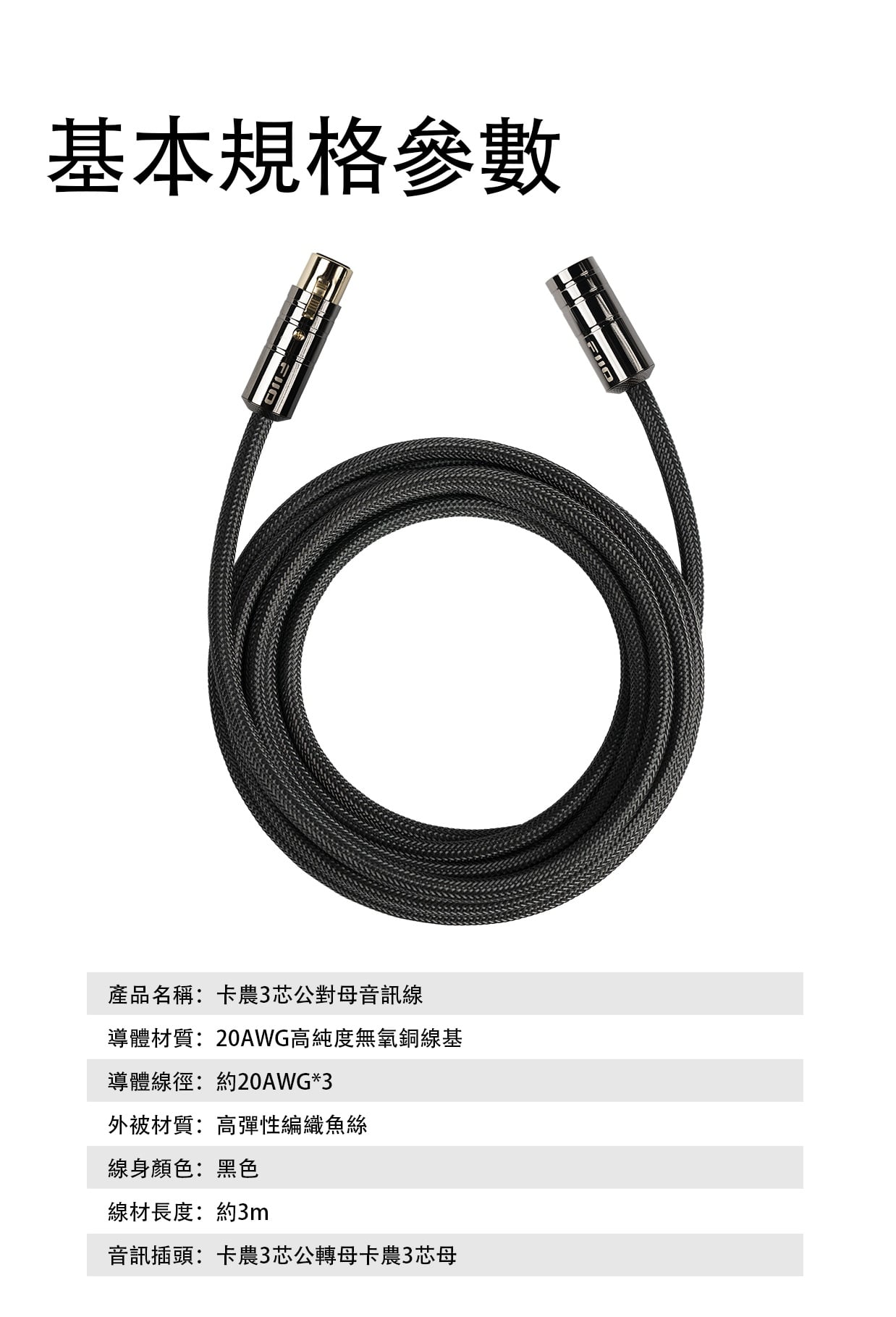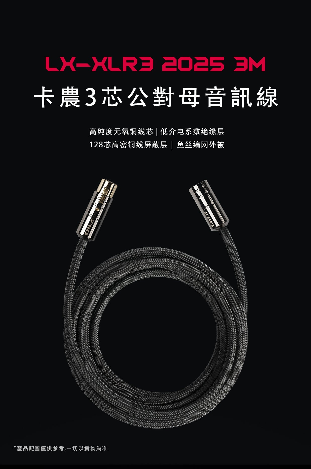 【FiiO XLR卡農3芯公對母音訊線 ~ LX-XLR3 2025 3M*2條】 FiiO LX-XLR3 2025 3M*2條 (卡農3芯公對母音訊線) 建議零售價: HK$899 特點: 1. 高純度無氧銅線芯 2. 低介電係數絕緣層 3. 128芯高密銅線遮罩層 4. 魚絲編網外被 官方定制: 1. 層層用心 2. 高純度無氧銅 3. PE絕緣層 4. 填充層 5. 銅遮罩層 6. 外被PEC 7. 漁網編織 1. 至純聲境 高純度無氧銅線芯 LX-XLR3 2025 3M採用的高純度無氧銅,含氧度嚴格控制在10ppm以下。低雜質的導體能有效減少電子散射,提升電子遷移率,最大程度保留信號純淨度,從而使音樂信號的高頻細節、低頻動態和人聲質感得以完整呈 2. 質素可靠 20AWG線徑 單股20AWG的粗線徑,賦予線材更強大的電流承載能力和卓越的抗干擾性能;無氧銅線芯單支直徑為0.15mm,保證晶體結構的完整與均勻性,有效減少了信號傳輸中的相位偏差,從而使聲音定位更為準確、樂器和人聲層次清晰分離,仿佛置身錄音現場。 3. 強效屏障 低介電係數絕緣層 LX-XLR3 2025 3M選用介電係數僅有2.25的PE(聚乙烯)作為核心絕緣層。這種材料有著優良的介電強度,能顯著減少因介質極化產生的能量損失,高頻細節不再易丟失;避免聲音的相位偏移和錯亂,提升了身歷聲的分離度;有效降低線間電容,避免信號被“拖慢”或產生不必要的雜音。從而,絕緣層能夠達到減少音訊信號失真、提升傳輸穩定性,準確還原音訊的效果。 4. 360°防護 128芯高密銅線遮罩層 飛傲不惜成本,將多達128芯的高導電性銅線進行細密編排,構建360度全面包裹的高覆蓋遮罩牆。在多聲道或舞臺系統下,它能有效阻擋周圍電源線、電器設備等產生的外部雜訊入侵,確保音訊信號免受干擾,保證各路信號的相互獨立和清晰。有了這層堅實的防護,您的信號傳輸將始終保持專業級的純淨與穩定。 5. 堅固耐久 魚絲編織外被 外被為高彈性魚絲線編織而成,具有極強的韌性和抗拉伸性。編網結構緊密,擁有出色的耐彎折和抗磨損特性。即使在頻繁插拔的舞臺環境下,也能保證長期使用不易斷絲、開裂,大大延長了線材的使用壽命。與普通尼龍編網相比,魚絲外被手感更佳,不易起球,日常清潔維護也更加方便。 6. 多元應用場景 適配日常/專業設備 LX-XLR3可連接麥克風、調音台、影音器材、舞臺設備等,在高保真音訊場景和舞臺環境下有效消除外部的雜訊和干擾。無論是專業的錄音棚,還是家庭影音系統,它都能完美勝任。 麥克風 調音台 影音器材 舞臺設備 卡儂母頭 卡儂公頭 基本規格參數 產品名稱:卡農3芯公對母音訊線 導體材質:20AWG高純度無氧銅線基 導體線徑:約20AWG*3 外被材質:高彈性編織魚絲 線身顏色:黑色 線材長度:約3m 音訊插頭:卡農3芯公轉母卡農3芯母 包裝清單 ①--------------------------------------音訊線*2條 ②--------------------------------------環保卡*1張