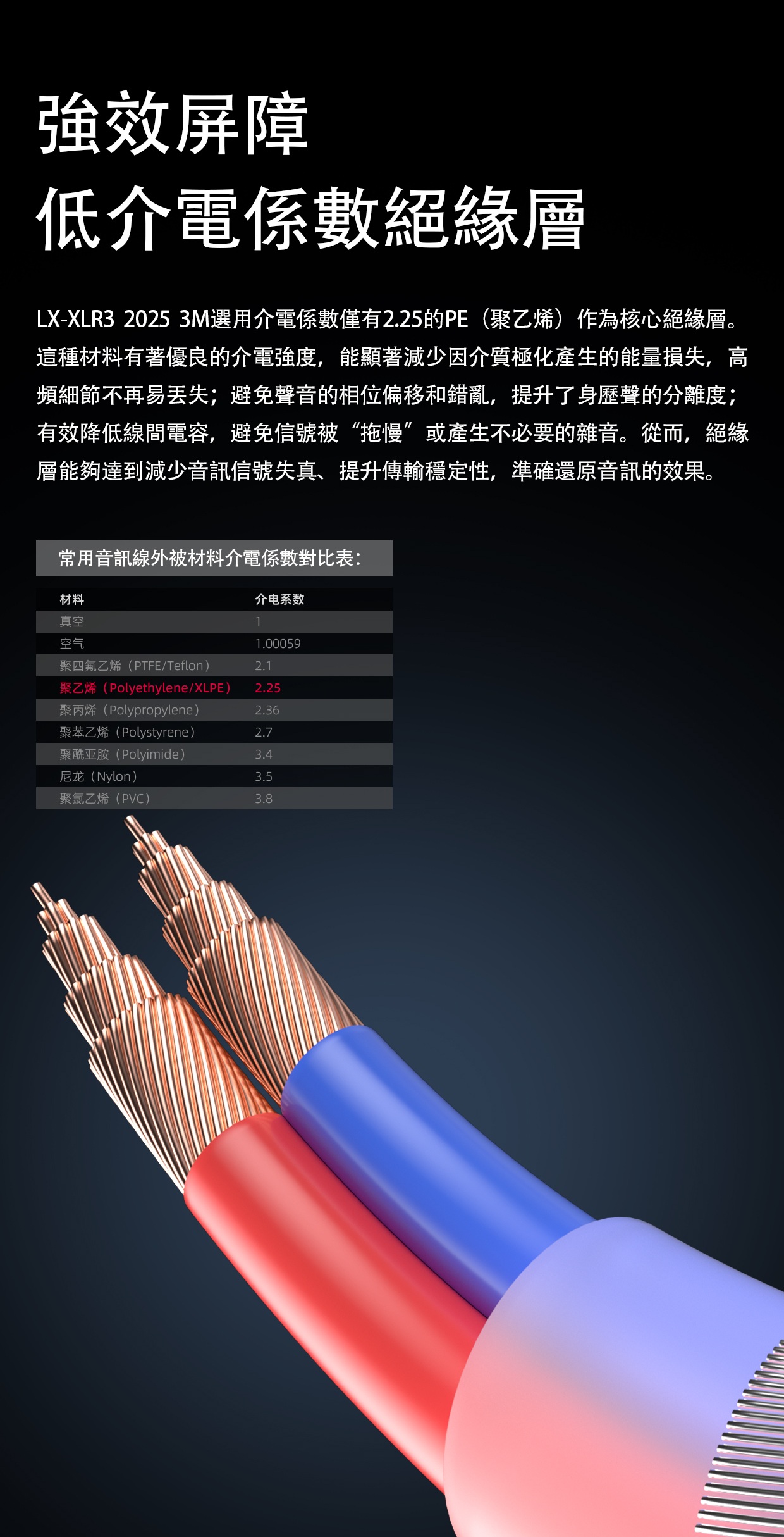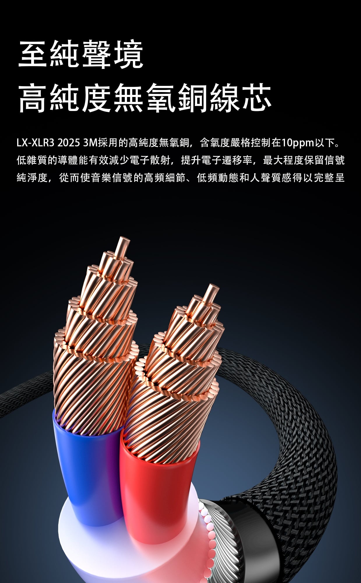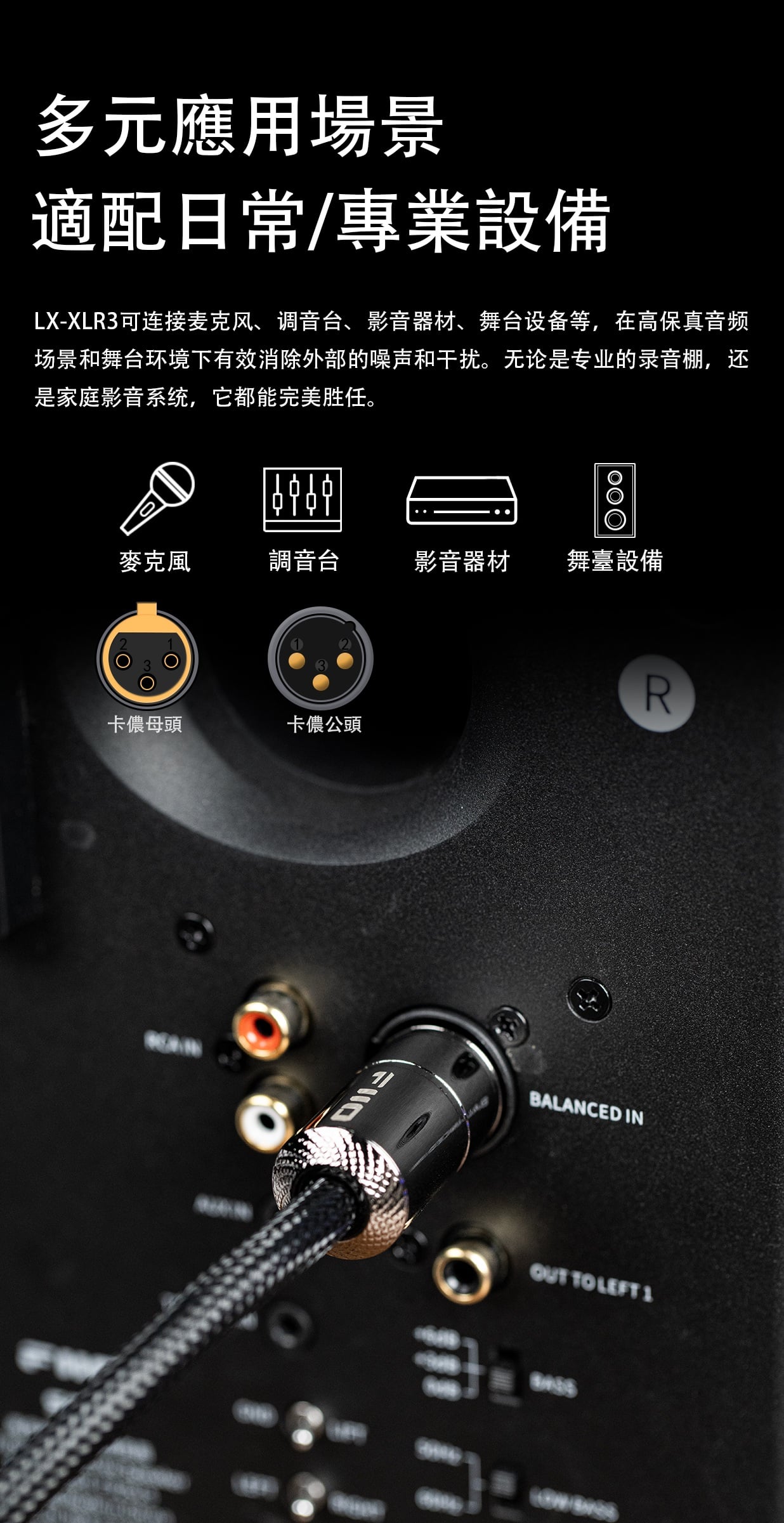【FiiO XLR卡農3芯公對母音訊線 ~ LX-XLR3 2025 3M*2條】 FiiO LX-XLR3 2025 3M*2條 (卡農3芯公對母音訊線) 建議零售價: HK$899 特點: 1. 高純度無氧銅線芯 2. 低介電係數絕緣層 3. 128芯高密銅線遮罩層 4. 魚絲編網外被 官方定制: 1. 層層用心 2. 高純度無氧銅 3. PE絕緣層 4. 填充層 5. 銅遮罩層 6. 外被PEC 7. 漁網編織 1. 至純聲境 高純度無氧銅線芯 LX-XLR3 2025 3M採用的高純度無氧銅,含氧度嚴格控制在10ppm以下。低雜質的導體能有效減少電子散射,提升電子遷移率,最大程度保留信號純淨度,從而使音樂信號的高頻細節、低頻動態和人聲質感得以完整呈 2. 質素可靠 20AWG線徑 單股20AWG的粗線徑,賦予線材更強大的電流承載能力和卓越的抗干擾性能;無氧銅線芯單支直徑為0.15mm,保證晶體結構的完整與均勻性,有效減少了信號傳輸中的相位偏差,從而使聲音定位更為準確、樂器和人聲層次清晰分離,仿佛置身錄音現場。 3. 強效屏障 低介電係數絕緣層 LX-XLR3 2025 3M選用介電係數僅有2.25的PE(聚乙烯)作為核心絕緣層。這種材料有著優良的介電強度,能顯著減少因介質極化產生的能量損失,高頻細節不再易丟失;避免聲音的相位偏移和錯亂,提升了身歷聲的分離度;有效降低線間電容,避免信號被“拖慢”或產生不必要的雜音。從而,絕緣層能夠達到減少音訊信號失真、提升傳輸穩定性,準確還原音訊的效果。 4. 360°防護 128芯高密銅線遮罩層 飛傲不惜成本,將多達128芯的高導電性銅線進行細密編排,構建360度全面包裹的高覆蓋遮罩牆。在多聲道或舞臺系統下,它能有效阻擋周圍電源線、電器設備等產生的外部雜訊入侵,確保音訊信號免受干擾,保證各路信號的相互獨立和清晰。有了這層堅實的防護,您的信號傳輸將始終保持專業級的純淨與穩定。 5. 堅固耐久 魚絲編織外被 外被為高彈性魚絲線編織而成,具有極強的韌性和抗拉伸性。編網結構緊密,擁有出色的耐彎折和抗磨損特性。即使在頻繁插拔的舞臺環境下,也能保證長期使用不易斷絲、開裂,大大延長了線材的使用壽命。與普通尼龍編網相比,魚絲外被手感更佳,不易起球,日常清潔維護也更加方便。 6. 多元應用場景 適配日常/專業設備 LX-XLR3可連接麥克風、調音台、影音器材、舞臺設備等,在高保真音訊場景和舞臺環境下有效消除外部的雜訊和干擾。無論是專業的錄音棚,還是家庭影音系統,它都能完美勝任。 麥克風 調音台 影音器材 舞臺設備 卡儂母頭 卡儂公頭 基本規格參數 產品名稱:卡農3芯公對母音訊線 導體材質:20AWG高純度無氧銅線基 導體線徑:約20AWG*3 外被材質:高彈性編織魚絲 線身顏色:黑色 線材長度:約3m 音訊插頭:卡農3芯公轉母卡農3芯母 包裝清單 ①--------------------------------------音訊線*2條 ②--------------------------------------環保卡*1張